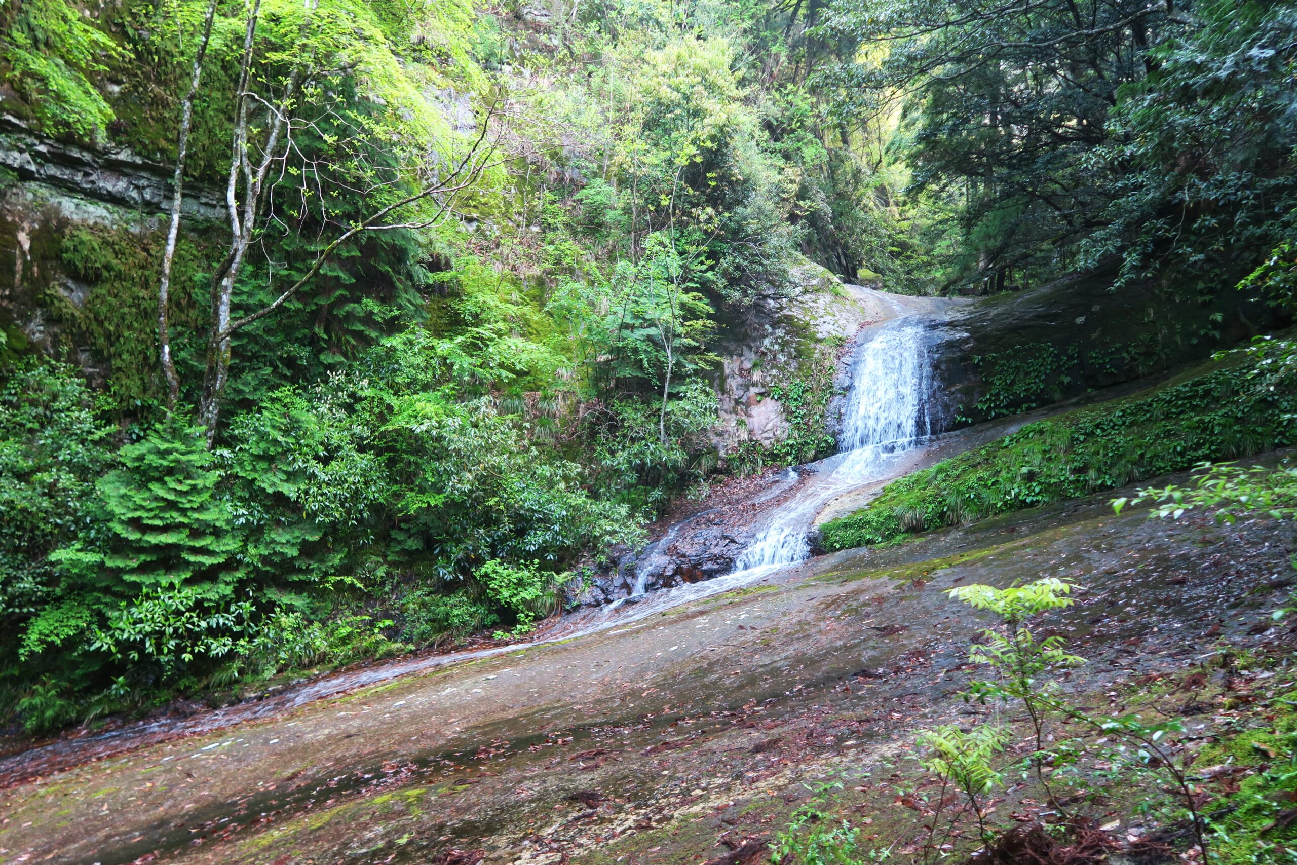 林道から「妙吉祥龍穴」という案内板を目印にして、山道の脇道に入り階段を下りていくと、清らかな水の音が聞こえてきます。下りていくにつれ神聖なひんやりとした空気のなかに凛とした静粛な「気」が肌に感じられます。