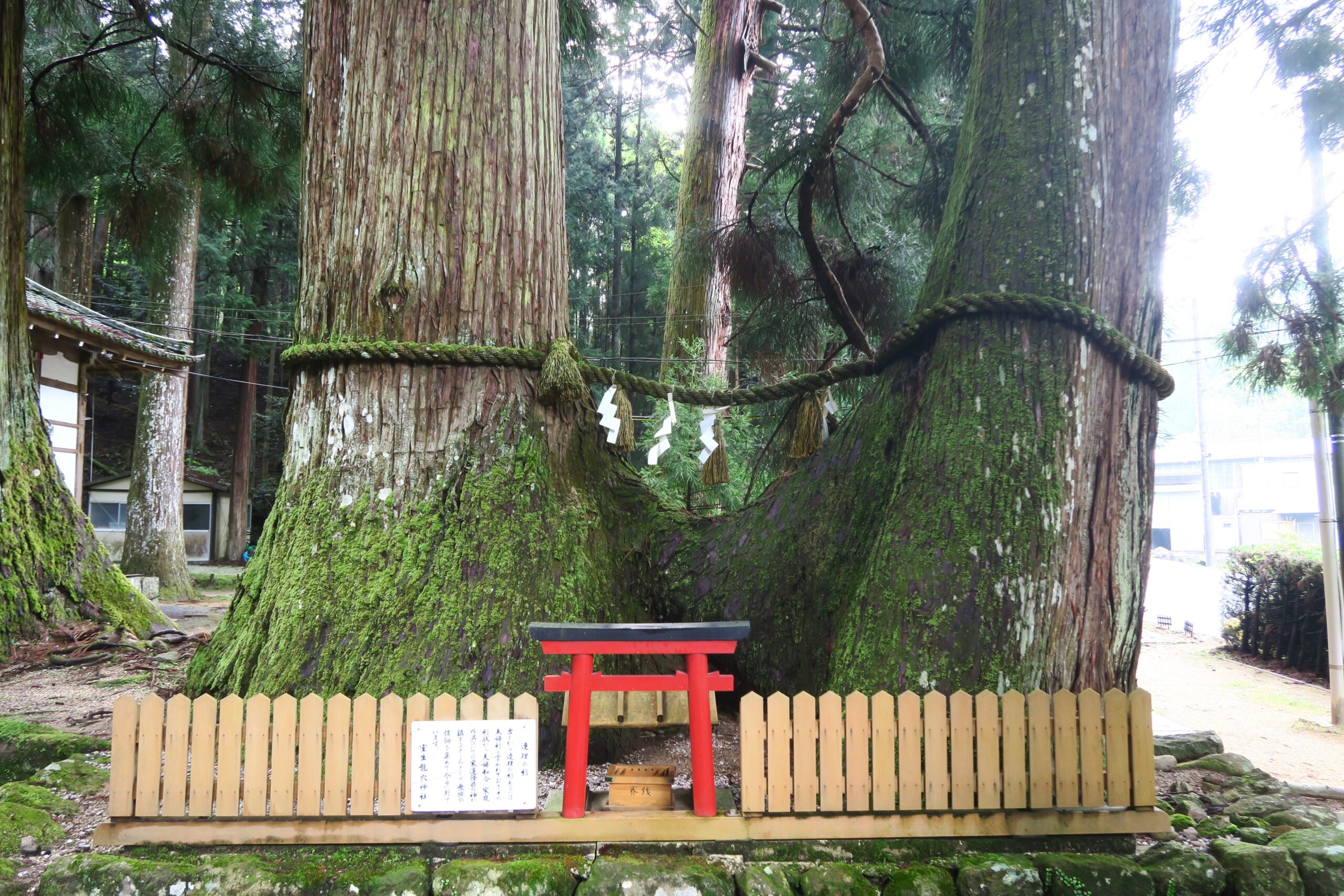 境内には2本の杉の木が根元のほうで一体化している「連理の杉」があり、「夫婦杉」ともいわれます。その形状から夫婦和合、家庭円満、ひいては家運隆盛の御利益があるとして人々の信仰を集めています。