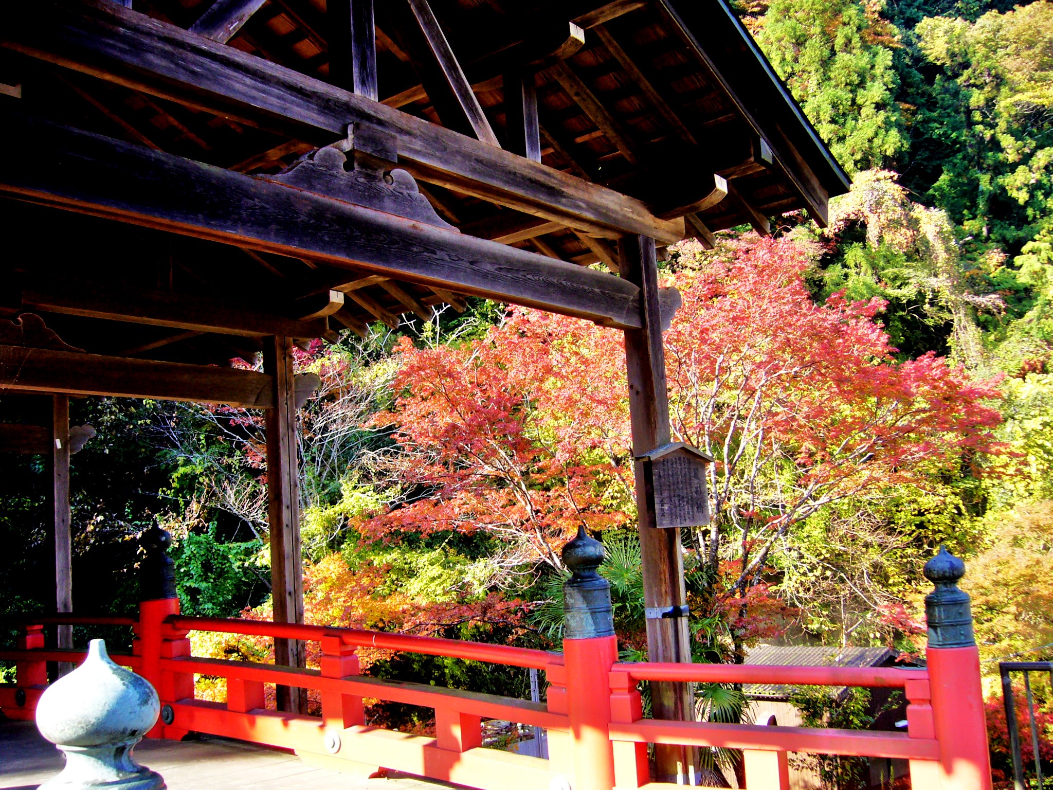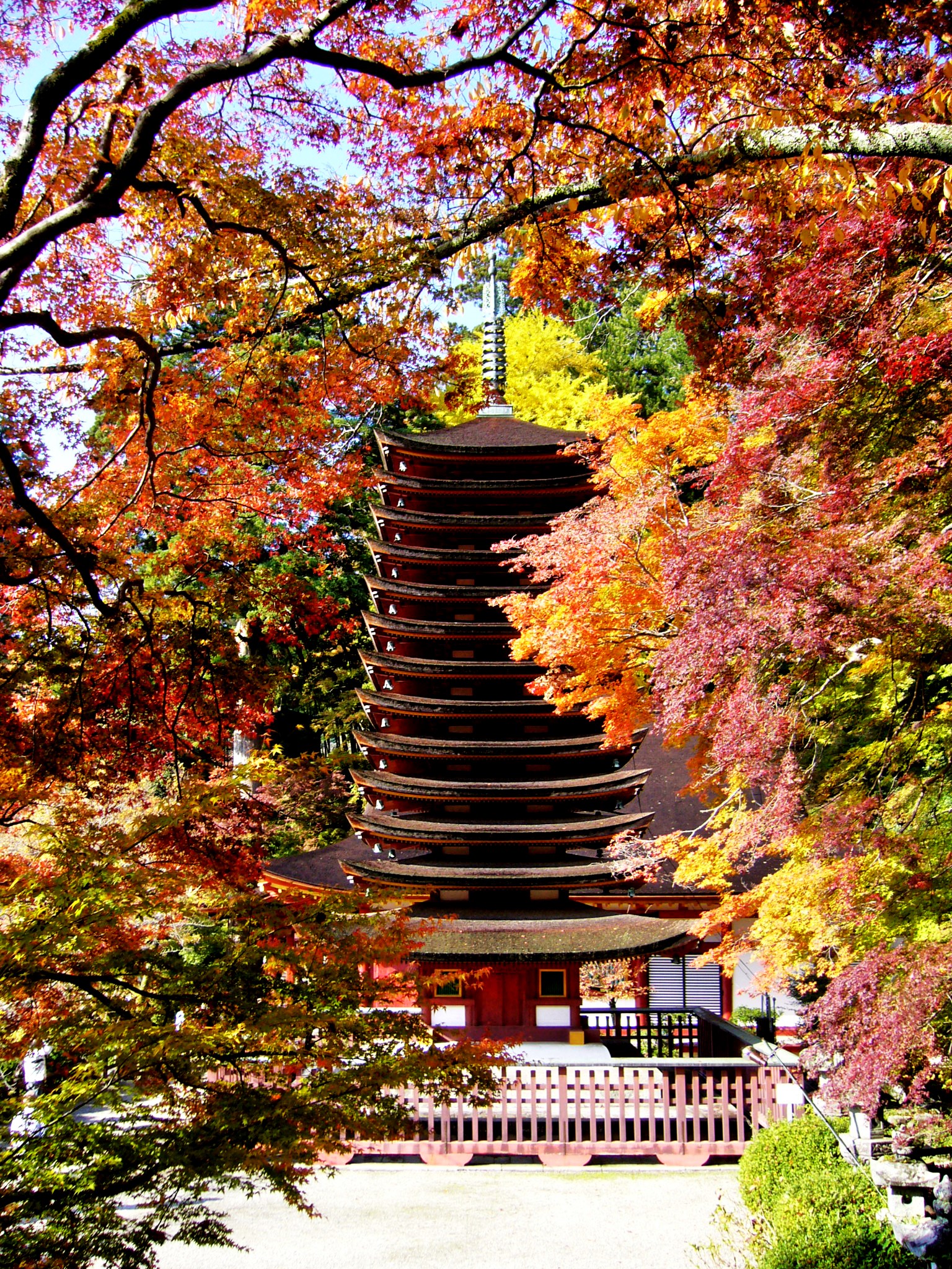 奈良大和路きっての紅葉スポットで、「日本絶景紅葉百選」に選ばれており、朱塗りの社殿群と競い合うように約3000本ものカエデが赤く燃え立つ様子は、雅やかである。葉が普通より小さいため、色濃く繊細なのが談山神社の紅葉の特徴で、藤原道香が「ちしほにも なほひとしほの 色そえて ゆふ日かがやく 峰のもみじば」と唄っているほどです。