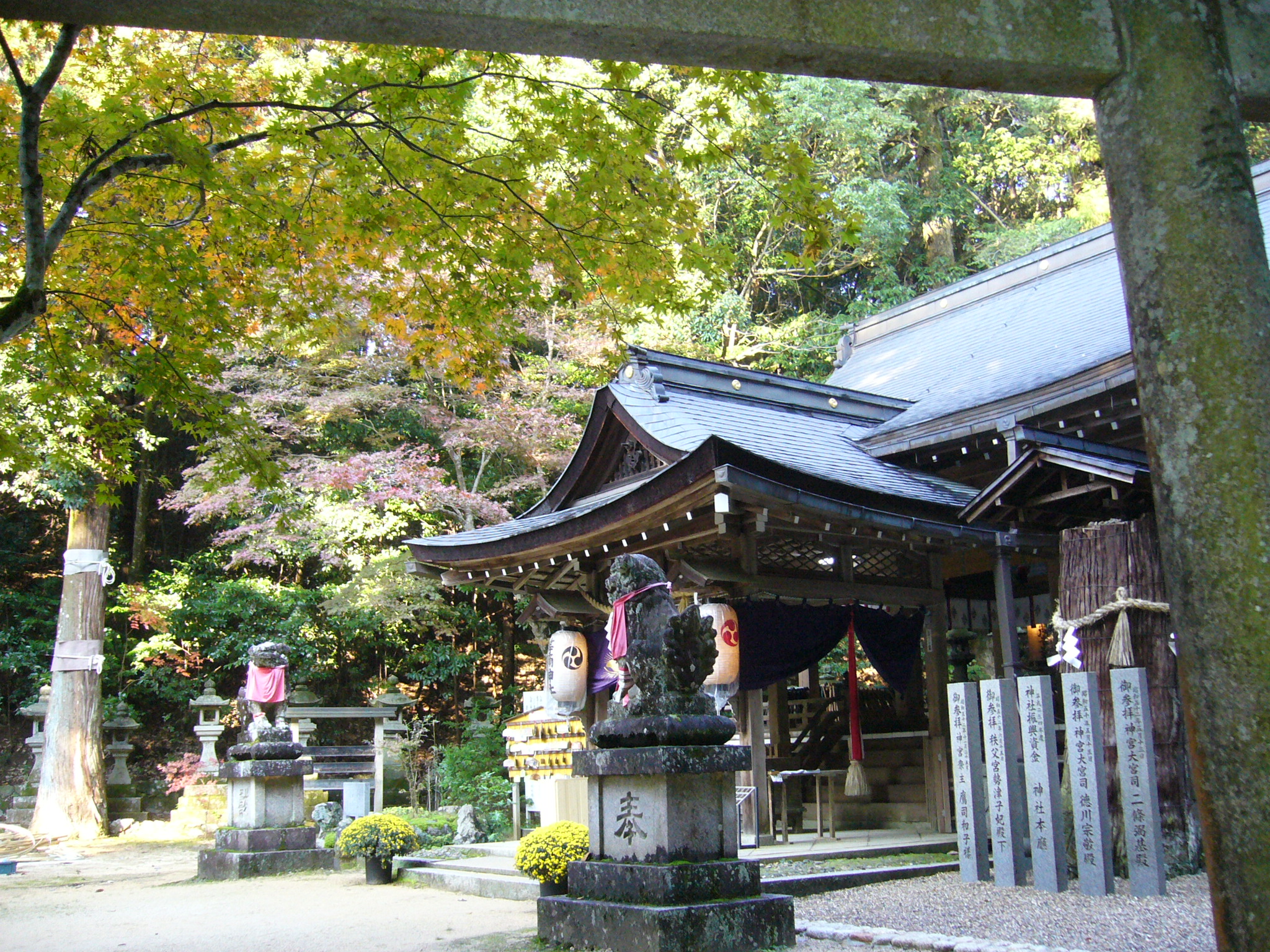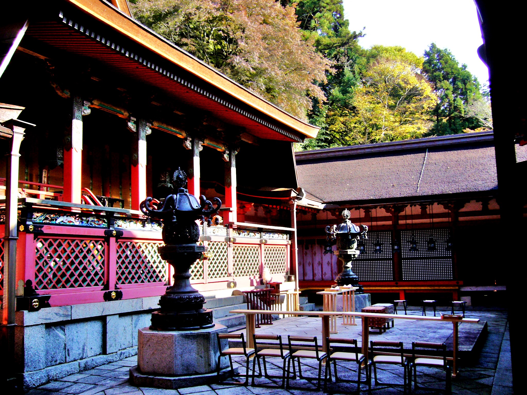 藤原鎌足を祀る日光東照宮の手本となった絢爛豪華な三間社隅木入春日造りの本殿には極彩色模様や花鳥などの彫刻が施されており、西の日光と呼ばれまるで絵巻物のようである。大宝元年(701)に創建され、嘉永3年(1850)に建て替えられました。