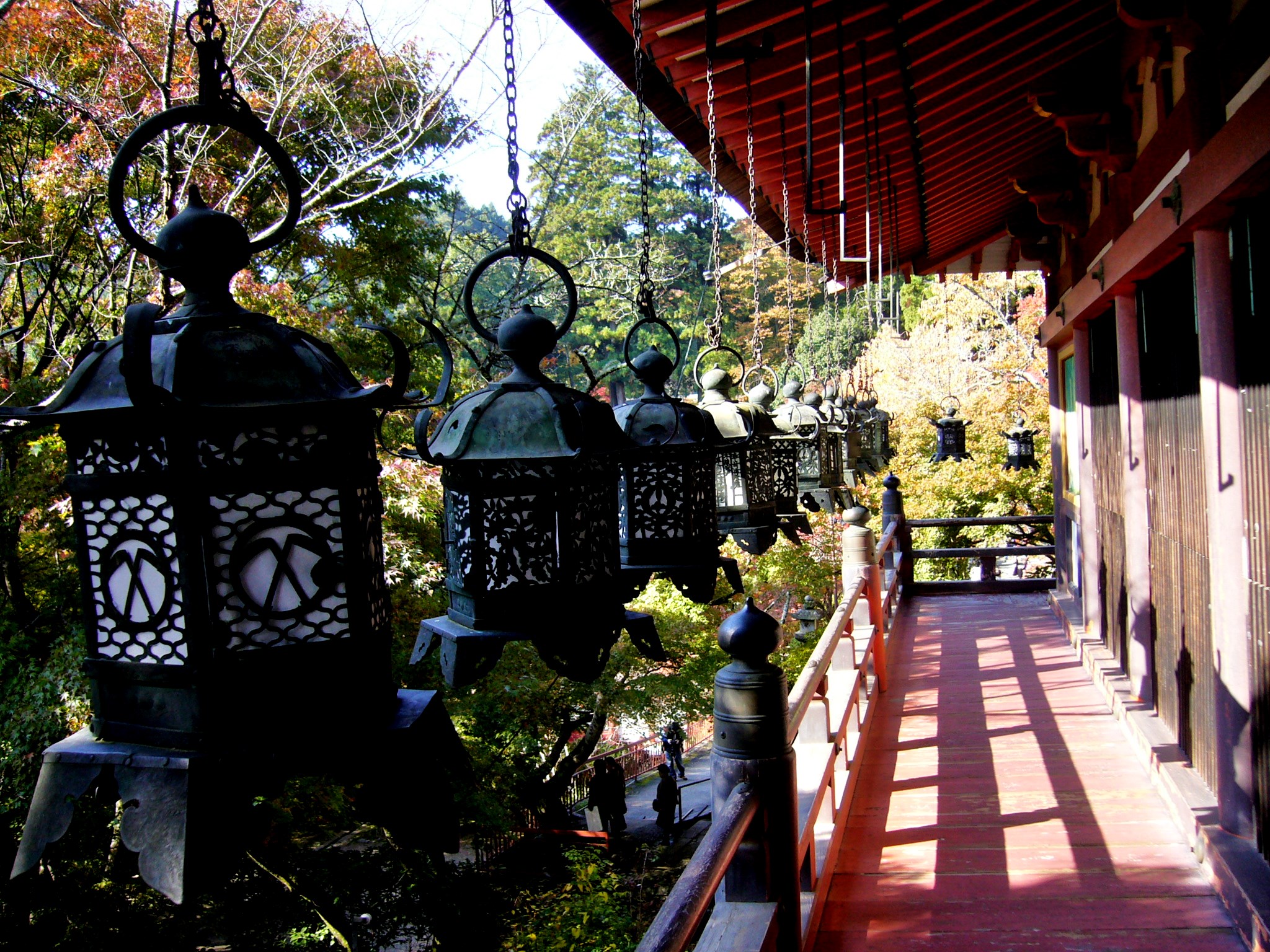 拝殿からの眺めも格別で、朱塗舞台造りの拝殿は永正17年(1520)の造営で、中央の天井は伽羅香木でつくられています。折れ曲る東西透廊は本殿を囲む特異な形態をもち、檜皮葺の屋根が美しく、外廊の多くの金灯籠も美しい。