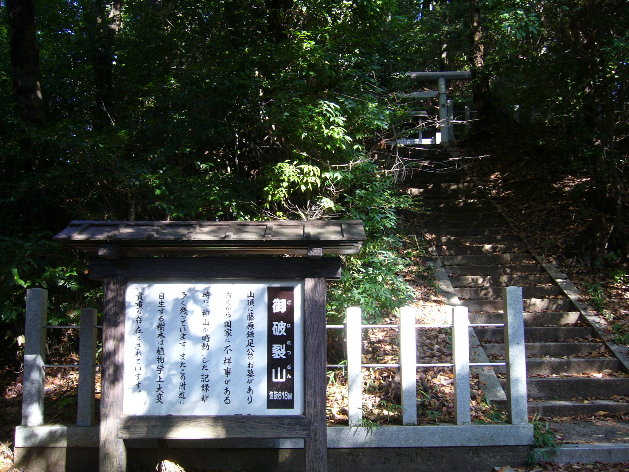 御破裂山(607m)は、古来より国家に異変が起こる時には、鎌足の神像に亀裂が生じ、御破裂山が鳴動するといわれ、朝廷はその都度、勅使を差し向けて国家安泰を祈らせたといわれます。頂上には鎌足公の墓所があり手厚く葬られています。御破裂山から眺める大和盆地の景色も素晴らしい。