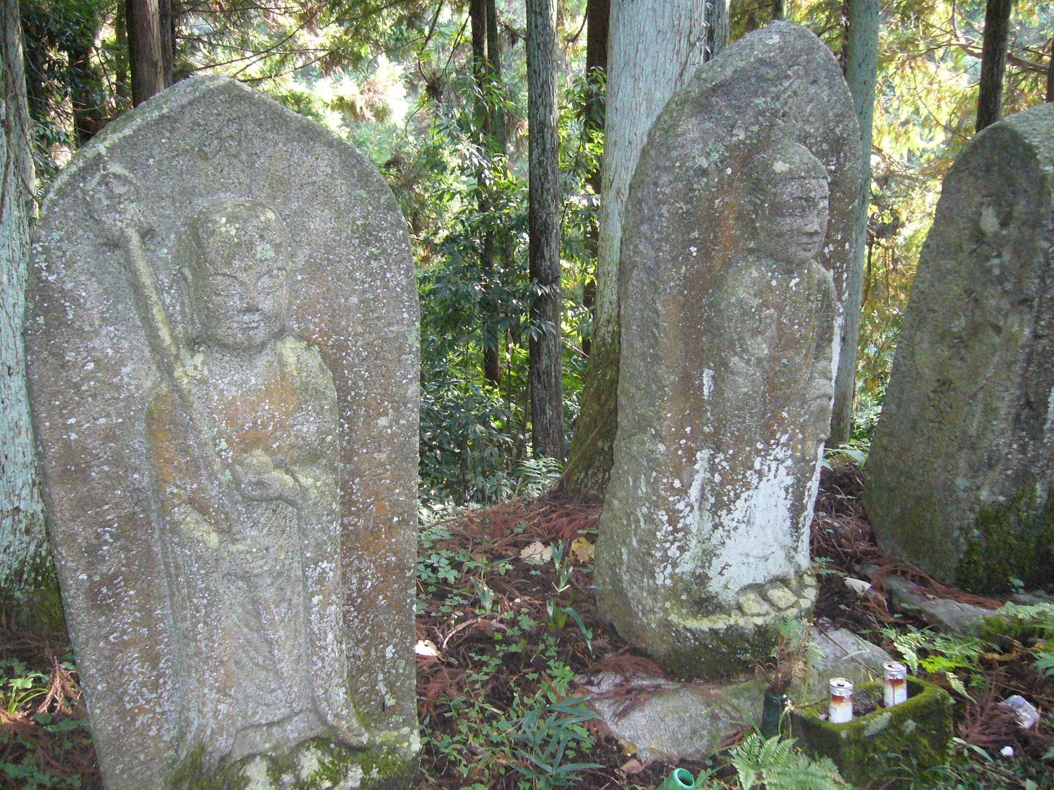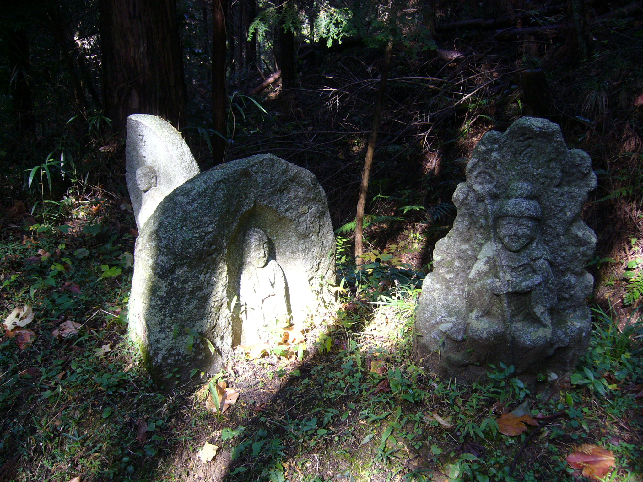 拝観後はハイキング道を下って古代史の里・飛鳥へ向かいます。神社前の急坂を上れば、すぐに峠に至る。かつて談山神社の西門があり、飛鳥からの参拝客を迎えていました。このあとは下るだけで、そこからさらに平坦な道を20分ほど歩いたところには小集落と三社神社があり、その先の標識に従い進む。道中さまざまな石仏を見ながらの道行きです。まもなく、いのちがけ奇行で有名ま高僧・増賀上人(917~1003)の墓・念誦窟(ねずき)と記した標識と出会う。