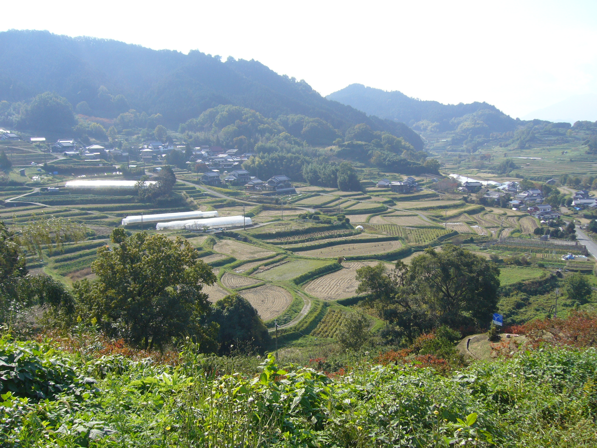 展望台への階段を挟んで道は二手に分かれ、右は飛鳥寺へ、左は石舞台へと向かいます。今回は飛鳥の石舞台に向かいます。柿などの果樹園や遠くに日本棚田百選の「稲淵棚田」も望めるのどかな雰囲気の中、道を下っていくとやがて正面に飛鳥の里のシンボル「石舞台古墳」が見えてきます。稲淵の棚田はNHK連続テレビ小説「あすか」にもたびたび登場した場所です。