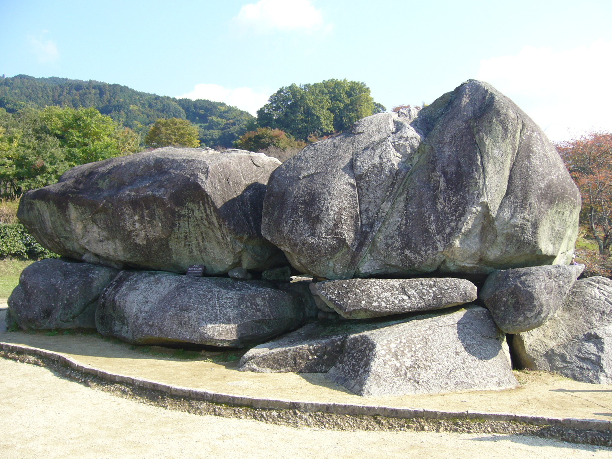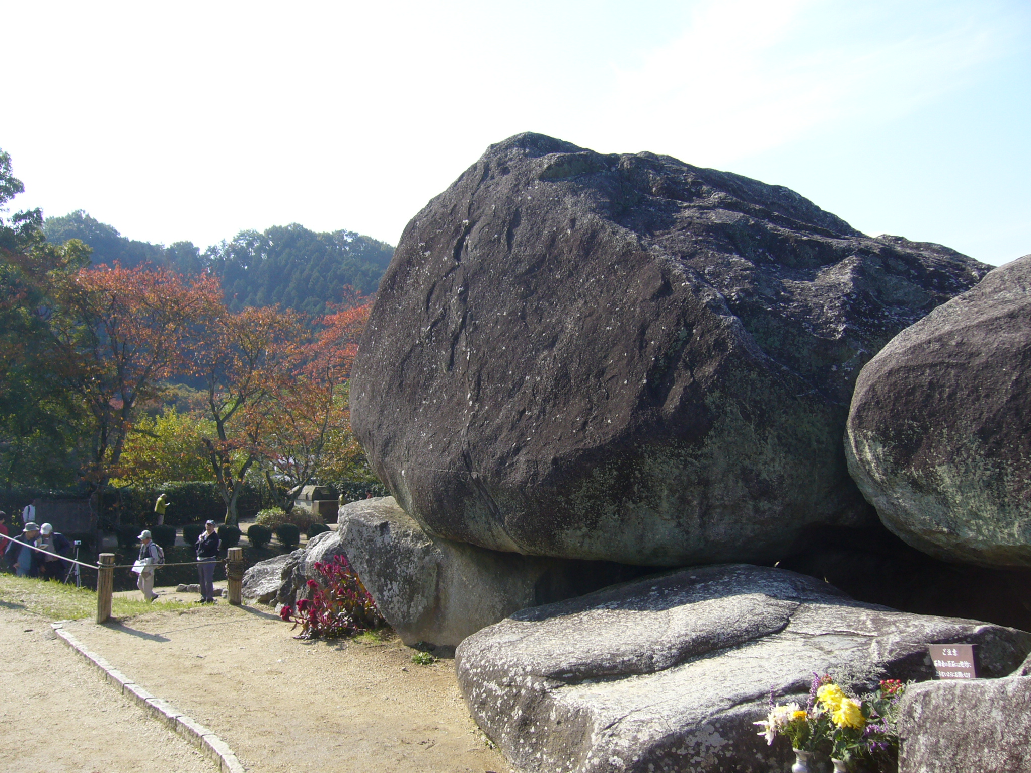 「石舞台」の墳丘は一辺50mの方墳で、幅8.4mの濠が巡る。盛土を除かれ古墳の石室が露出した総重量2300トンの花崗岩の巨石を39個も積んだ蘇我馬子のお墓と伝わる日本最大級の横穴式石室は玄室の長さ約7.8m、幅約3.4m、高さ約4.8m。内部にも自由に入れ、その巨大さが実感できる。(「あすか」で家出したあすかが夜を明かした場所) 石室が露出しているのは、馬子の専横ぶりに反発した後世の人が封土をはがしたとも伝わります。