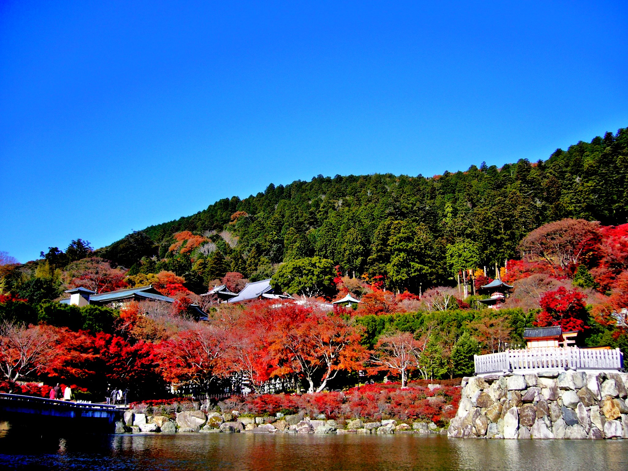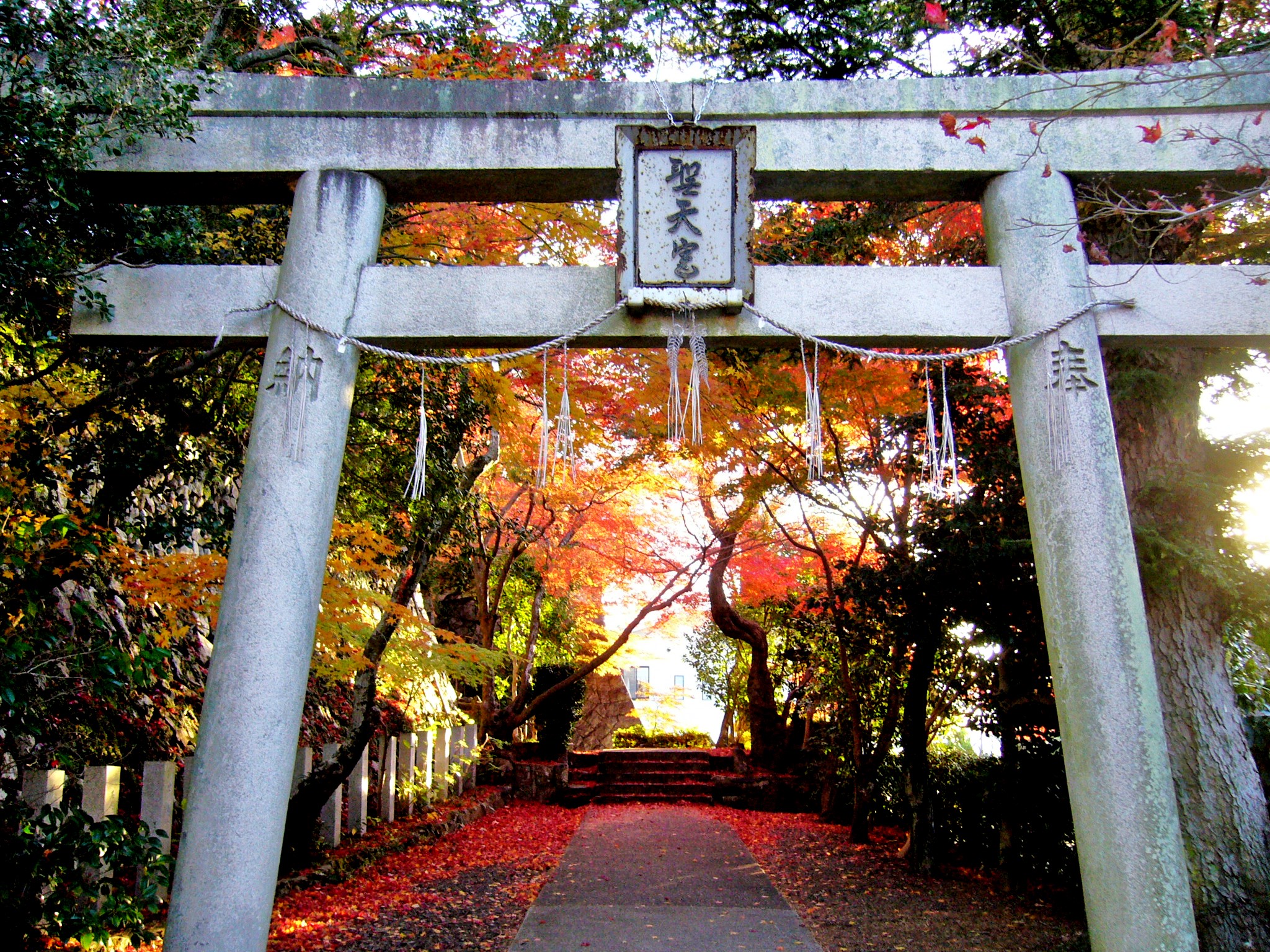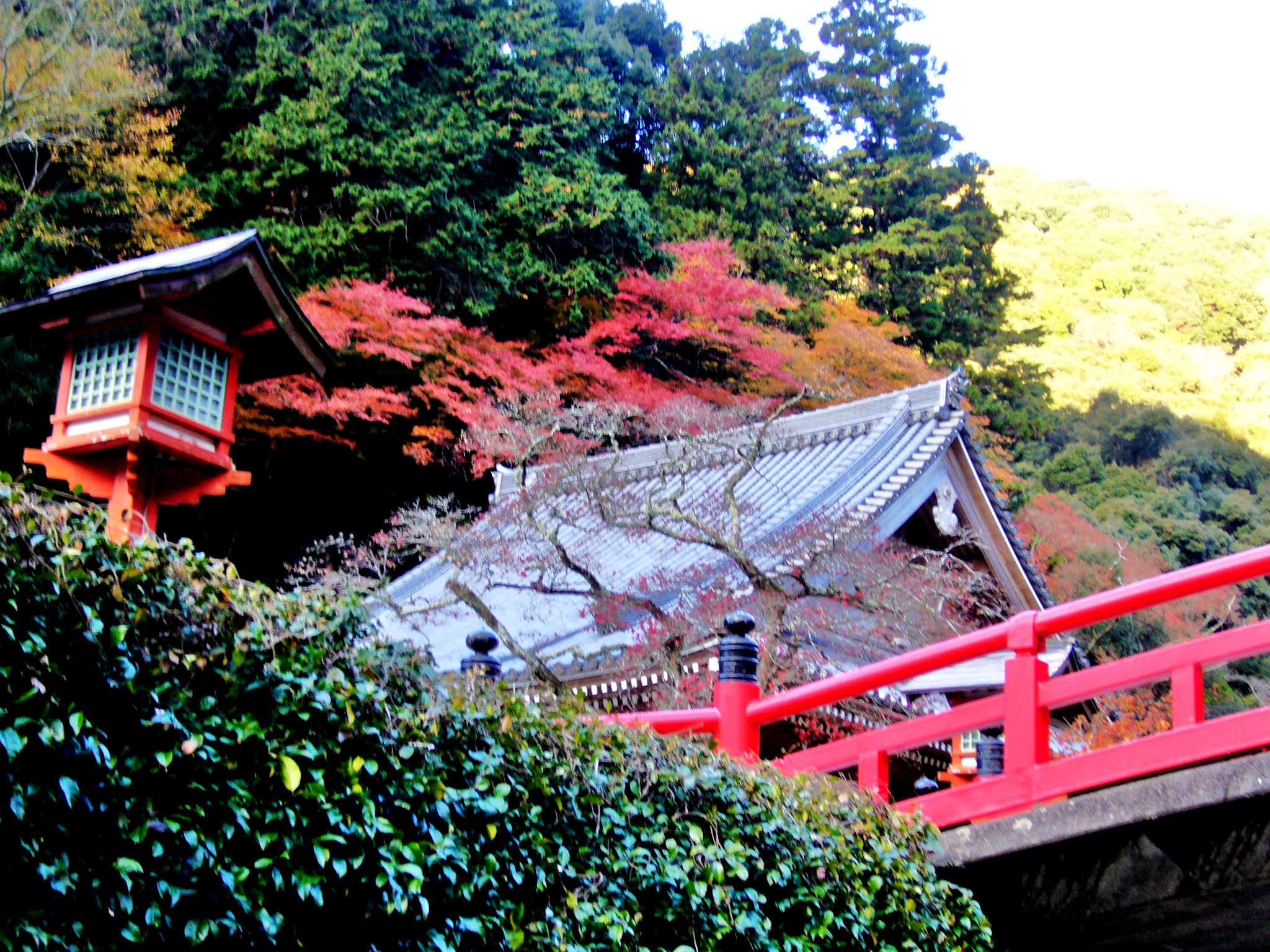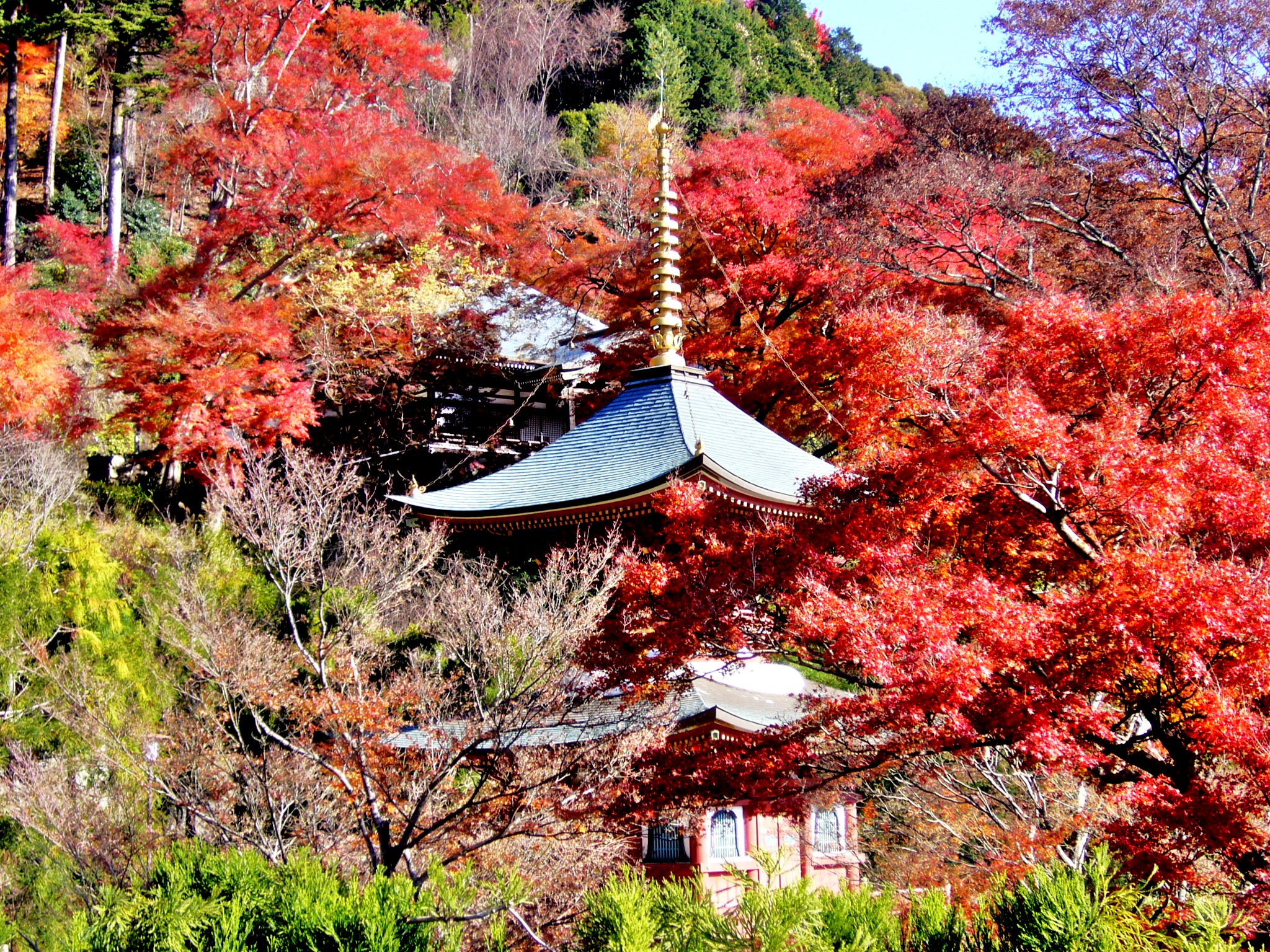 神社として聖天宮、寺院としては西江寺の神仏混淆の性格を備える高野山真言宗のお寺ですが鳥居も建てられています。紅葉が鳥居を取り囲むように参道を覆っていて、紅葉の時期に写真を撮るならここは外せない場所です。イロハモミジをはじめ、オオモミジや黄色に色付く一行寺楓、天狗の羽団扇に見立てられるコハノウチワカエデなど違った紅葉が愉しめますよ。