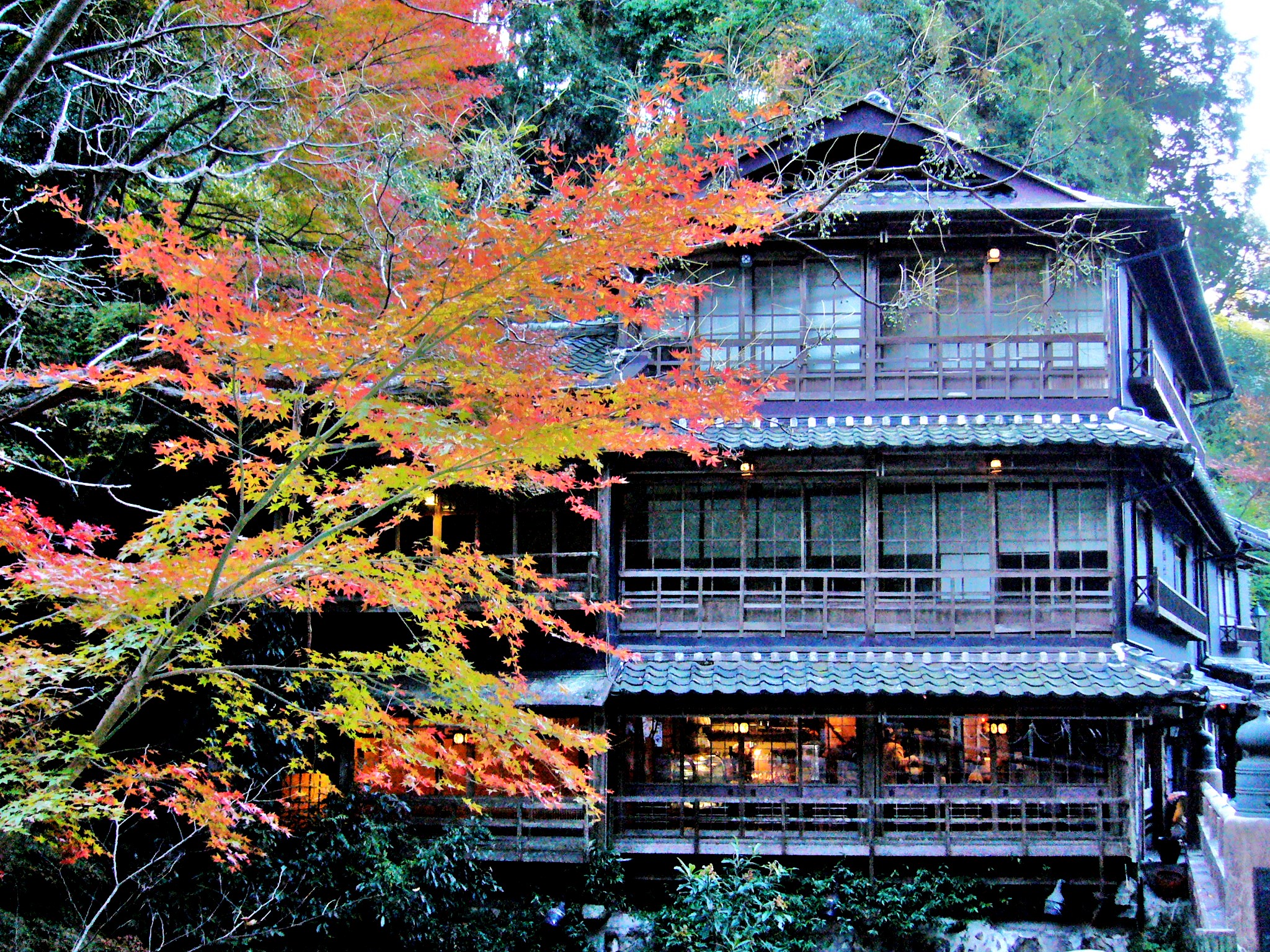一の橋を渡った少し先の滝道沿いに「和モダンなオーベルジュ」をコンセプトにした泊まれる料亭「音羽山荘」があります。大正15年(1926)建築の大正モダニズムと気品漂うアール・デコ様式を取り入れた邸宅をリノベーションしています。増築を重ねてきた建物は、緩やかな曲線を描く滝道に沿って建てられているので、箕面川沿いの紅葉を取り入れた絶好の被写体になります。手前の橋は「聖天橋」といい、ここを渡ると聖天宮西江寺~聖天展望台に至りますよ。音羽山荘の裏山に聳える紅葉を見ながら登る展望台では大阪平野が一望できます。
