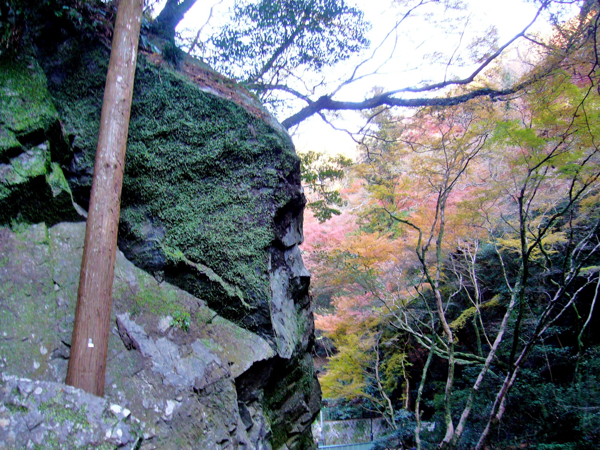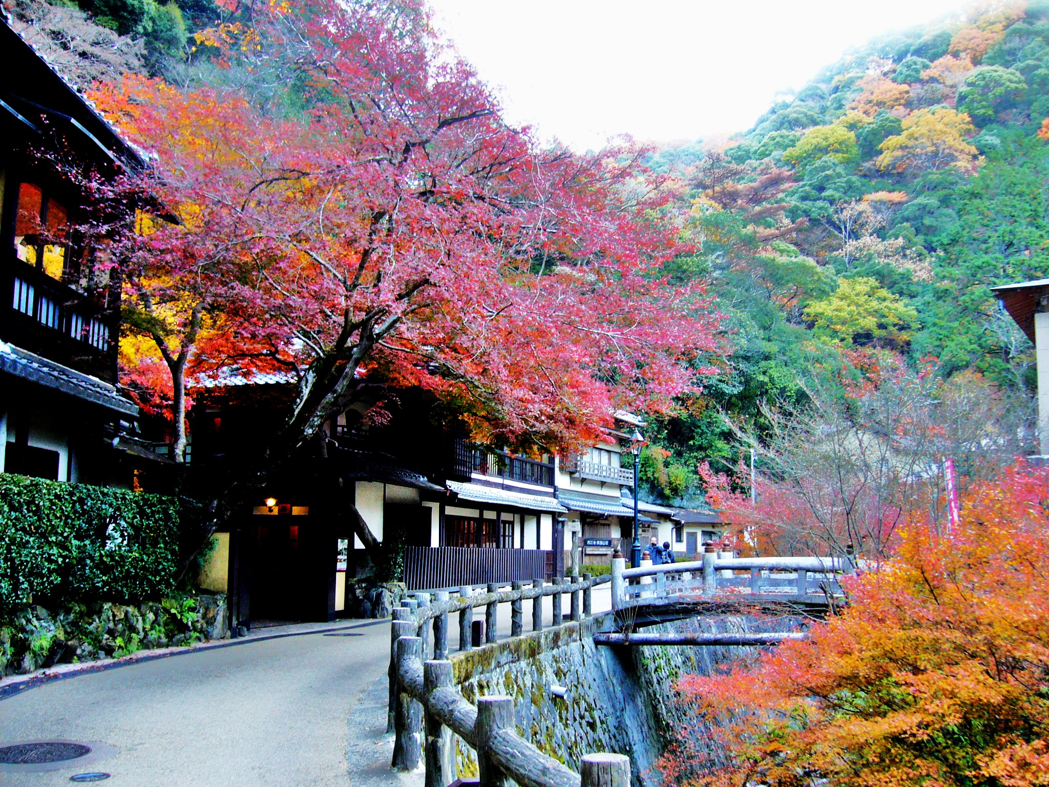 阪急梅田駅から電車で30分。箕面駅を降りたのが7:25で駅からはまだ開いていない土産物店の店先をまばらな人の流れに沿って進みます。左手の高台にはTVでお馴染みの箕面温泉スパーガーデン箕面観光ホテルが見える。箕面駅からすぐの「一の橋」から箕面公園昆虫館の先、瀧安寺にかけての渓谷沿いの道は、明治19年(1886)に地元民によって造られました。適度な日照と湿度によりシダ類の宝庫です。滝道沿いには音羽山荘など昔ながらの老舗旅館が並び、その後背の紅葉の山がこの先の期待を高めてくれています。