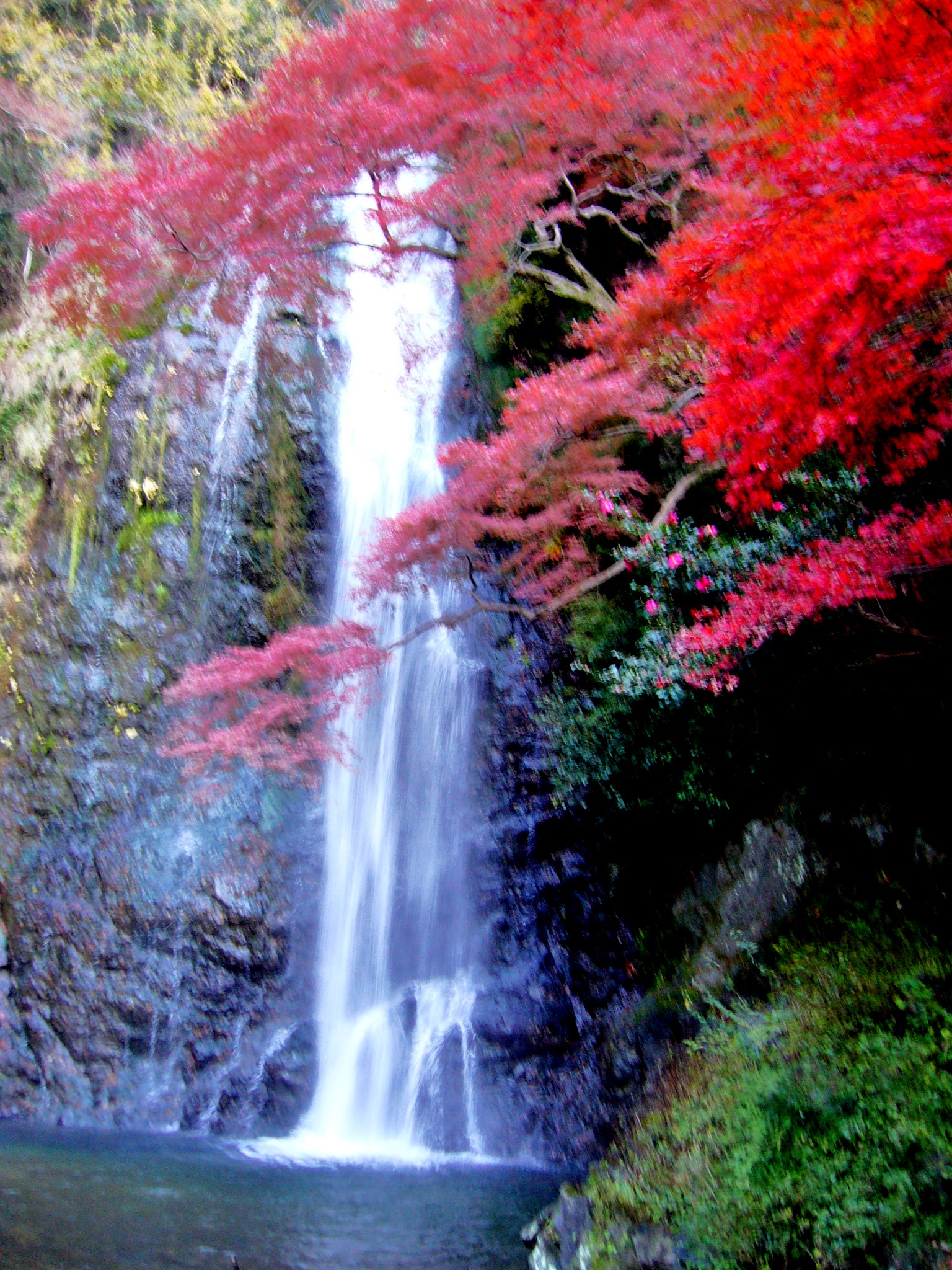 大阪府唯一「日本の滝百選」に選ばれている箕面大滝」は、幅5m落差は33mあり、紅葉に彩られた白銀の滝が目の前に現れた瞬間は感動です。岩壁から水が一気に流れ落ちる様子はとてもダイナミックでもあり、水面の少し上にある出っ張った岩に砕けて腰折る様は神秘的です。古くから名瀑と知られ、戦国時代には、織田信長が鷹狩の途中に立ち寄ったと伝えられています。