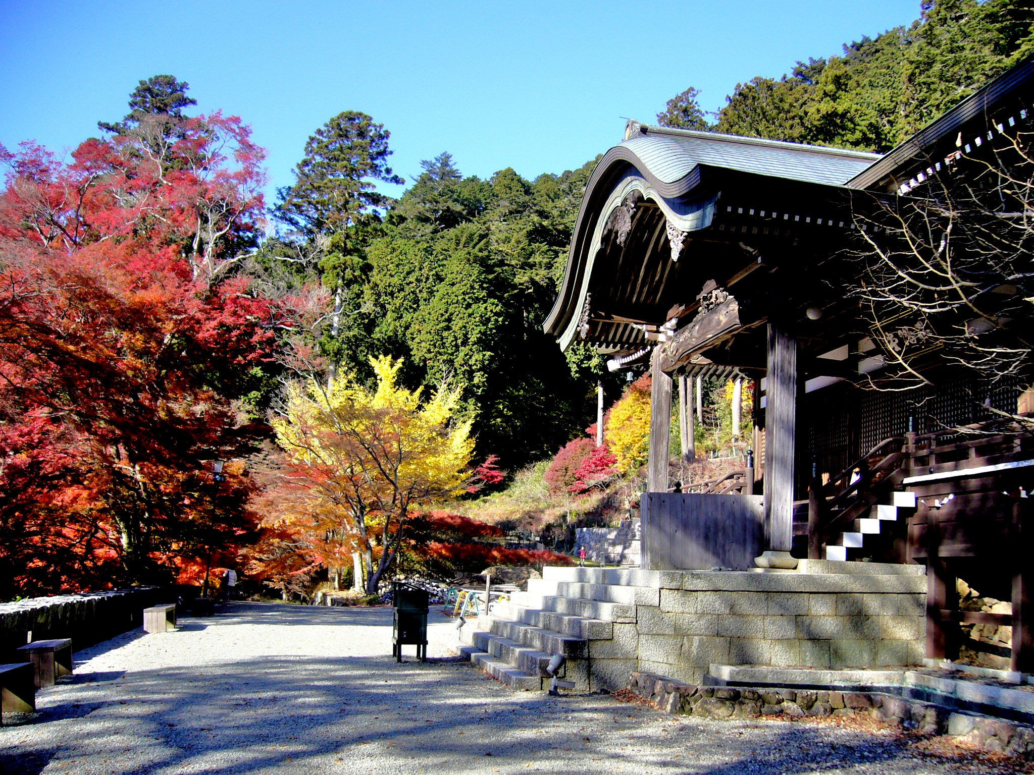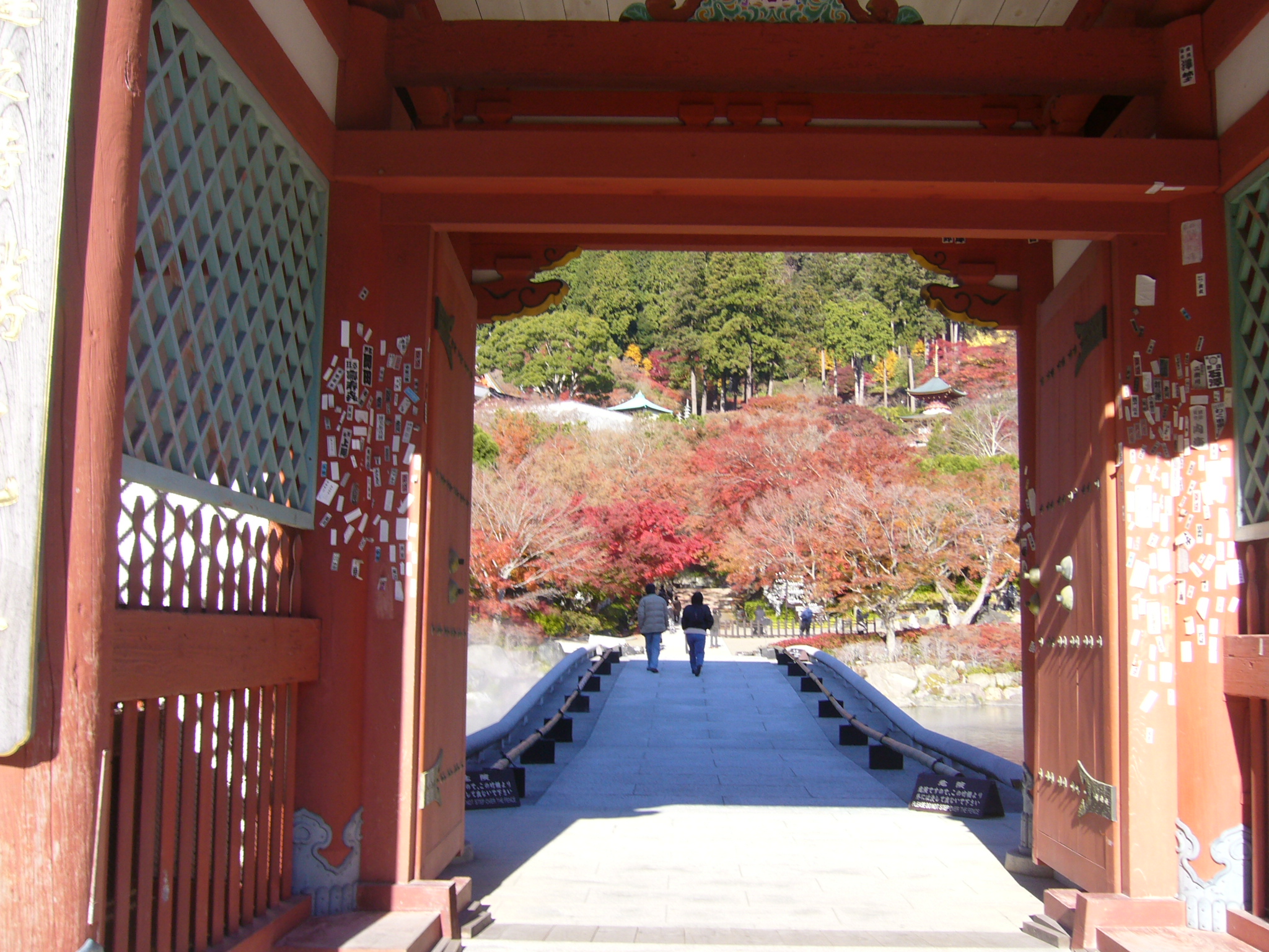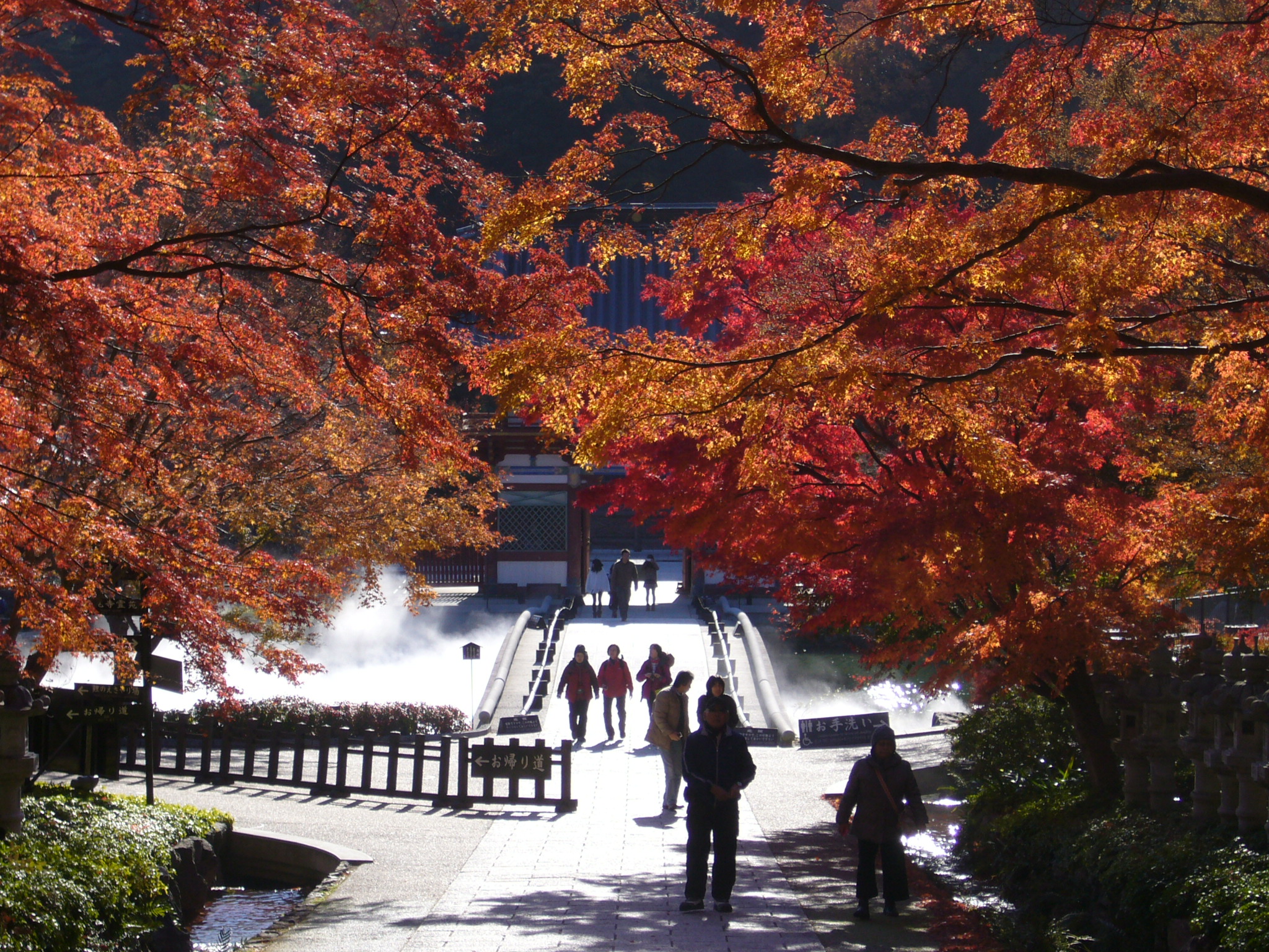 橋を渡るとそこは仏様のお庭=境内なので、お清めの霧を浴び、厄を落とし、身を清めてから境内に入ります。参道の両脇から枝を伸ばした真っ赤な紅葉のアーチが出迎えてくれます。標高400mで寒暖差も激しく赤く燃えるような紅葉になります。