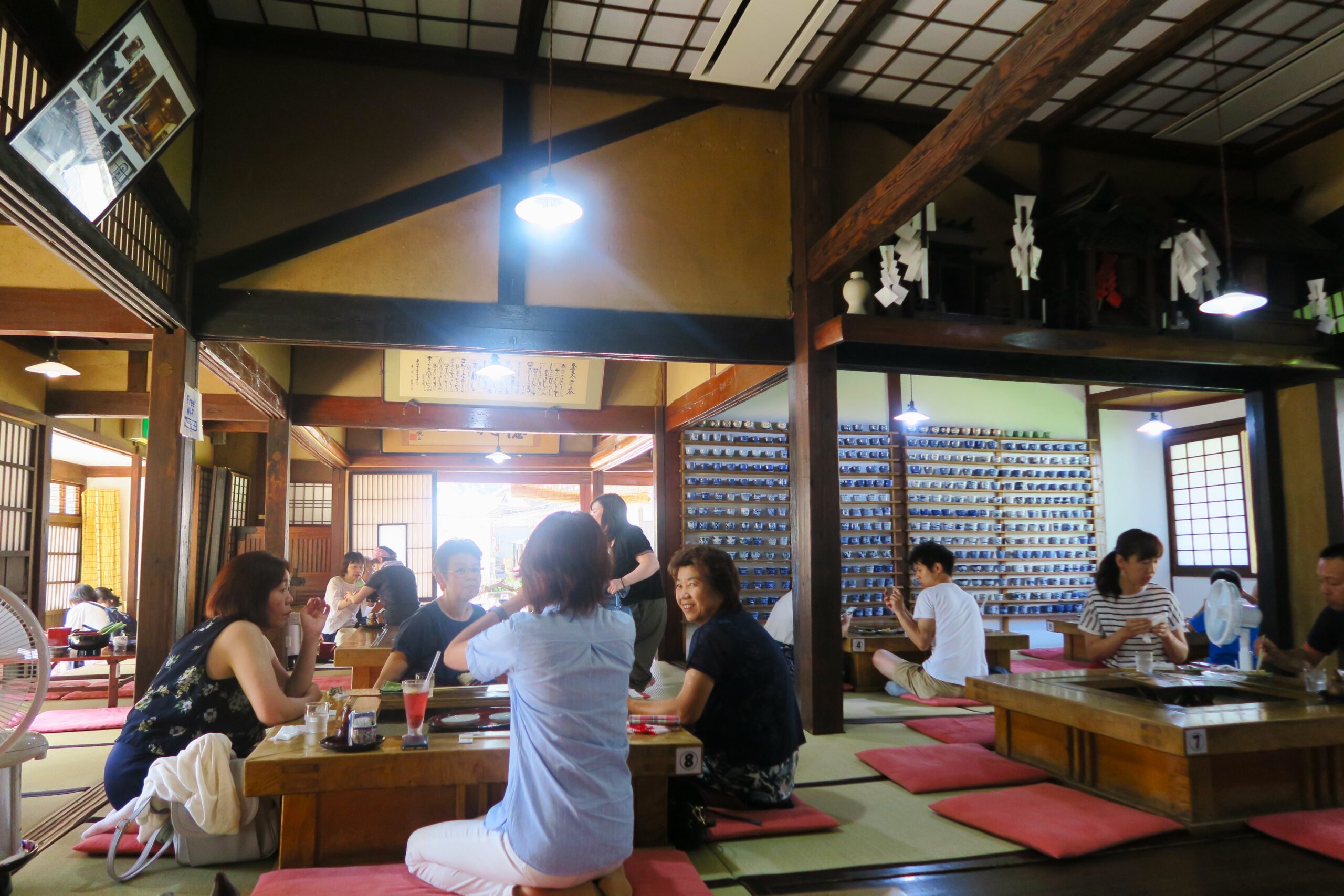 茅葺き屋根の建物の多くは、民芸品店や食事処となっています。名物のネギそばのほか、トチの実を使った栃餅、しんごろう餅、焼き立てのイワナ塩焼きや玉コンニャク、手焼き煎餅を軒先で売る店などが多く並ぶ。土産物店はどこも通りに面した建具を大きく開き、縁側に商品をいっぱい並べています。散策しながら手軽に食べられるのがうれしいし、一軒ずつゆっくり見ていても飽きることがない。