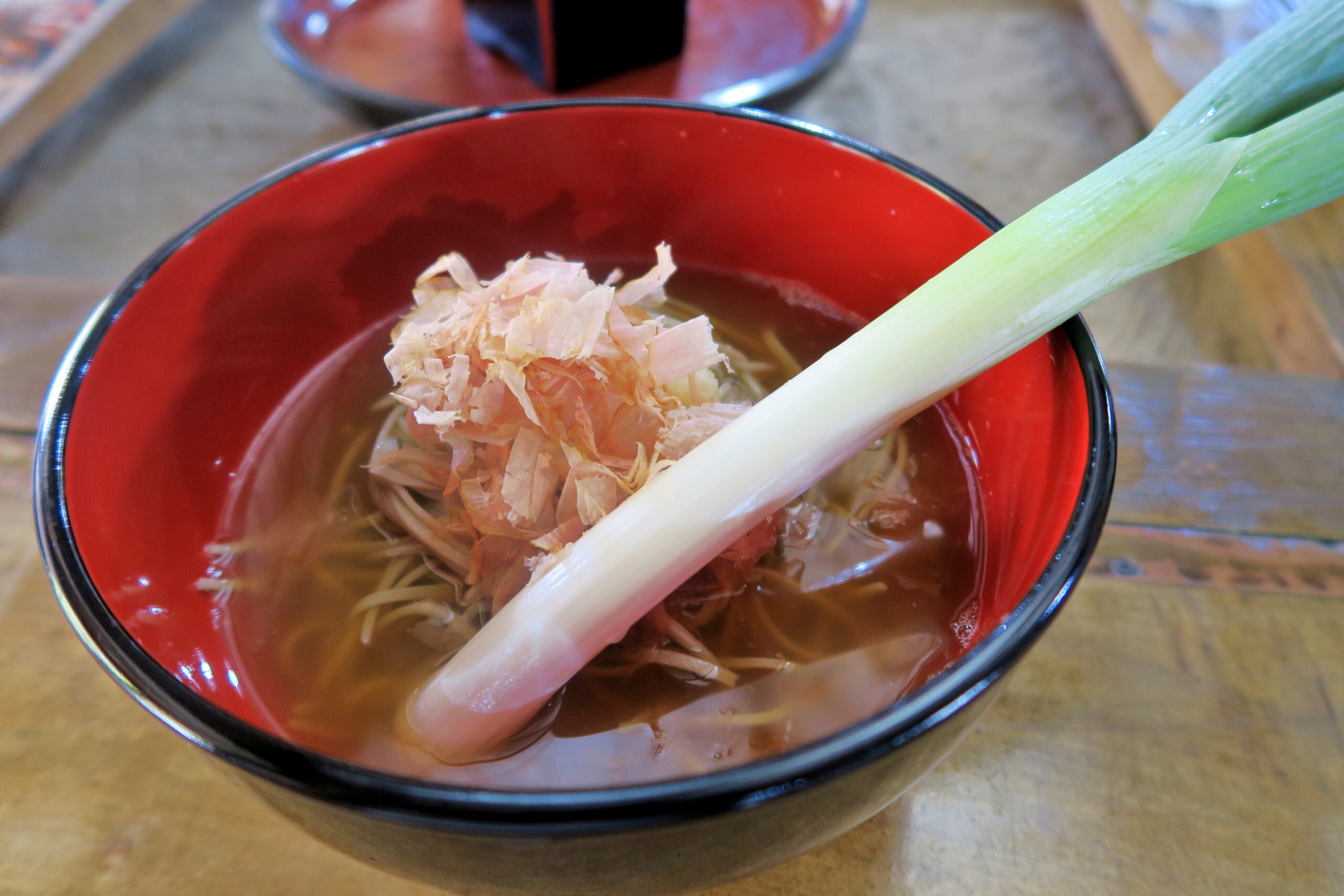おろしそばに箸代わりの長ネギが添えられた名物の「高遠そば」。名前は会津藩藩祖の保科正之が信州高遠藩で育ったことに由来します。寛永20年(16439会津藩23万石の藩主となった際に当時そばの先進国ともいえる信濃国からそば職人を伴わせ、そば切りとともに、辛味大根のおろし汁に焼き味噌を溶いてつけつゆにする食べ方も伝えたといいます。三澤屋オリジナルの高遠そばは、箸と薬味を兼ねた長ネギが一本丸ごと付くのが特徴で、「細く長く、白髪の生えるまで」という意味を込めてネギが添えられ、これを箸の代わりにして食べるというユニークなそばです。