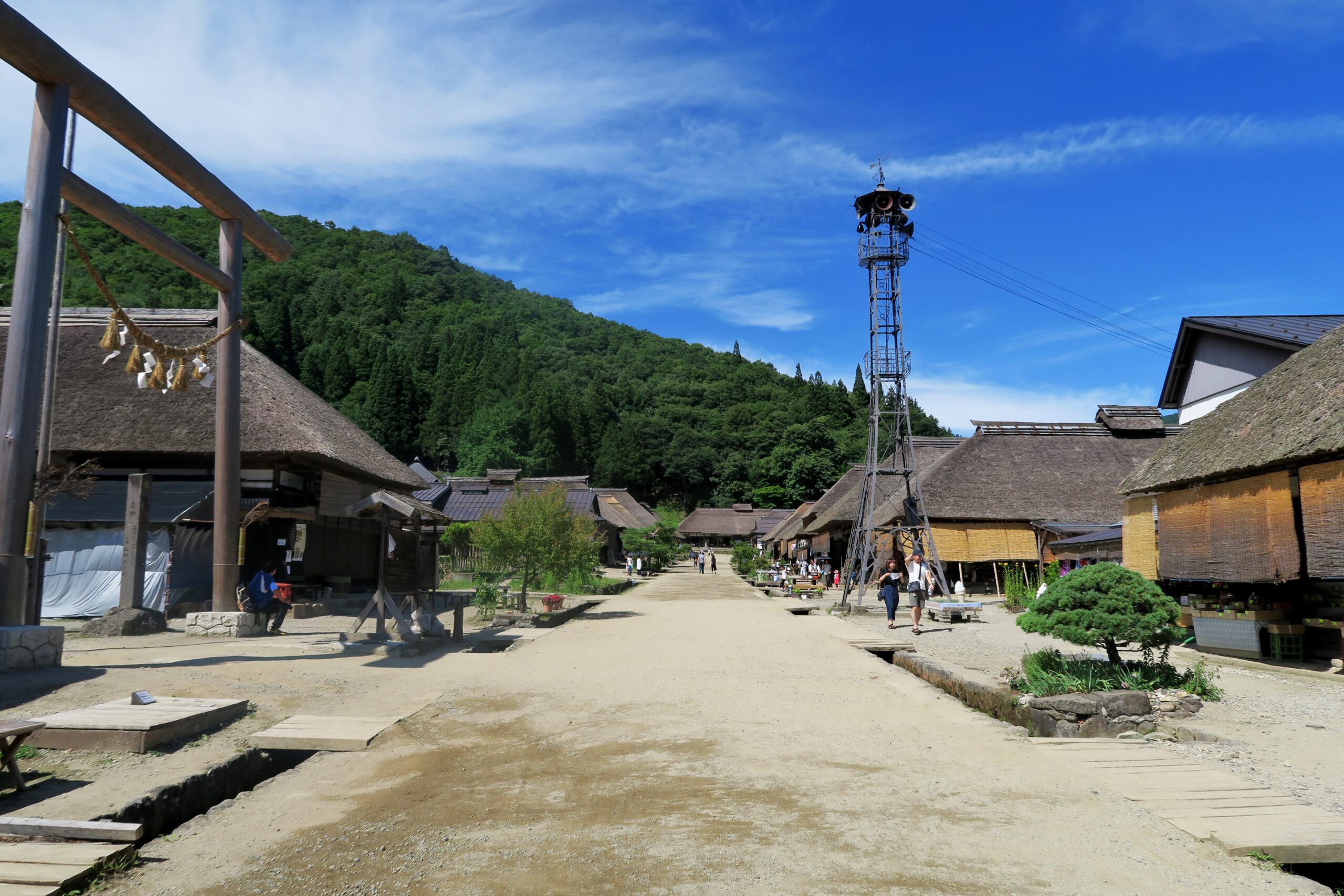 多くの家が寄棟造りで、間口は6~7間ほど。道の両側には山から清水を引いた用水路が流れていて、各家の前に設けられた洗い場では野菜を洗ったり、飲み物を冷やしたりしています。用水路から汲んだ水は花の水やりにも使われ、用水路の横には消火用の28基の放水銃が設置されています。日本の音風景百選に選ばれています。