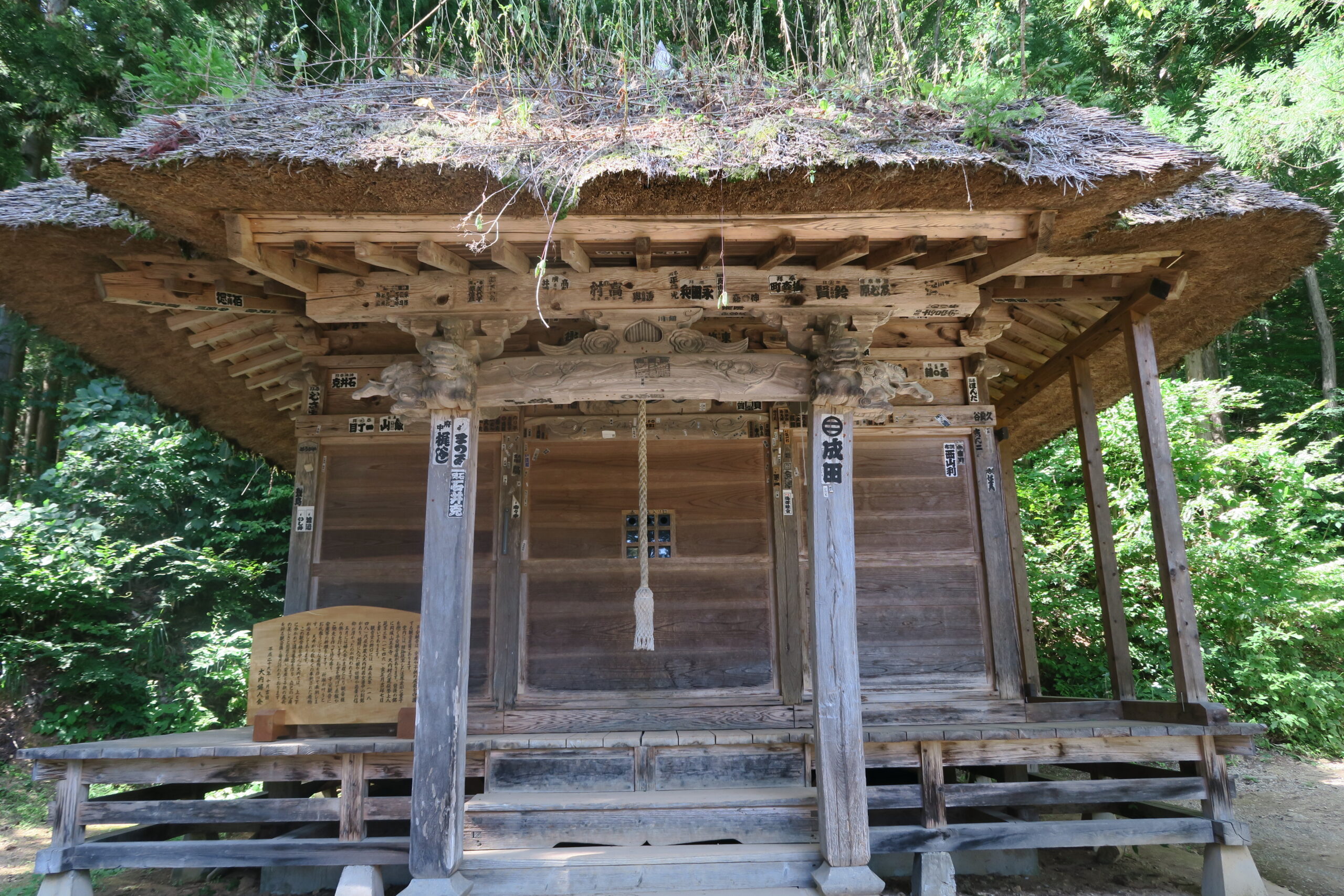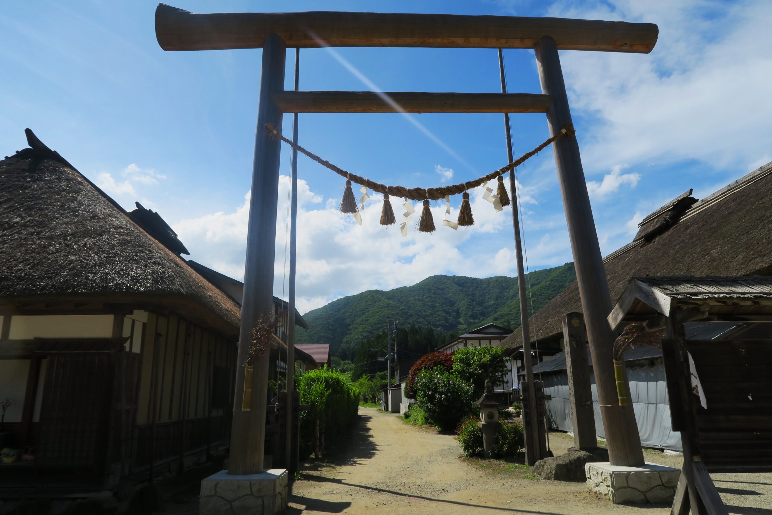 通りを駐車場方面に戻る途中、宿場の中ほどで目に止まったのは、立派な鳥居。集落西側の高台にある高倉神社の一の鳥居で、まっすぐに延びる農道の先、緑豊かな参道を進むと石段を上った先に拝殿があります。後白河天皇の第二皇子・高倉宮以仁王は平清盛の全盛期である治承4年(1180)源頼政のすすめで平氏打倒の兵を挙げましたが宇治川の合戦に敗れた後、落ちのびて大内宿に留まったと伝えられ、神社には以仁王と愛馬が祀られています。伝説によれば、宇治川で敗れた宮は、奈良路から近江東海道・甲斐・信濃・上州沼田・尾瀬・桧枝岐。伊南・大内・只見を通って越後に入り、小国右馬頭頼之を頼りに落ち延びていったといいます。大内に立ち寄った際、この里が都の風情に良く似ている所から、それまでの山本村から大内村と改められました。また以仁王の側室である紅梅御前の従女、桜木姫の霊墓もあり、境内には樹齢800年の大杉がどっしりと構えています。