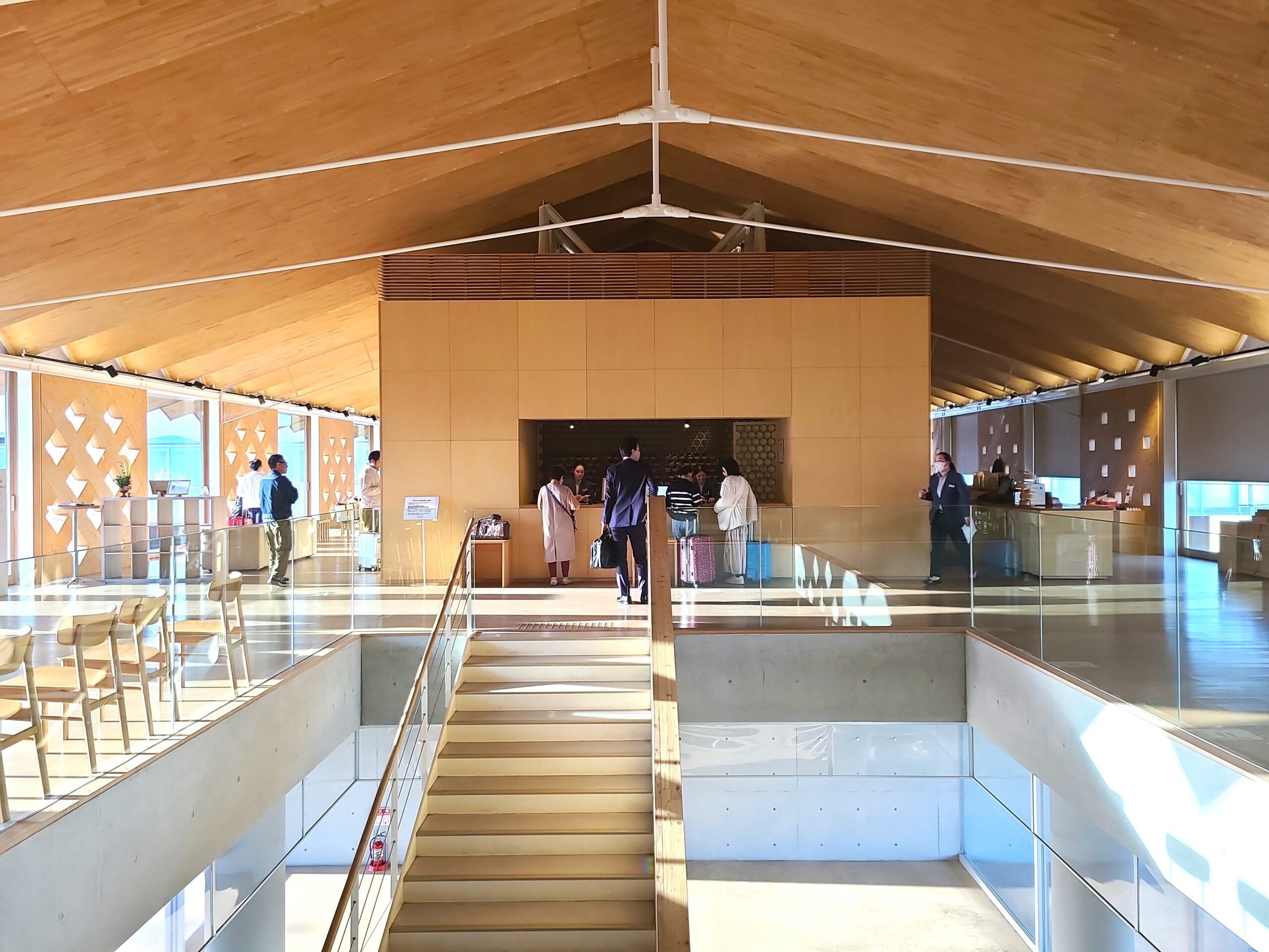 エントランスを通り2F共用棟へ階段を上ると正面がフロントです。特徴的なギザギザ屋根は、折半構造という屋根を蛇腹状に組み合わせて強度を増す構造を採用し、在来工法で必要になる屋根、母屋、そして小屋梁などの構造が不要になる効果があり、可能な限り柱を排除した16.5m×70mの大空間を実現しています。大きな窓から光がたっぷり差し込み、ナチュラルな木材が温かみのある雰囲気を醸しています。