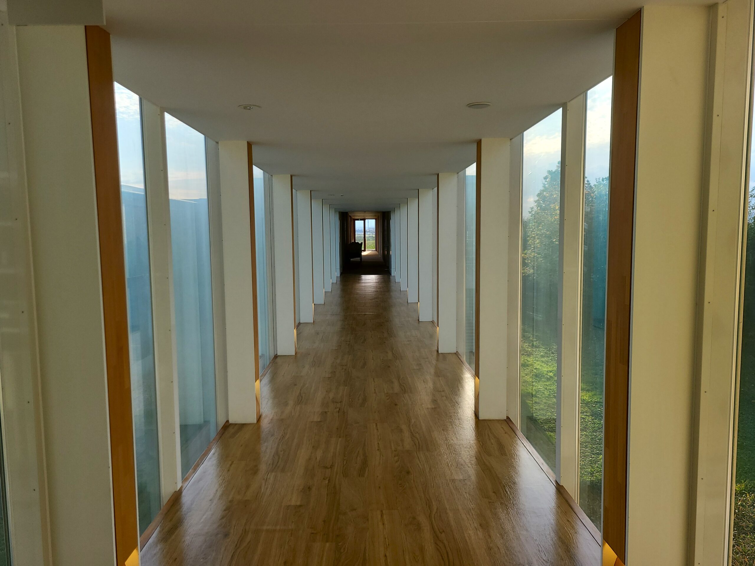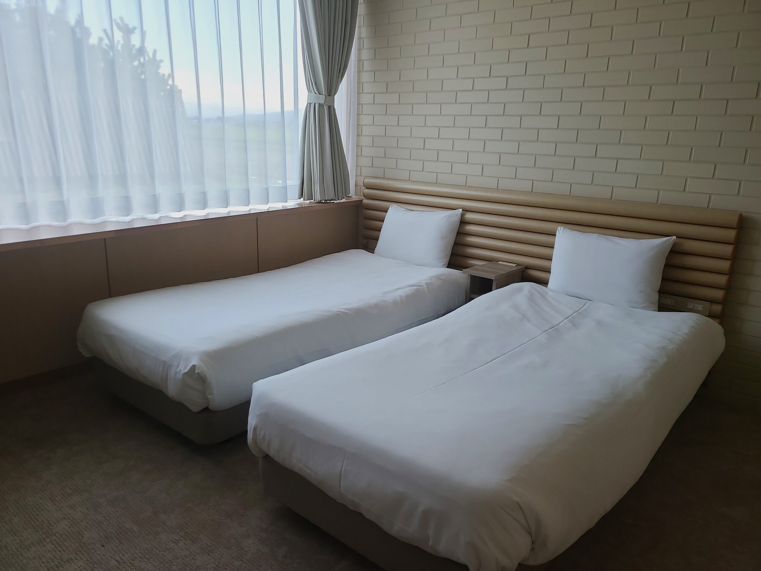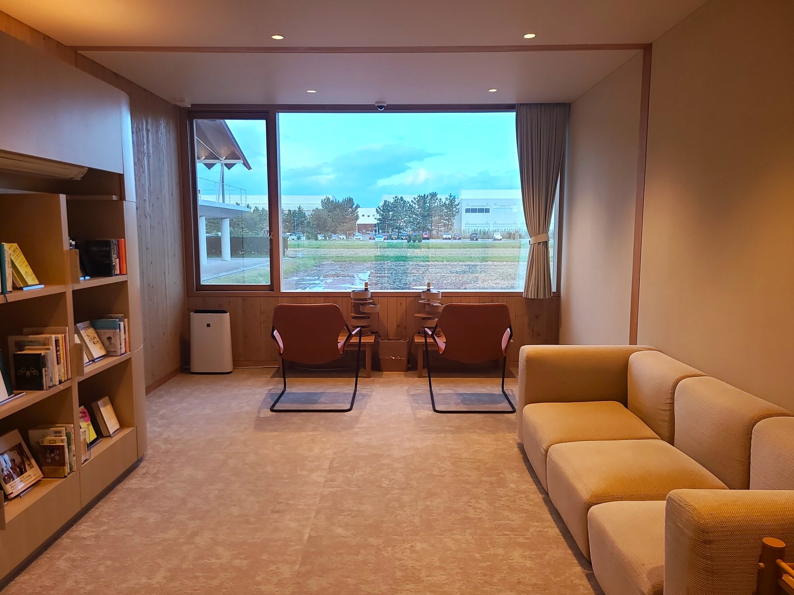宿泊棟は羽黒山(H)、月山(G)、湯殿山(Y)と出羽三山の名を冠する3つの客室棟には、シングルからファミリーまで様々な利用シーンに合わせて利用できる客室全119室が配置されています。今回宿泊したのはH棟で共用棟のライブラリー側の入口からガラス張りのブリッジで向かいます。移動するたび、周囲の田園風景も表情を変えます。