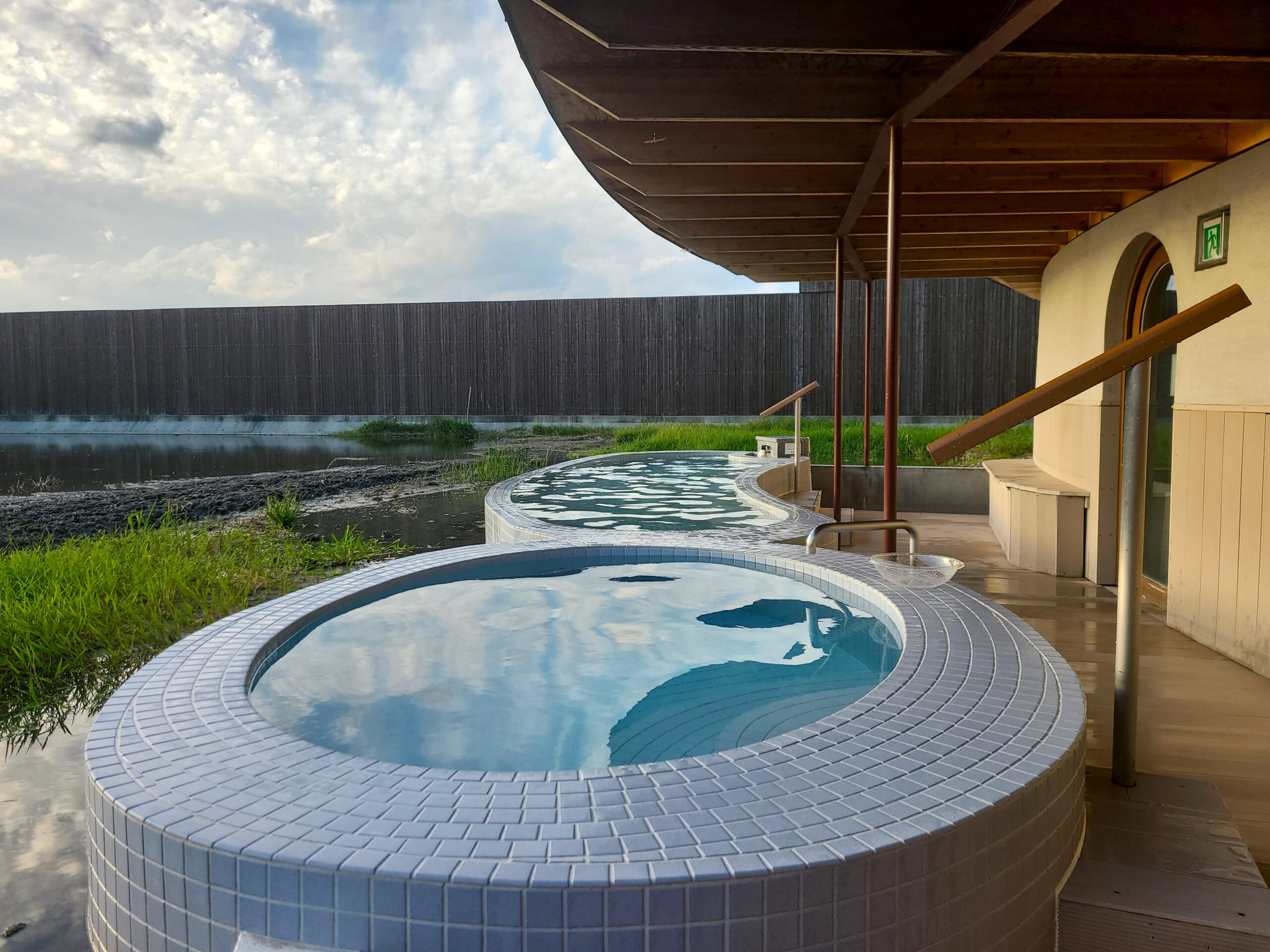 SUPAは全部で3ヵ所。源泉かけ流しの天然温泉と、本格的なフィンランド式サウナ、そしてフィットネスを揃えた設備。地下1200mから汲み上げた鶴岡京田温泉の泉質はナトリウム・カルシウム-硫酸塩・塩化物泉です。温泉は毎日6:00に男女が入れ替わります。この日は男性が“月白の湯”で、小さな洗い場とサウナそして広々とした露天風呂。「月白」は月の光を思わせる、やや青みがかかった色のことで、洗い場を構成する優しい色味の白壁と夜に浴槽を優しく照らす月明りから命名されました。虫の声や鳥のさえずりを聞きながら季節や時間による景色の変化が楽しめます。