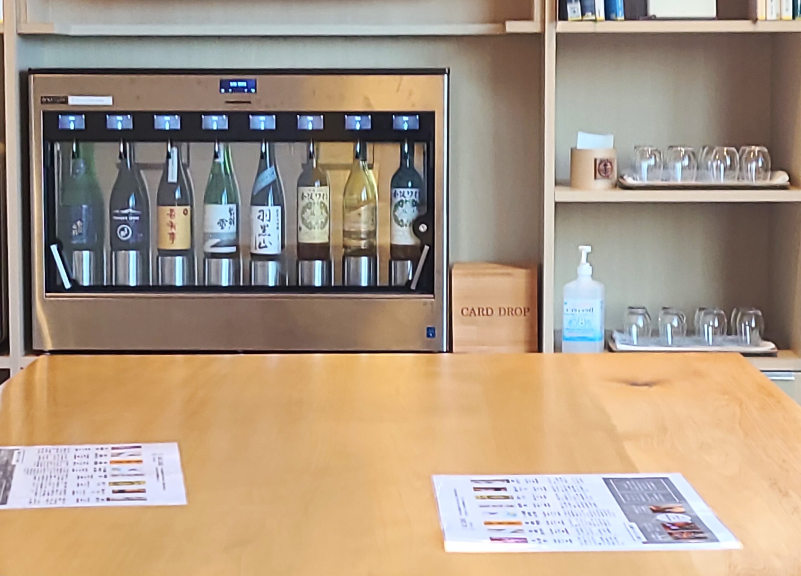 向かいには21:00オープンのSAKE BARがある。館内着のまま気軽にお酒を楽しむことができるバーで、日本酒はもちろんのこと希少な庄内産のクラフトウイスキーやワインにスパークリングワイン、地ビールなど、入浴後の渇いた喉を潤してくれる飲み物が用意されています。山形の季節のフルーツを使ったジェラートやジュースもあり、飲めない人や子供も入店可能です。