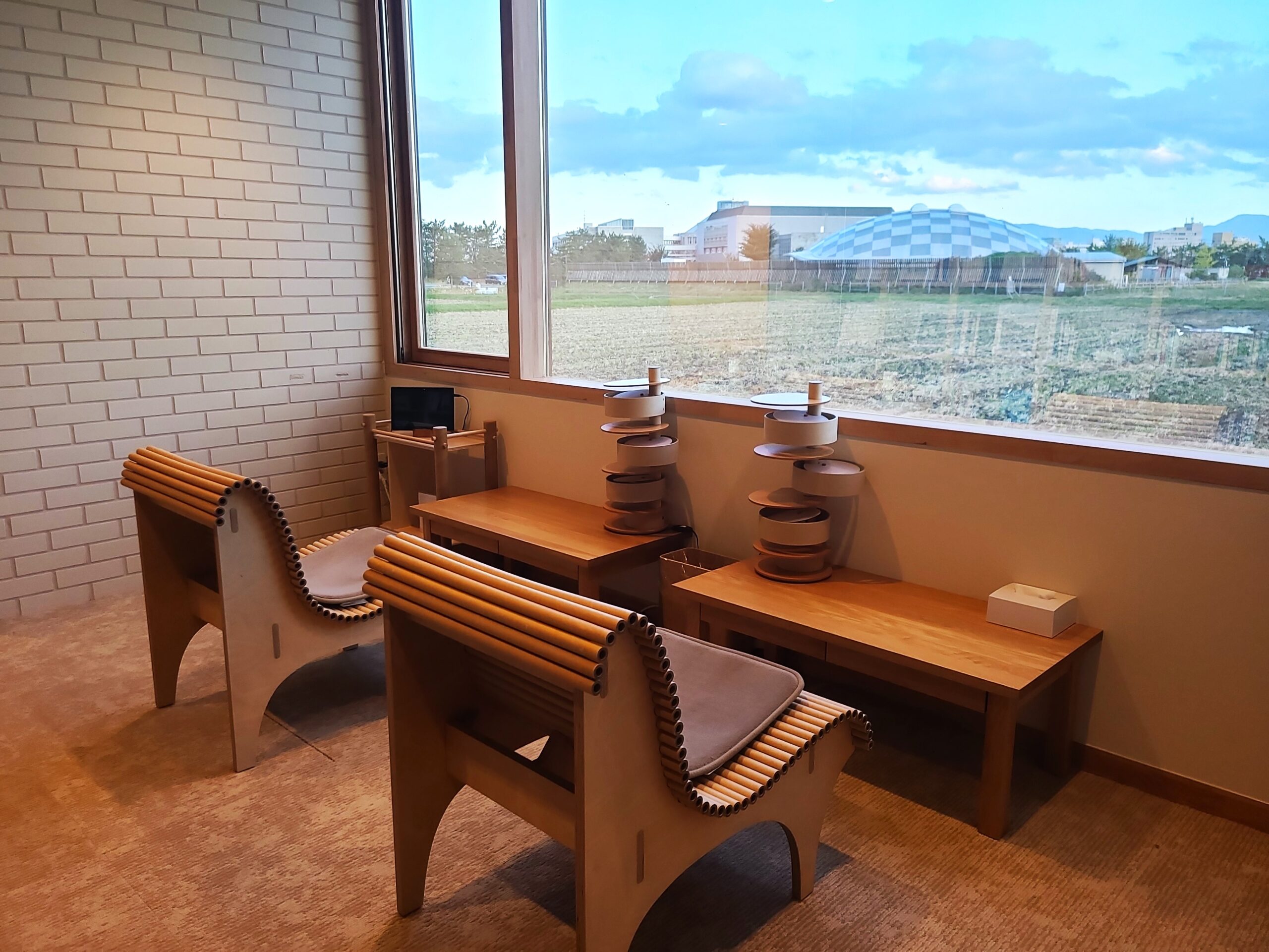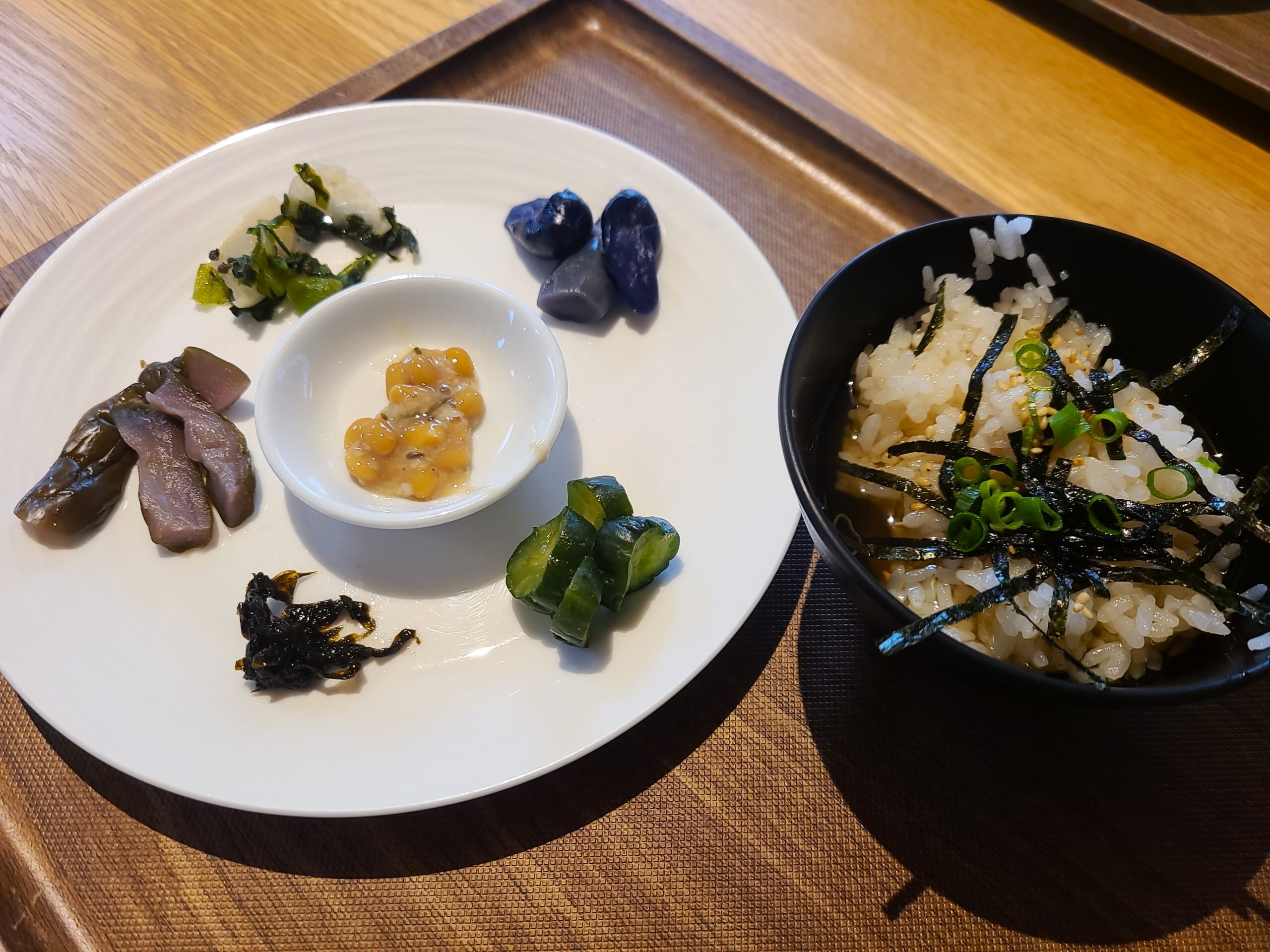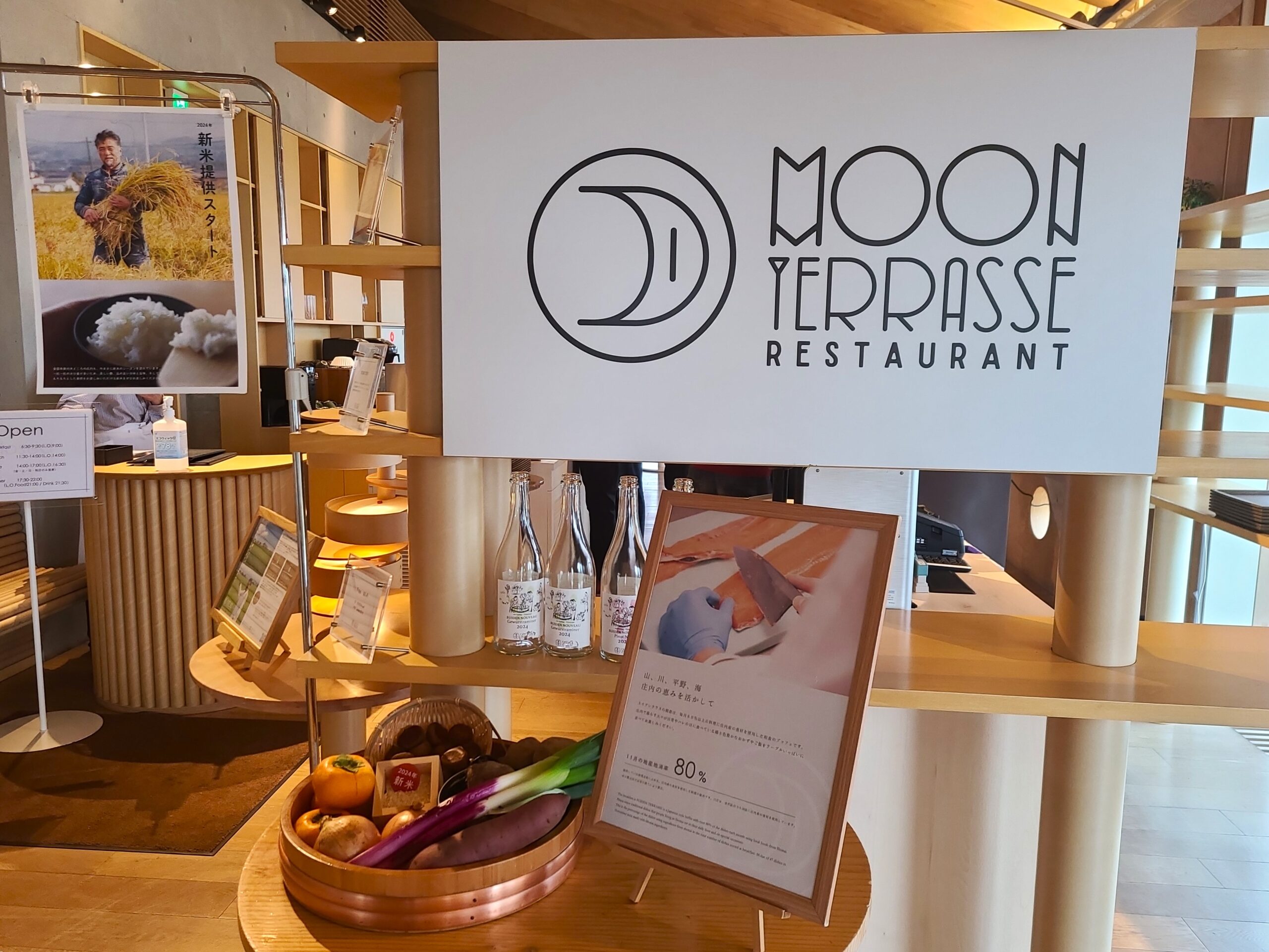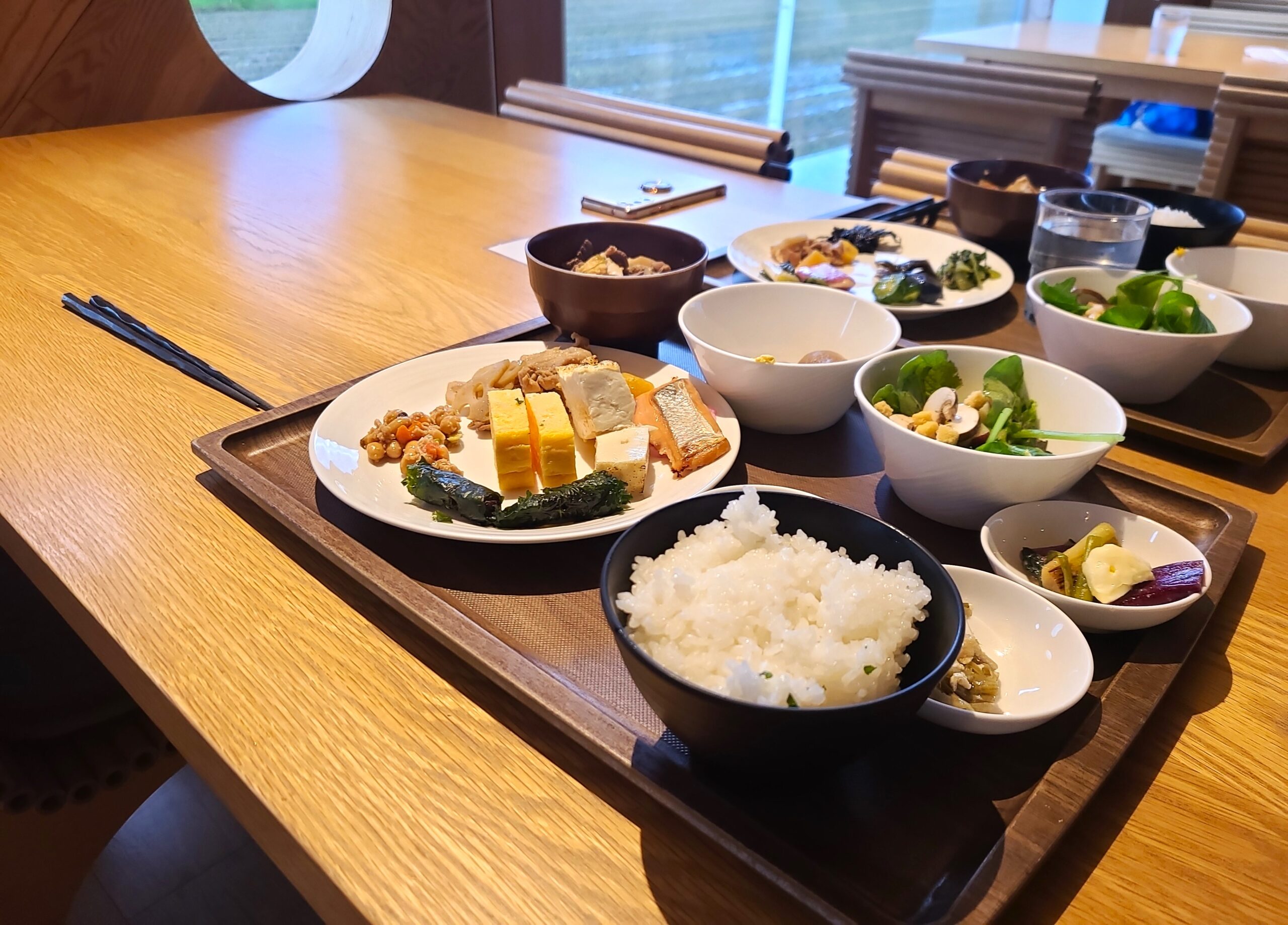 この2F共用棟、フロントの向かいにはMOON TERRASSEと名付けられたレストランが併設されています。月山を望む空間で、朝食、ランチ、カフェ、ディナーを楽しむことができます。料理の見た目、香り、食感、味わい、そしてスタッフの言葉を通して、山形庄内の春夏秋冬の食体験を提供しています。今回の宿泊プランは1泊朝食付だったので山形庄内の大地の恵みを活かした地産地消の和朝食をいただきました。
