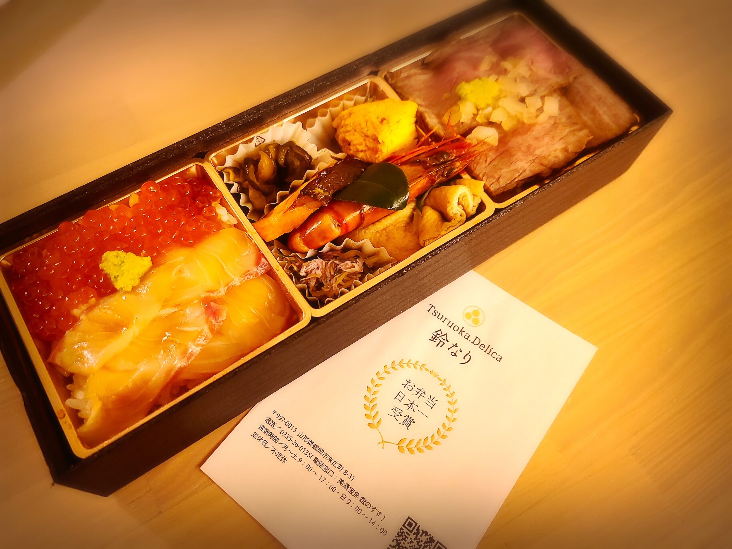 今回1泊朝食付プランということもあり、夕食は地元料亭「すず音」のデリカテッセン「鈴なり」でお弁当を注文しておきます。「やまがたよくばり弁当」には鈴なりでも使用されている「鮮度」と「質」にこだわった全て山形産の食材を使用。魚は庄内浜の鼠ヶ関、由良、酒田、3つの漁港から揚がった新鮮美味な魚介、お肉は庄内豚や山形牛、野菜は産直の採れたて野菜、山菜はフキ、こごみ、ぜんまいなど自社農園にて栽培した季節の山菜を朝採りで収穫したもの、お米は羽黒産つや姫を使用しています。