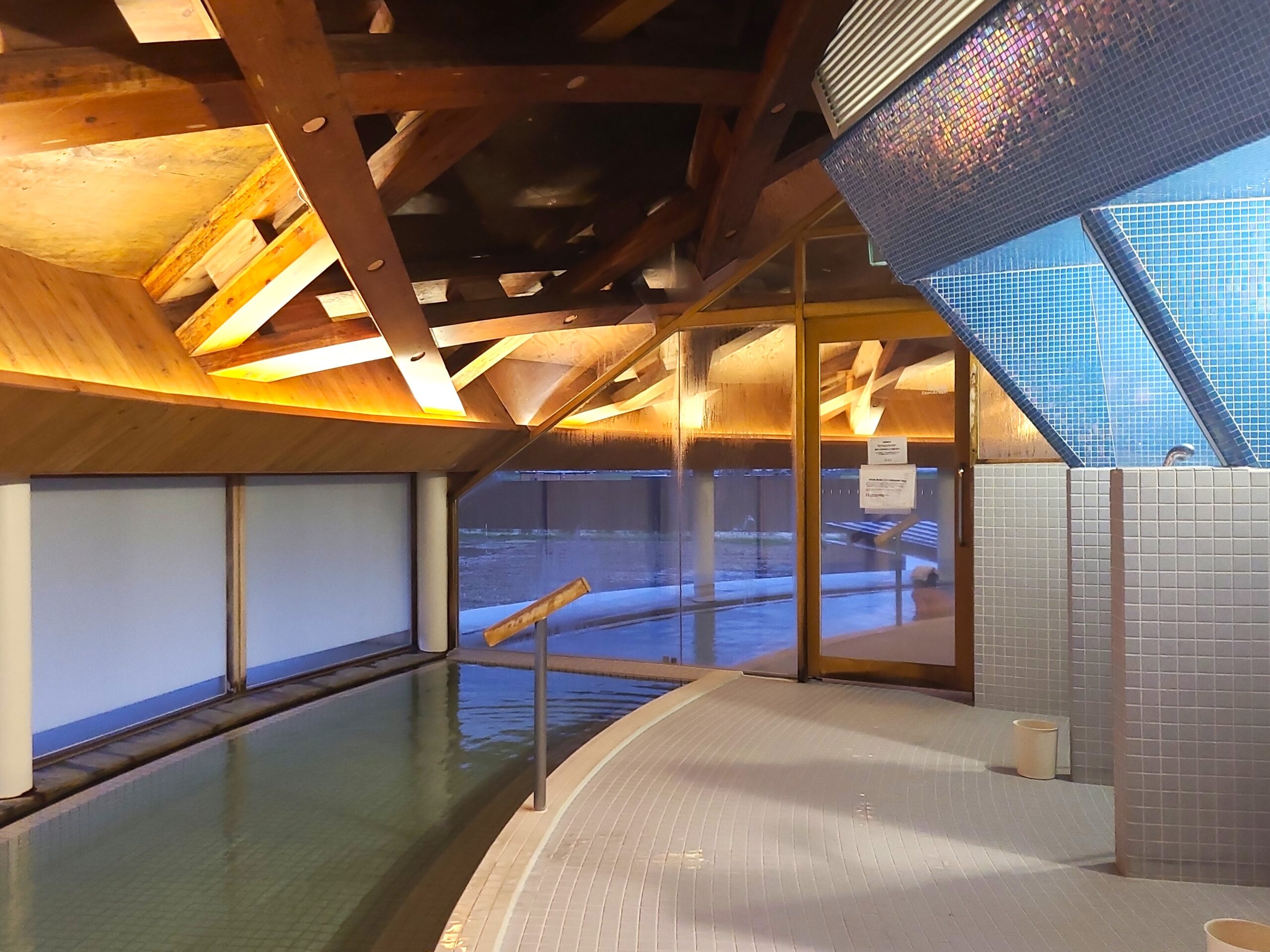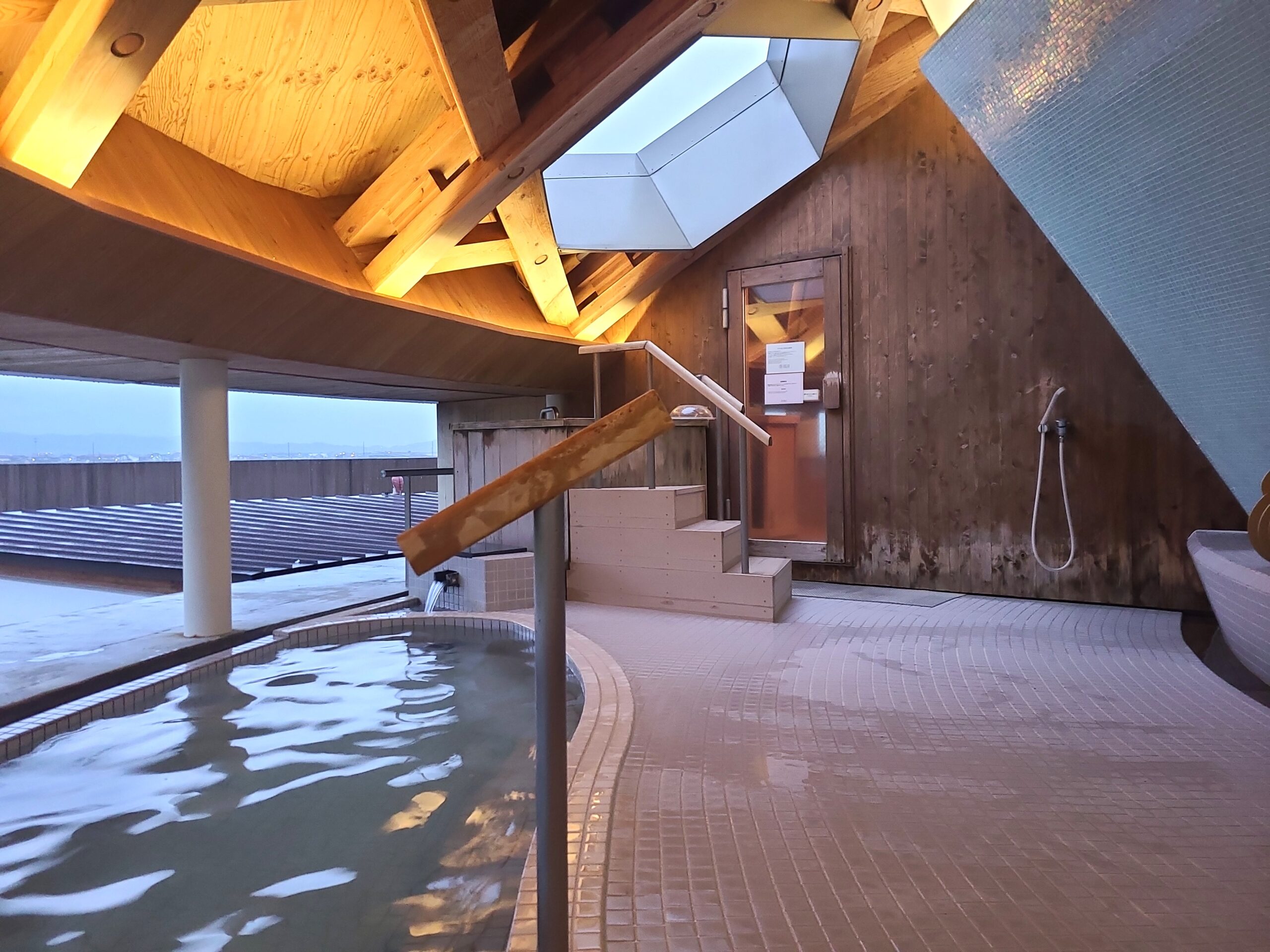そして“朱鷺色の湯”は大浴場。内湯を囲む淡くやわらかい桃色のタイルから命名された「朱鷺色の湯」は木組みで構成される六角形の天井が特徴的です。天窓からは、日中は優しい光が降り注ぎ、夜間は星空を楽しみながらの入浴ができます。