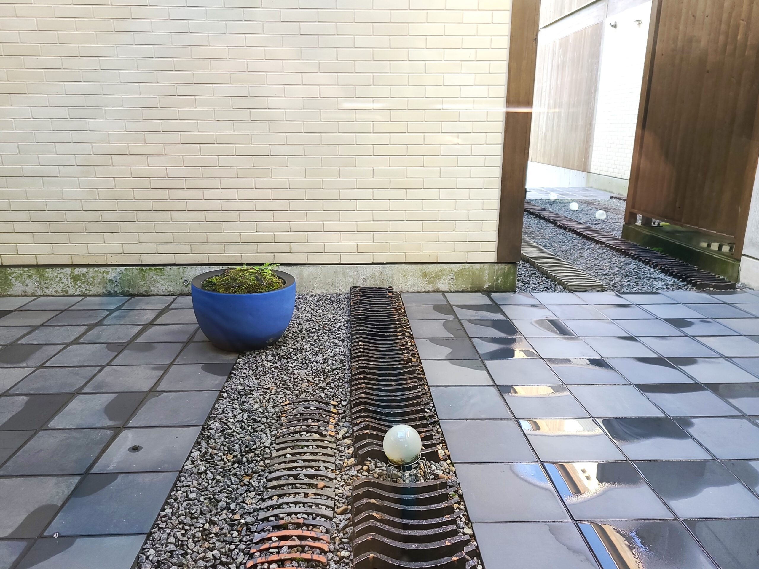 中庭の意匠として2016年に発生した熊本地震で倒壊した家屋の瓦が使われています。被災地での災害廃棄物処理の問題解決の一筋となるべく坂氏のアイデアで、中庭ごとに異なるデザインが楽しむことがでます。