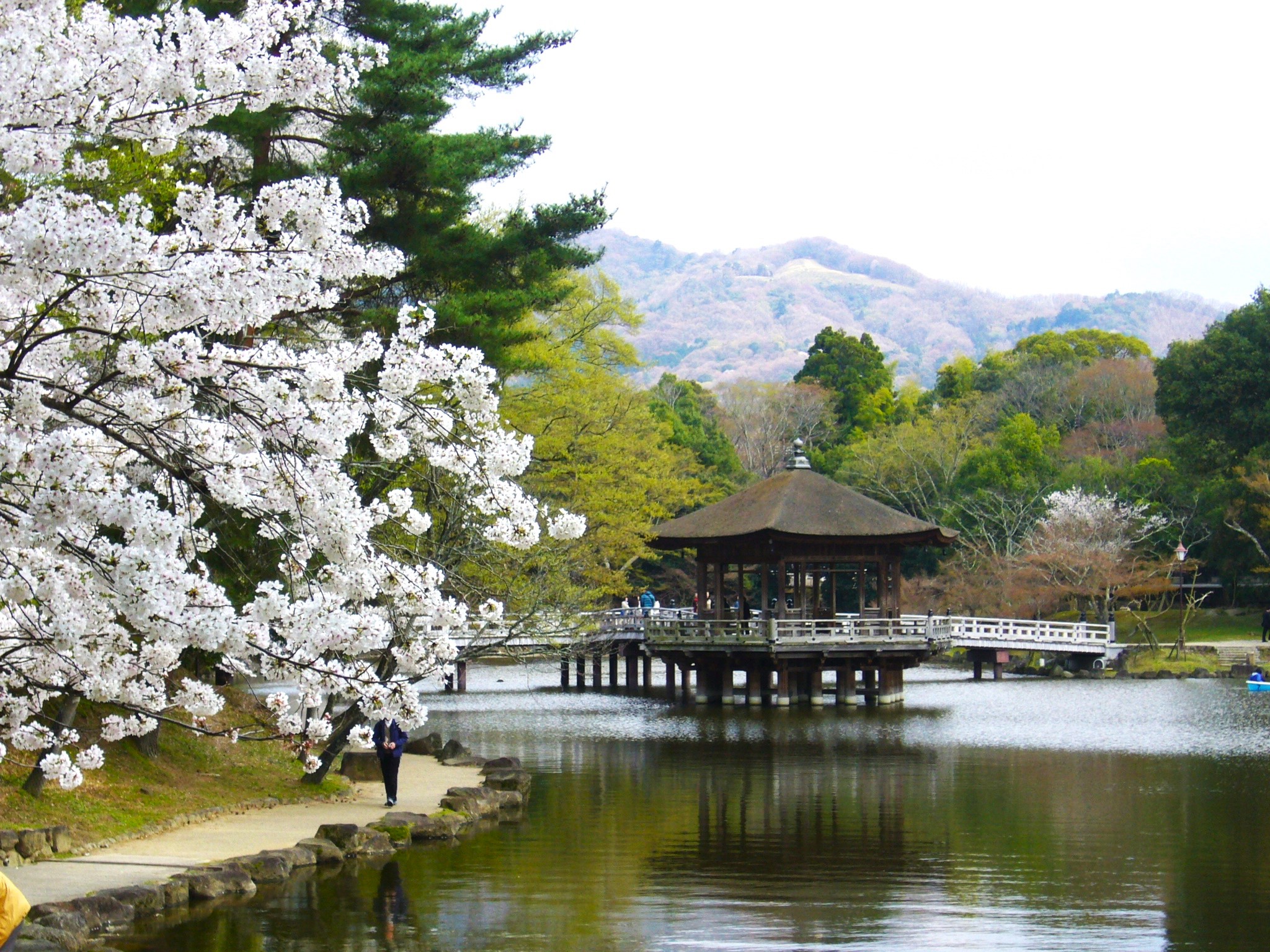 石段を下りきったところに「猿沢池」がある。周囲に柳が植えられた風情ある池で、もとは興福寺の放生池として天平時代に造られた一周約350mの人工池で、甲羅干しする亀が名物なのだが、今日は目にしなかった。猿沢池には昔から、澄まず・濁らず・出ず・入らず(どこからも水が流入する川はなく、また流出する川もないのに、常に一定の水量を保っている。)・蛙はわかず・藻は生えず(亀はたくさんいるのになぜか蛙はいない。亀や鯉が食べてしまうのか藻も生えない)・魚が七分に水三分(毎年多くの魚が放たれているので増える一方なので、魚が七、水が三の割合になってもおかしくないのに魚であふれる様子がない。)という七不思議がある。池には天平時代に帝の寵愛が衰えたことを嘆いた春姫という采女が身を投げたとの「采女伝説」も残っている。池の南東には、入水する時に衣服を掛けたという衣掛柳の石碑があり、対岸の北西には采女神社がある。