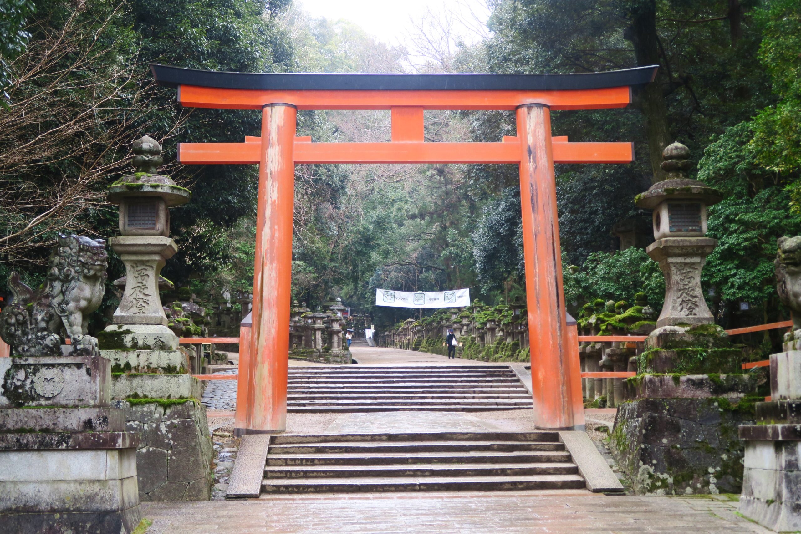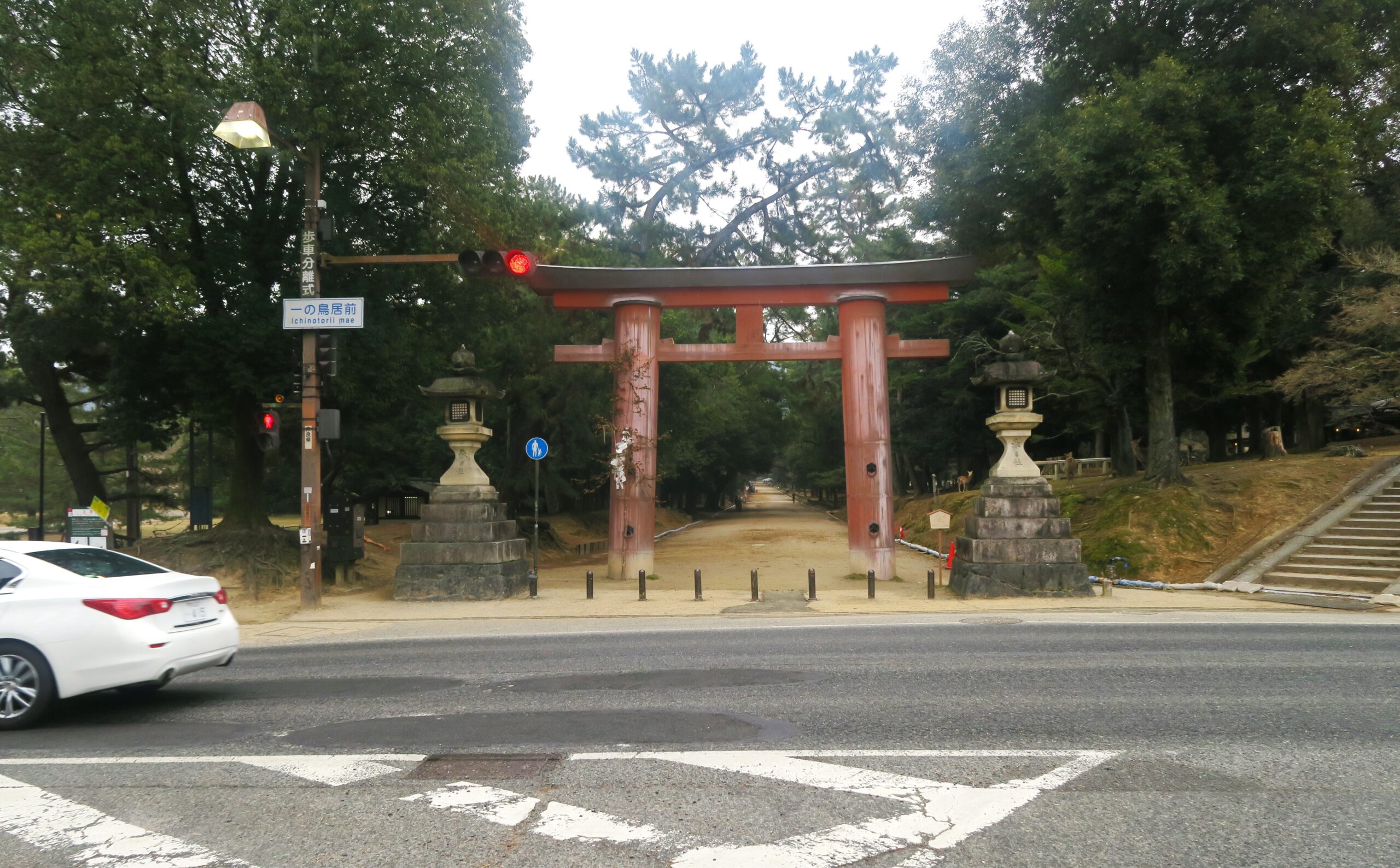 次に「春日大社」に向かいます。室町時代の再建時に興福寺に建てられた風呂である「大湯屋」の横を通り、春日大社の表参道入口に立つ典型的な春日鳥居の「一の鳥居」のある交差点をわたる。創建は承和3年(836)と伝えられ江戸時代に再建されている。(木造の日本三大鳥居で国宝)