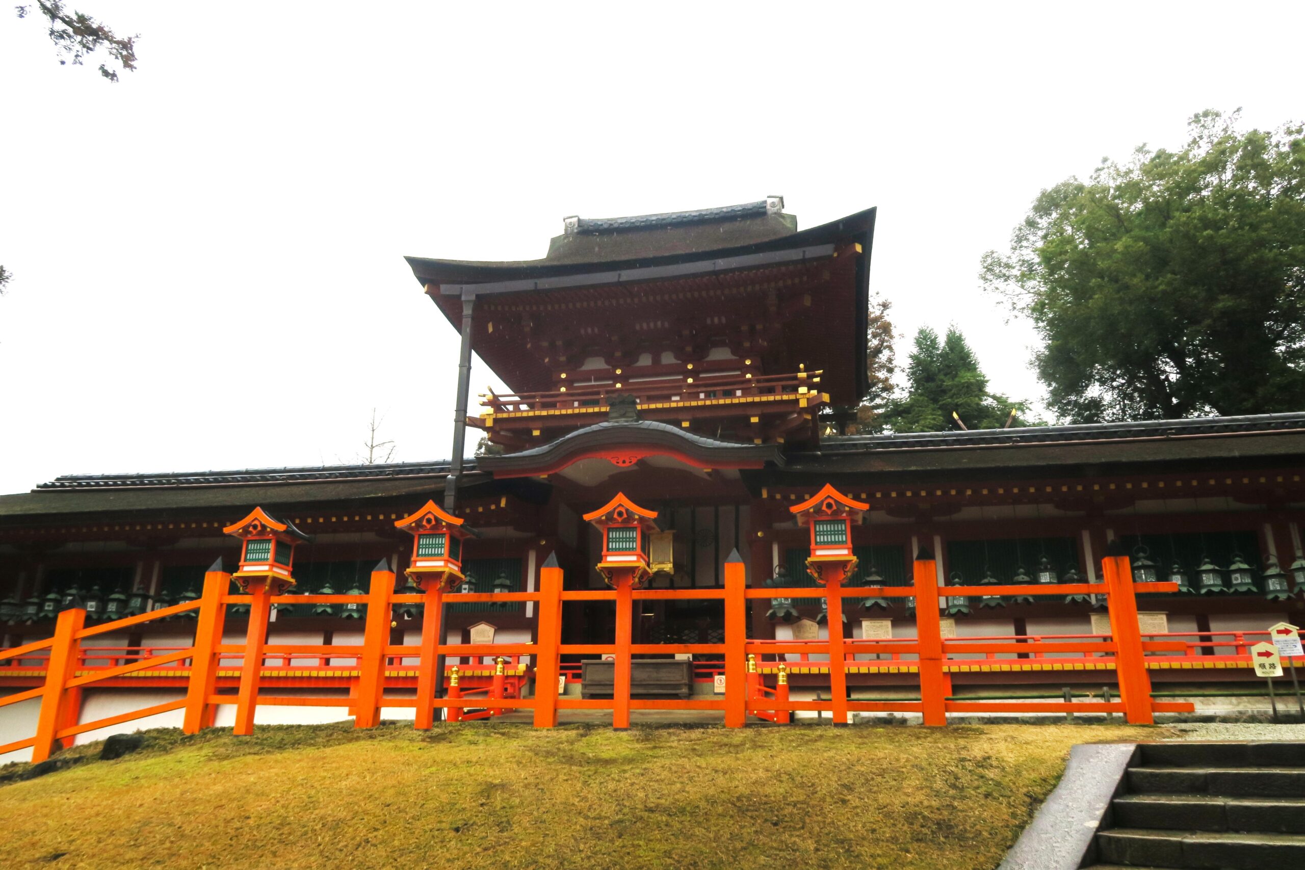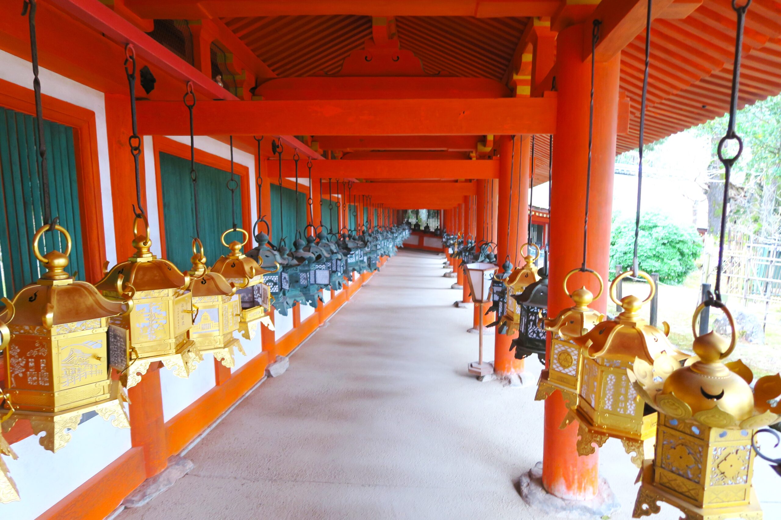 春日大社の社殿は自然の地形そのままに建つ。特に南門を入った東回廊は、できるだけ整地をせず、建物を土地に合わせるという心から山の地形をなぞるため連子窓や影向門はちょっと不自然な平行四辺形になっています。東回廊から中門への御廊には、釣灯籠が1000基も吊られ、なんともフォトジェニックな光景です。中門向かって右の回廊には藤堂高虎、直江兼続、宇喜多秀家など名だたる武将が奉納した灯籠が並ぶ。