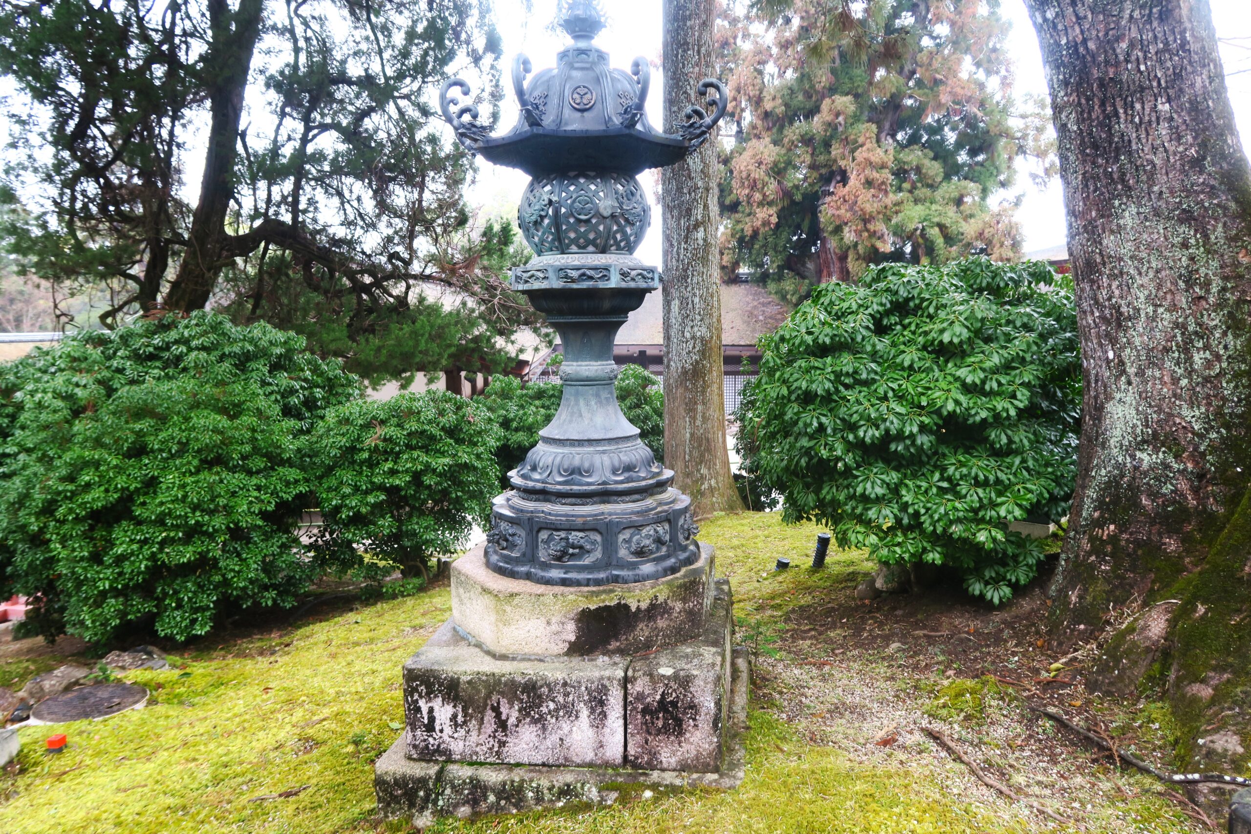 桂昌院や島左近、直江兼続らが奉納した燈籠や寝鹿の燈籠、鹿のお尻が刻まれた燈籠まであるので、参拝の折に探してみてください。写真は桂昌院(本庄宗子)奉納の灯籠。鋳銅製で各所に見事な彫金金物をあしらい、徳川家の三葉葵紋と本庄家の九ッ目結紋が配されています。銘文に元禄十年(1697)正月吉祥日 本庄氏宗子とあり、本庄氏が藤原氏の流れであり、氏神への崇敬として灯籠を奉納したと考えられます。