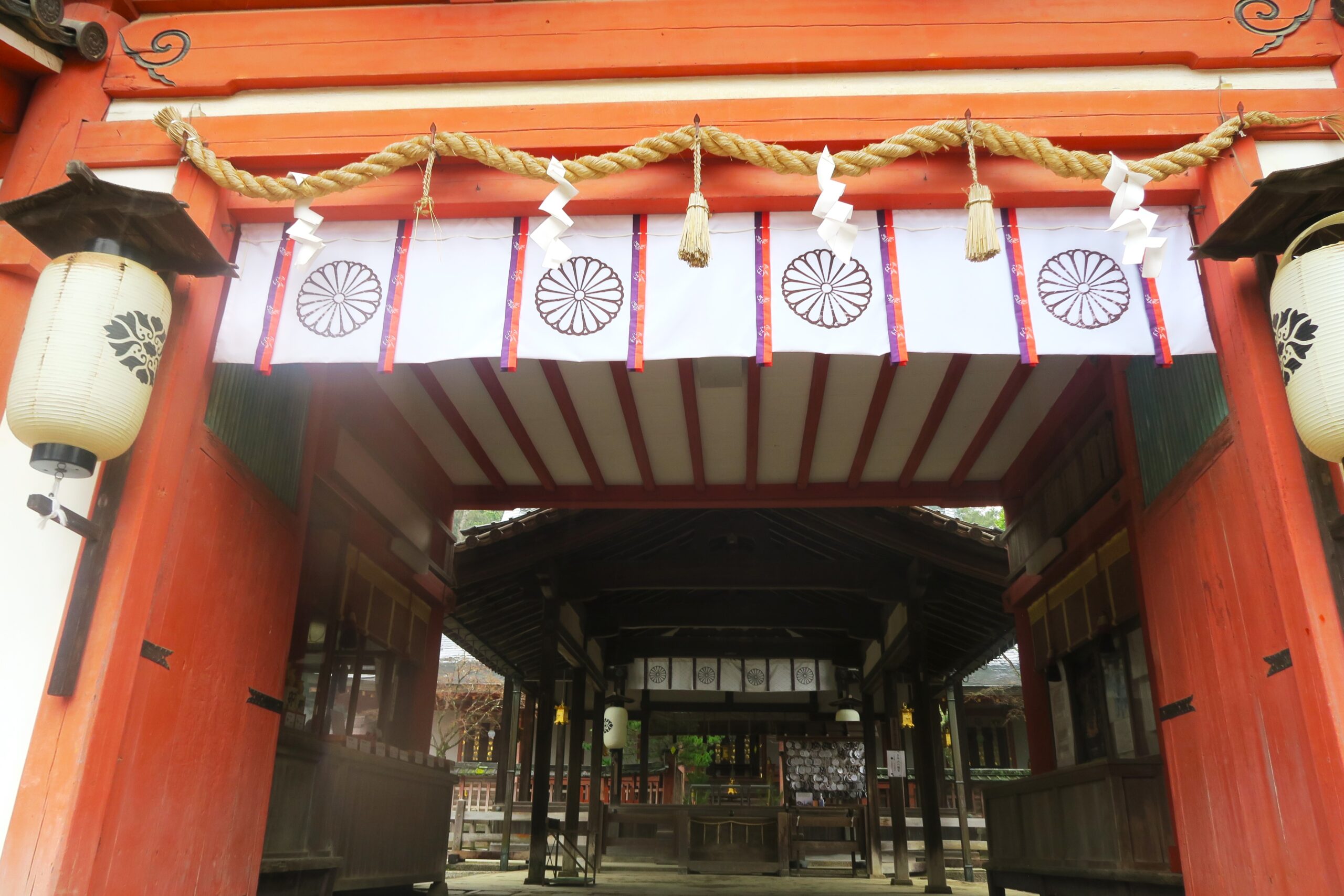 本殿の前にある中門は左右に御廊が並び、繊細で優美な姿が印象的。丹塗りの典雅な中門のさらに奥まった本殿に神々がおいでになられる。