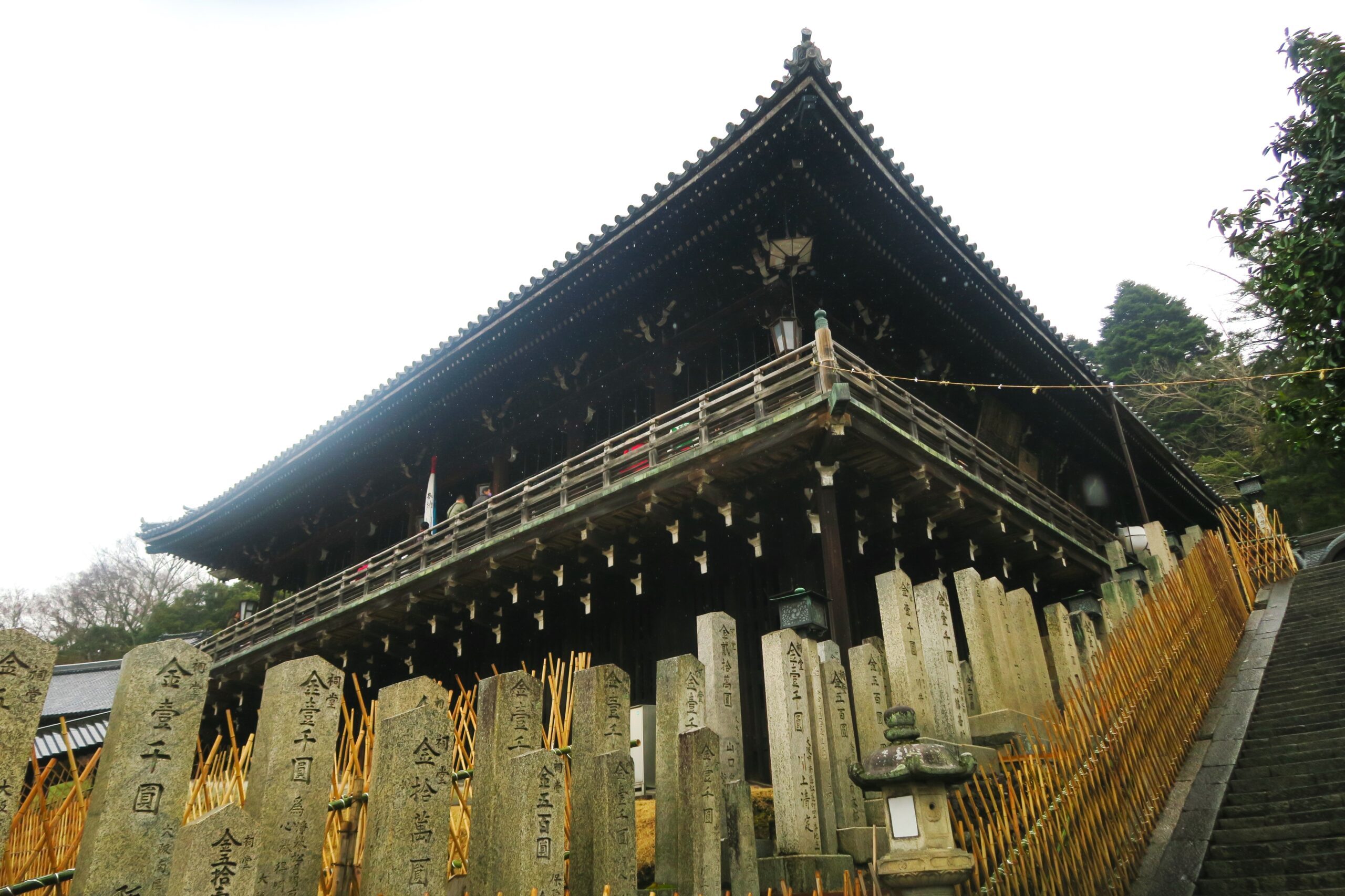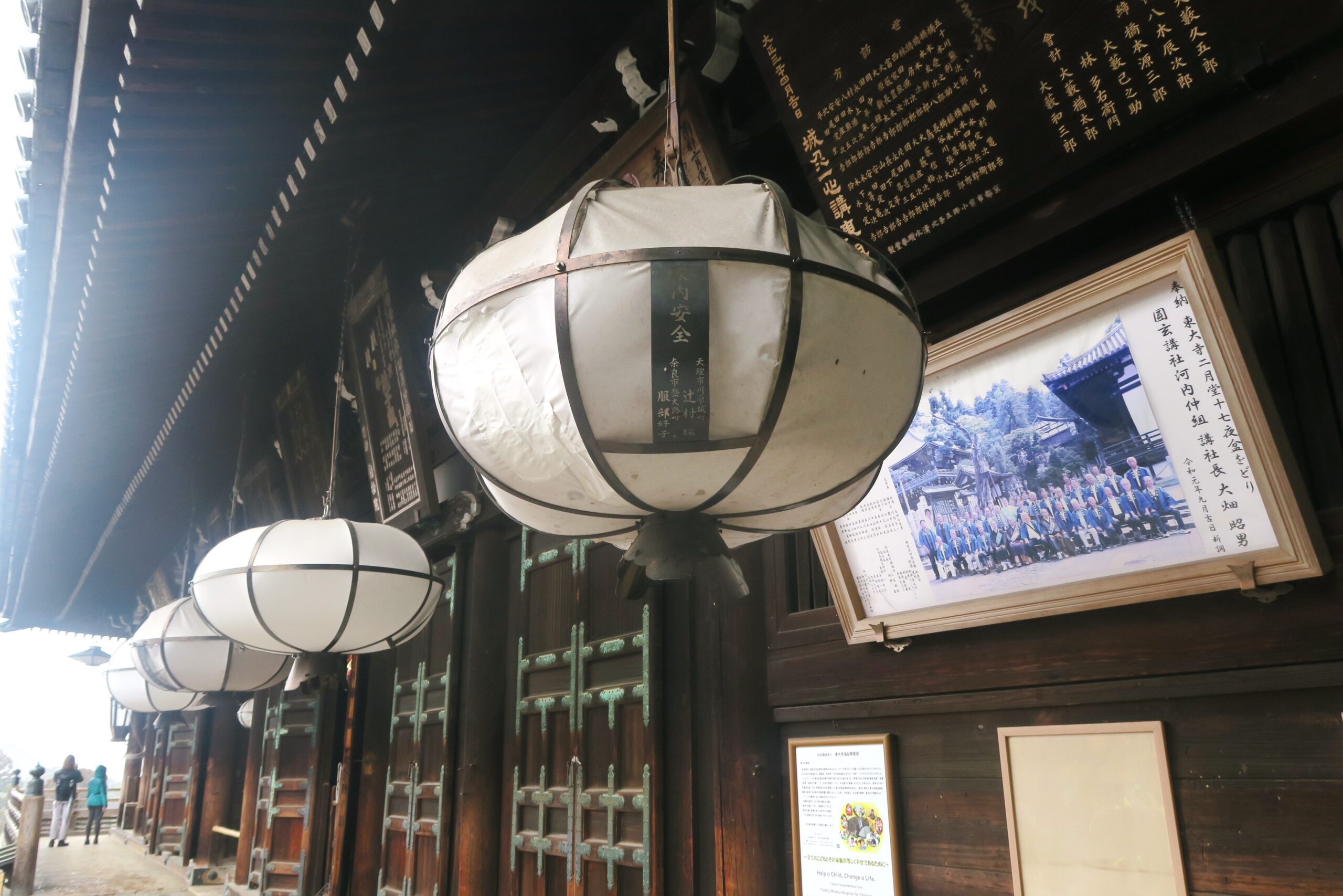 お堂の舞台付近からは、大仏殿の屋根の先に広がる奈良市街や奈良盆地の山々を眺めることができます。