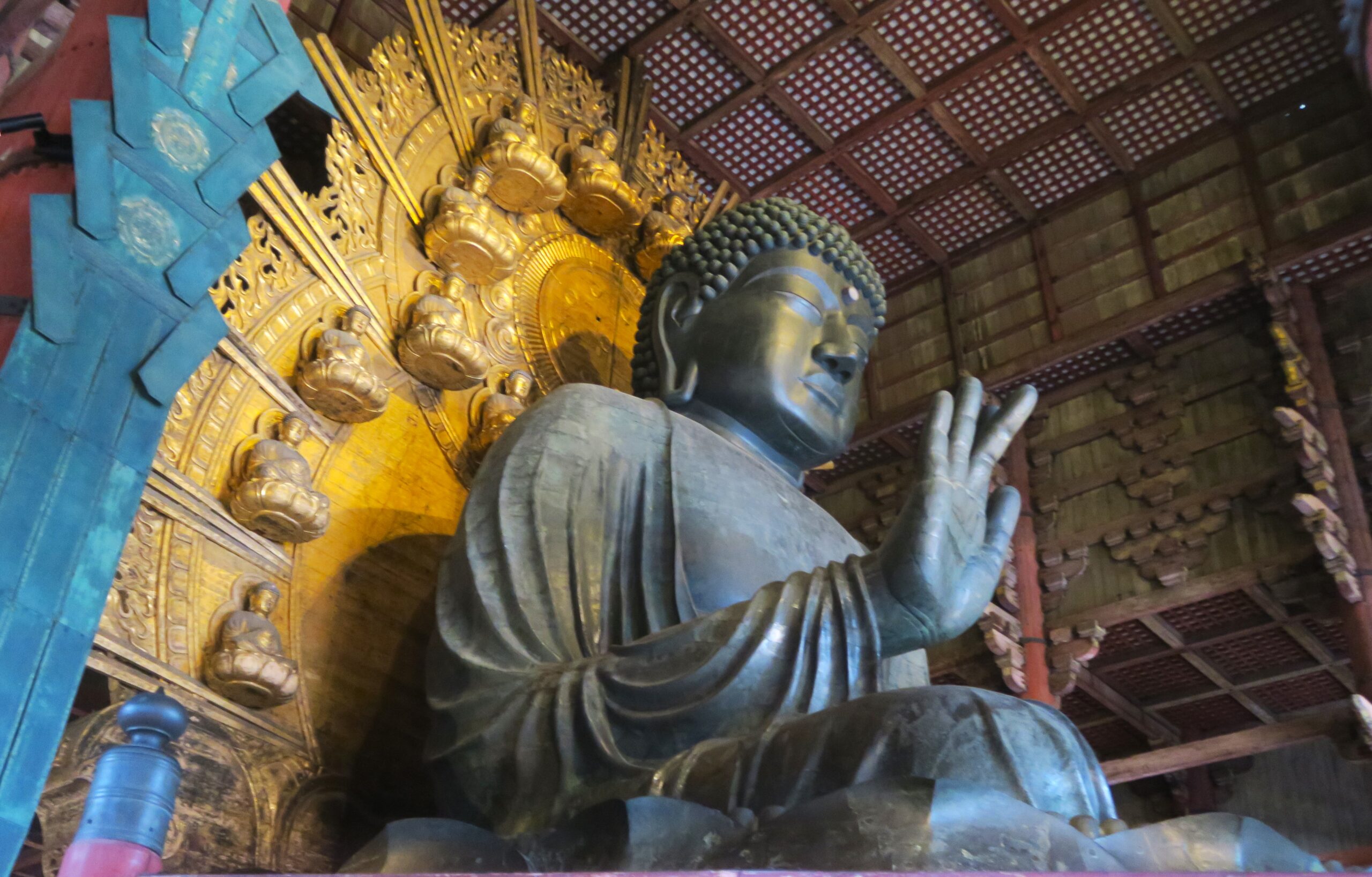 大仏殿には752年に開眼したご本尊“奈良の大仏さん”で有名な像高約15mの本尊・慮遮那仏坐像が安置され、前に立ち見上げるとその迫力に圧倒され、存在感の大きさに感動させられます。まさしく「世界を普く照らす、光輝く仏」です。