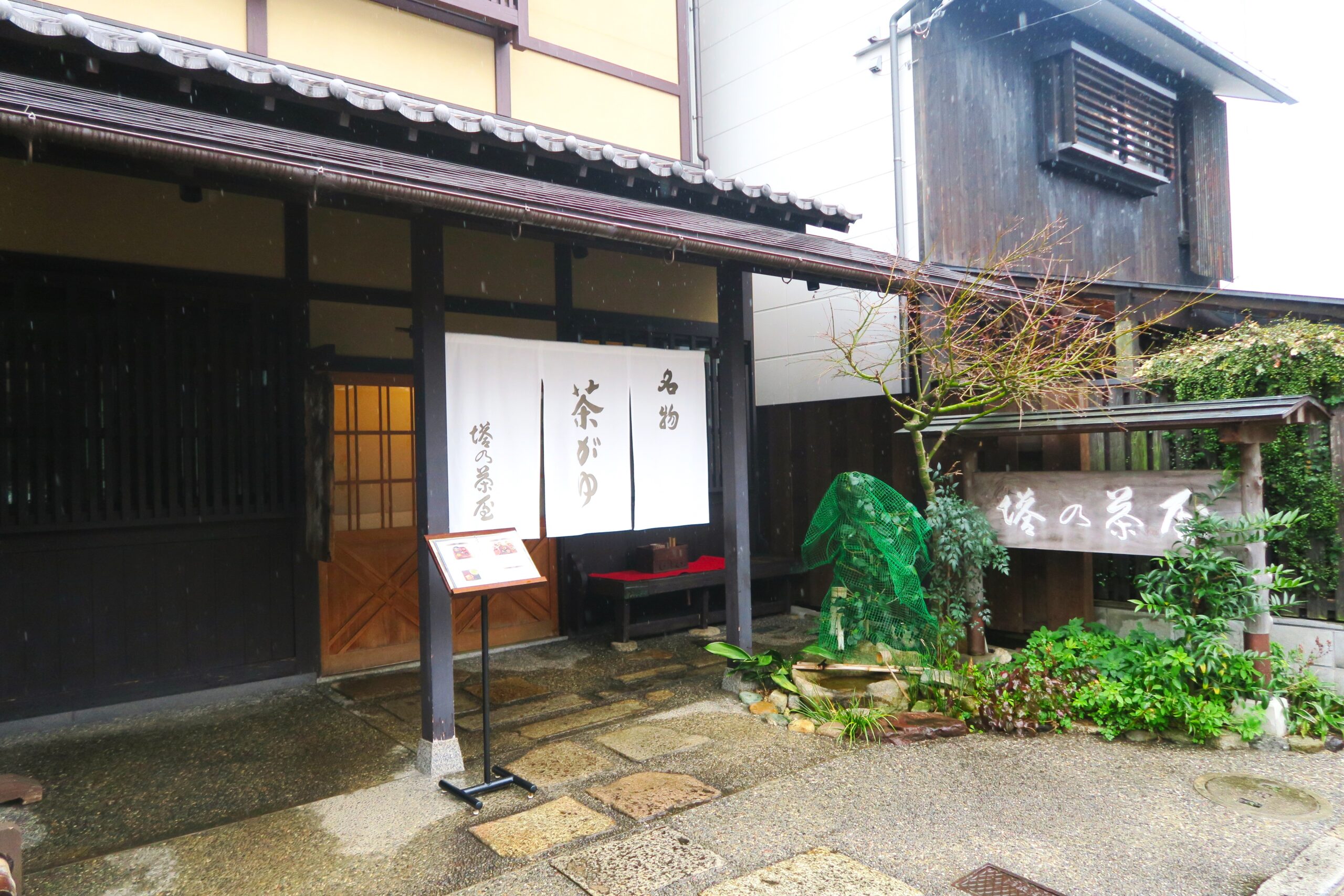 迷路のような路地を歩いてみれば、社寺や資料館、老舗、町家を再生したレストランなどがふと現れます。道すがら目を引くのは、家々の軒先に吊るされた魔除けの赤い「身代わり猿」。庚申信仰が息づくこのまちらしいシンボルです。そんなならまちにあるのが茶粥の名店「塔の茶屋」です。もとは興福寺五重塔のたもとにあったお店は旧店舗の古材を利用し名店らしい端正な表構え。