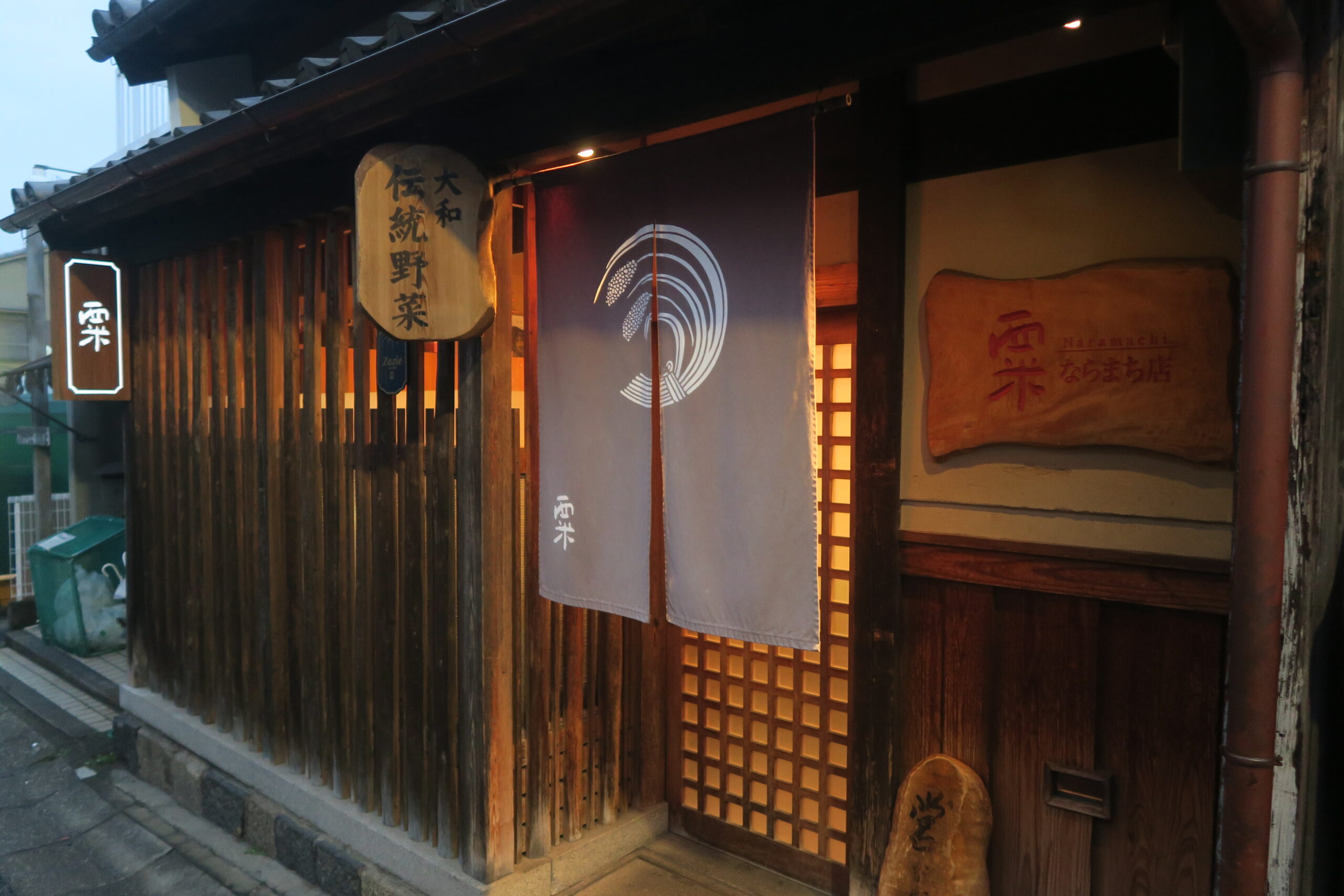 夜は“ならまち”にある「粟ならまち店」で。奈良の風土から生まれた大和伝統野菜は、もともと農家の自給用で、流通には乗らなかった野菜を県が品種の育成を行い、特産品として認証したものです。今では県内の多くの飲食店が扱っていますが、その先駆けと「いえるのが、大和野菜ブームを牽引する農園レストラン「清澄の里 粟」です。「粟ならまち店」は、2009年にオープンした姉妹店で地元奈良の無農薬野菜を中心とするコース料理がいただけます。築約140年の古民家を改築したお店は、間口が狭く、奥に長い、ならまちの典型的な町屋様式で、格子戸をくぐり、土間を通って奥の客席へ。