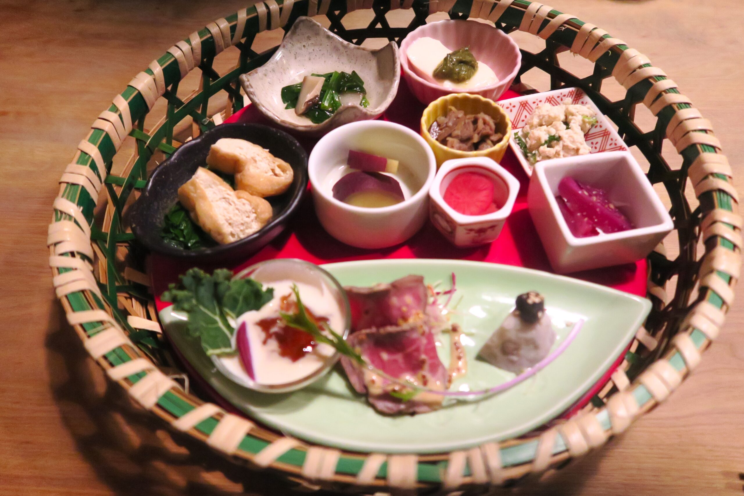 「大和牛と野菜」コースは、前菜に大和牛のローストビーフと大和まな(葉菜類)、大和いもなどの「大和の伝統野菜」をはじめ30種以上の野菜を使った彩豊かな料理がずらりと並んだ籠盛。一品ずつ丁寧に作られる料理は、どれも素材本来のうま味や甘みが際立っています。料理に使われている野菜について、畑でのエピソードを交えて説明してくれるのも人気の所以。