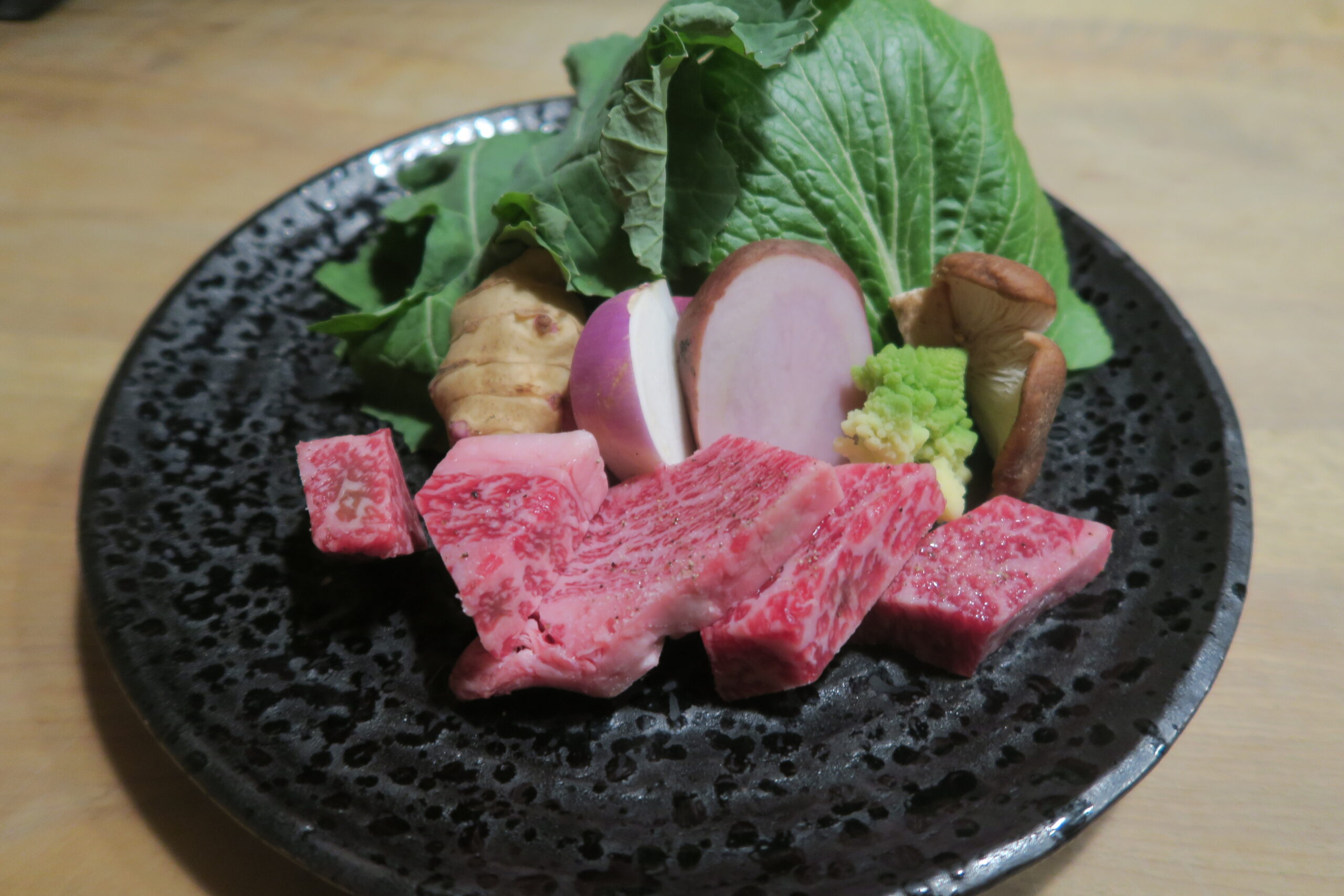 メインディッシュには大和牛のリブロースを陶板焼きで。味が濃く脂身あっさりの大和牛のお肉も絶品です。