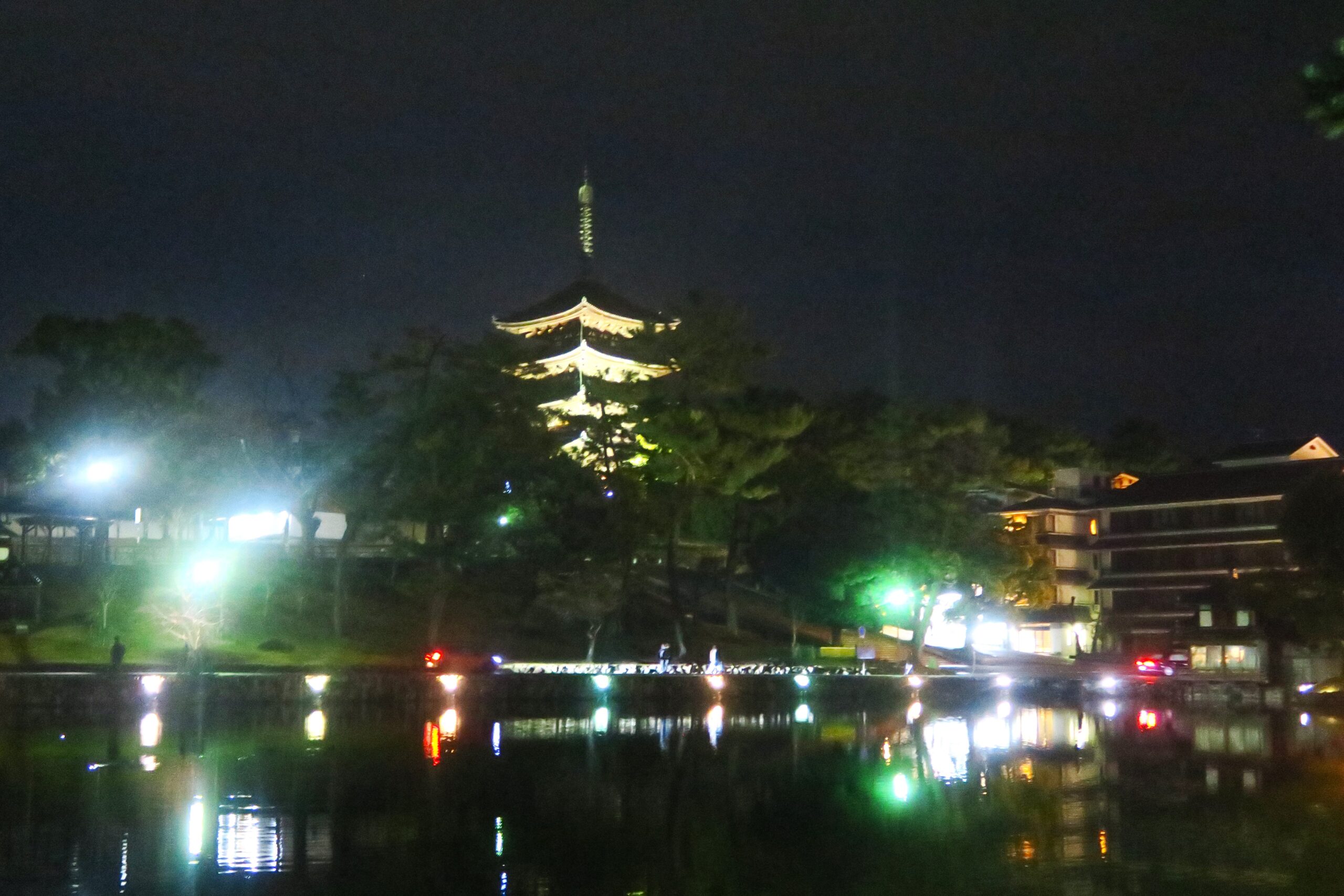 猿沢池から見上げるライトアップされた興福寺五重塔が、夜の静寂の中で水面に姿を映しています。