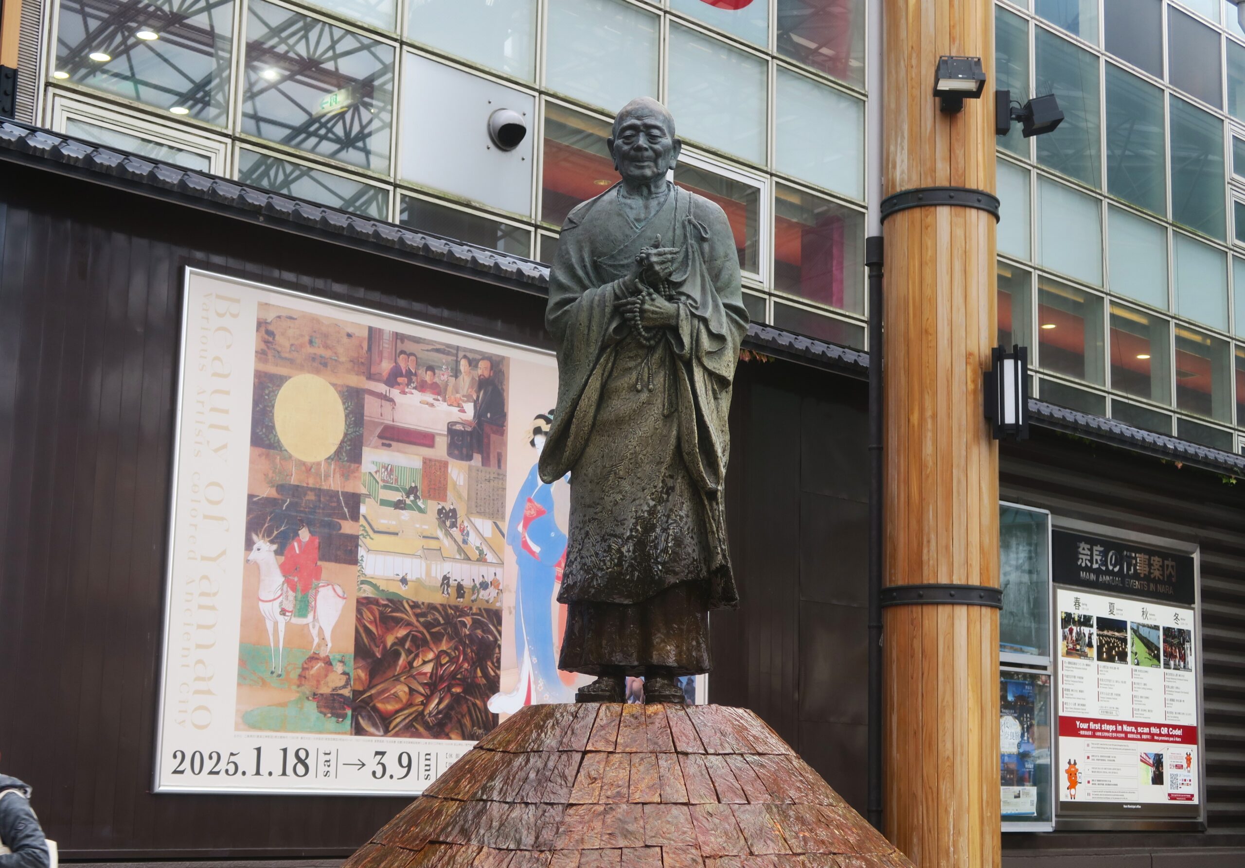 古都奈良の観光は近鉄奈良駅から。地下にある近鉄奈良駅から、階段を登って地上に上がると、奈良での待ち合わせの場所で知られる行基広場にでます。円すい形の噴水に立つ行基像は、8世紀の奈良時代み実在したお坊さんで、民衆が仏教の教えを請うことを禁じていた時代に、禁を破って身分を問わずに広く仏法を説き、民衆から圧倒的支持を得ていたことから”行基菩薩”と呼ばれ崇拝されていた。