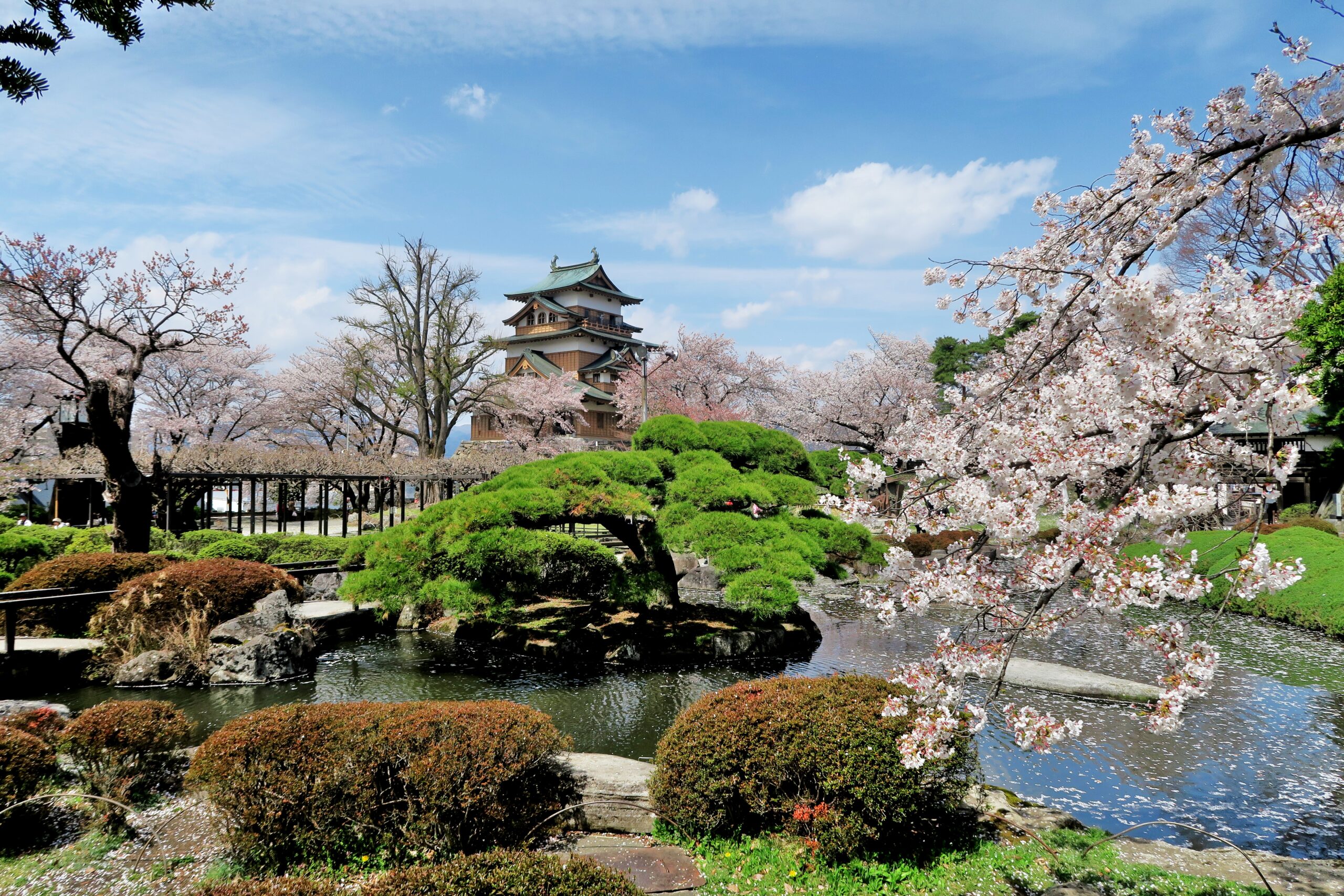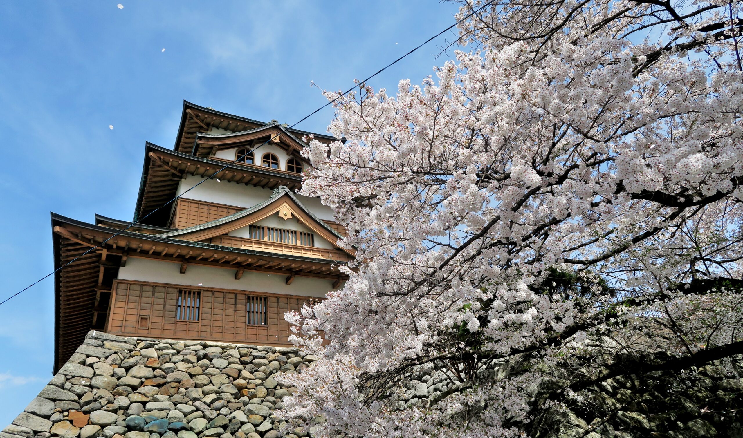 春には三層の天守閣を囲むように園内をさくらやフジの花が彩ます。ソメイヨシノや枝垂れ桜、八重桜など種類が多く、長い期間楽しめます。秋には紅葉が見事で、芝生や池があり、四季折々の花や景観を眺めながら休日のひと時を過ごすには絶好の場所です。