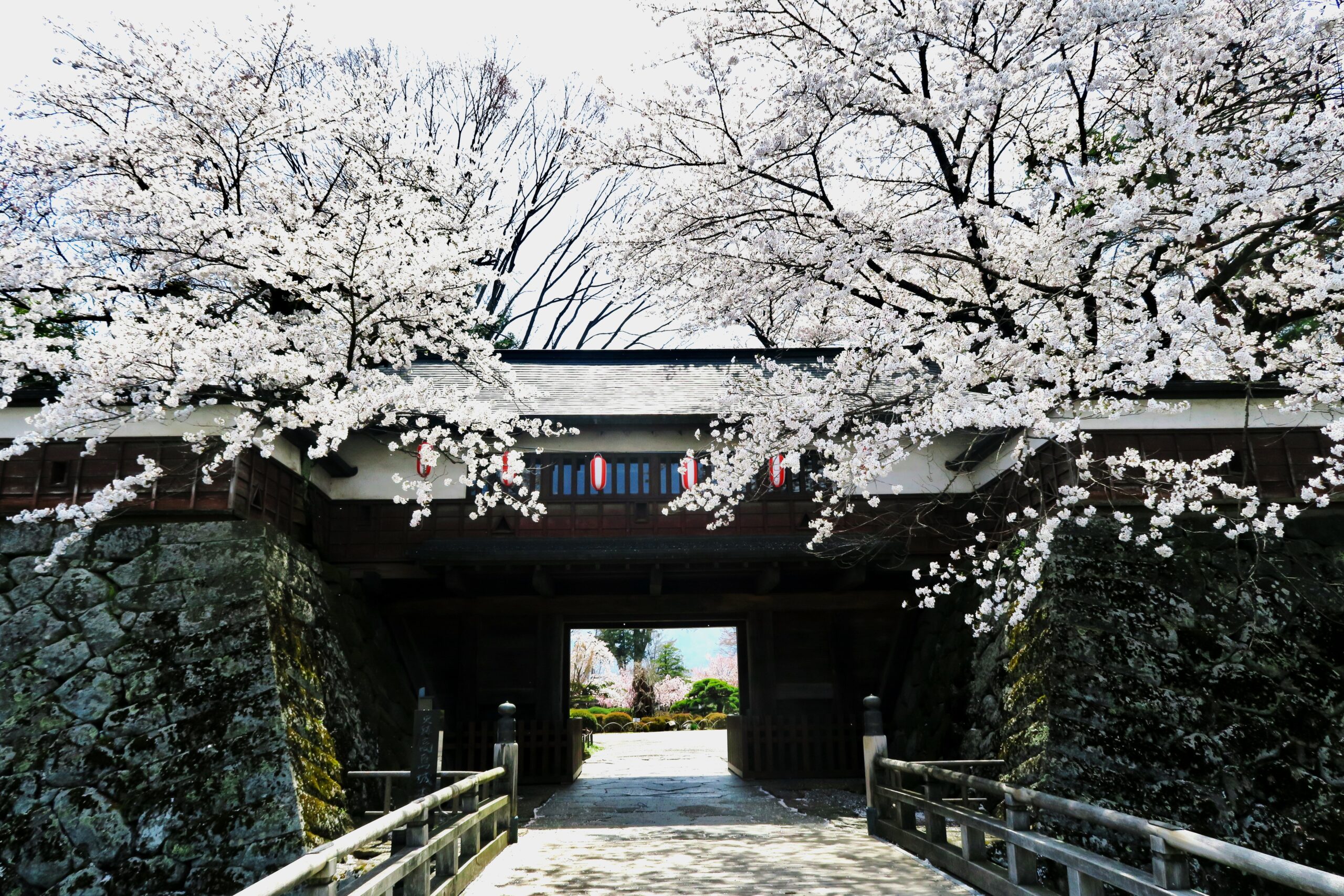 総石垣で8棟の櫓、6棟の門、3重の天守などが建て並べられ近世城郭の体裁が整えられましたが、軟弱な地盤のため、木材を筏上に組み、その上に石を積むなどの当時の最先端技術が用いられました。城の際まで諏訪湖の水が迫り、湖上に浮いて見えたことから別名「諏訪の浮城」とも呼ばれ、また「諏訪の殿様よい城持ちゃるうしろ松山前は海」と歌われた名城です。その後、関ヶ原の戦いで徳川軍に属した諏訪頼水(頼忠の子)は、慶長6年(1611)家康の恩恵によって旧領諏訪に帰り藩主となり、以後10代に至る270年の間、諏訪氏の居城としてその威容を誇りました。定番のアングル、冠木門と冠木橋と天守のセットを水堀越しで撮影(春)