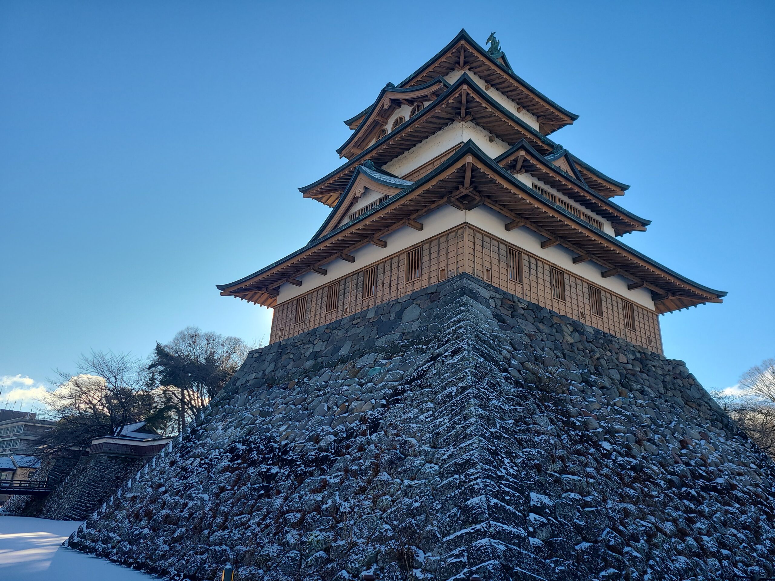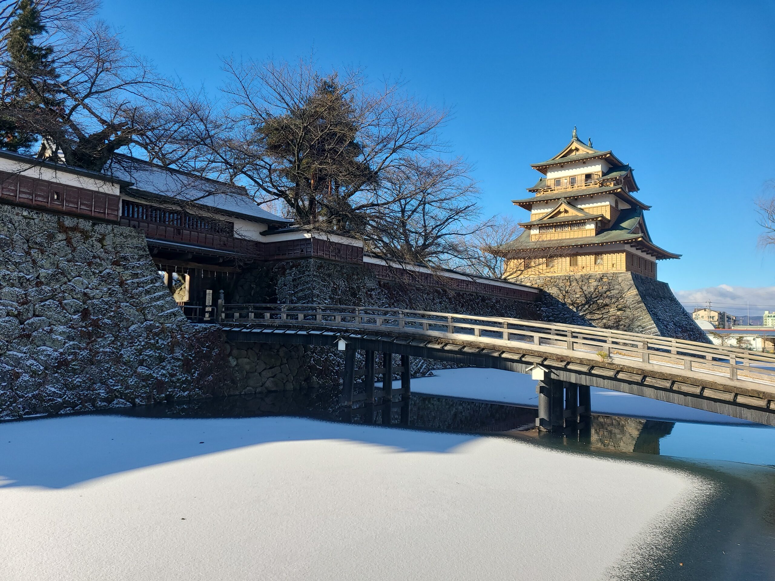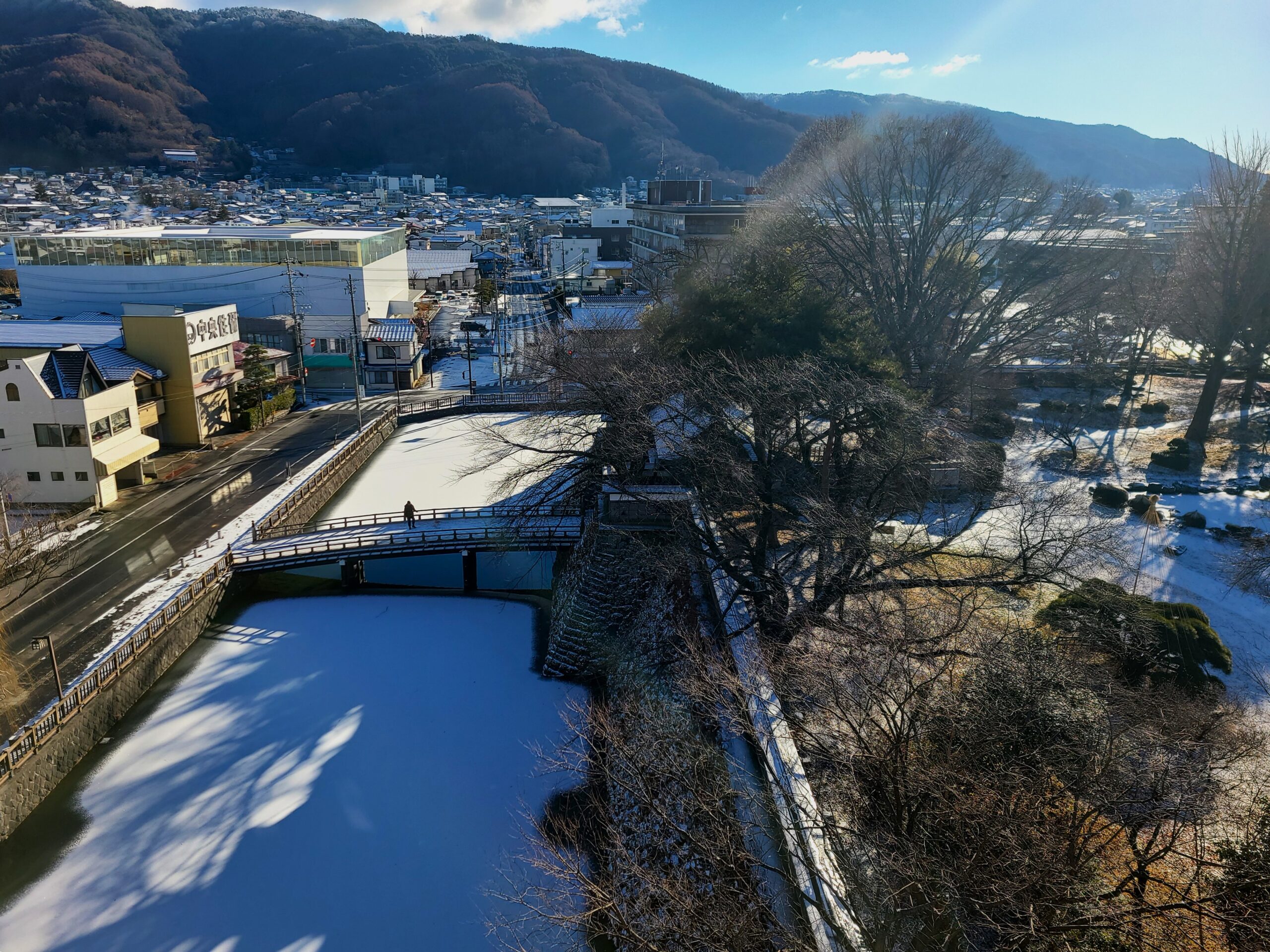 城の北側には城下町が設けられ、甲州街道が中をつらぬく宿場町(甲州道中上諏訪宿)を兼ねていた城下町から城までは、衣之渡川・中門川などの川を堀とし、諏訪湖と阿原(沼沢地)に囲まれた1本の縄手の道しかありませんでした。、大手門の先に北から衣之渡郭、三の丸、二の丸、本丸の順に曲輪が一直線上に連続配置した連郭式で、敵が侵入しても曲輪を一つひとつ陥落させないかぎり本丸にたどり着けません。湖水に細長く突き出して諏訪湖と数条の河川に囲まれた、水を守りとする難攻不落の水城でした。江戸時代初めに諏訪湖の干拓が行われ、水城の面影は失われましたが、浮城の異名を持っていたことから日本三大湖城のひとつに数えられています。※松江城(島根)・膳所城(滋賀) 定番のアングル、冠木門と冠木橋と天守のセットを水堀越しで撮影(冬)