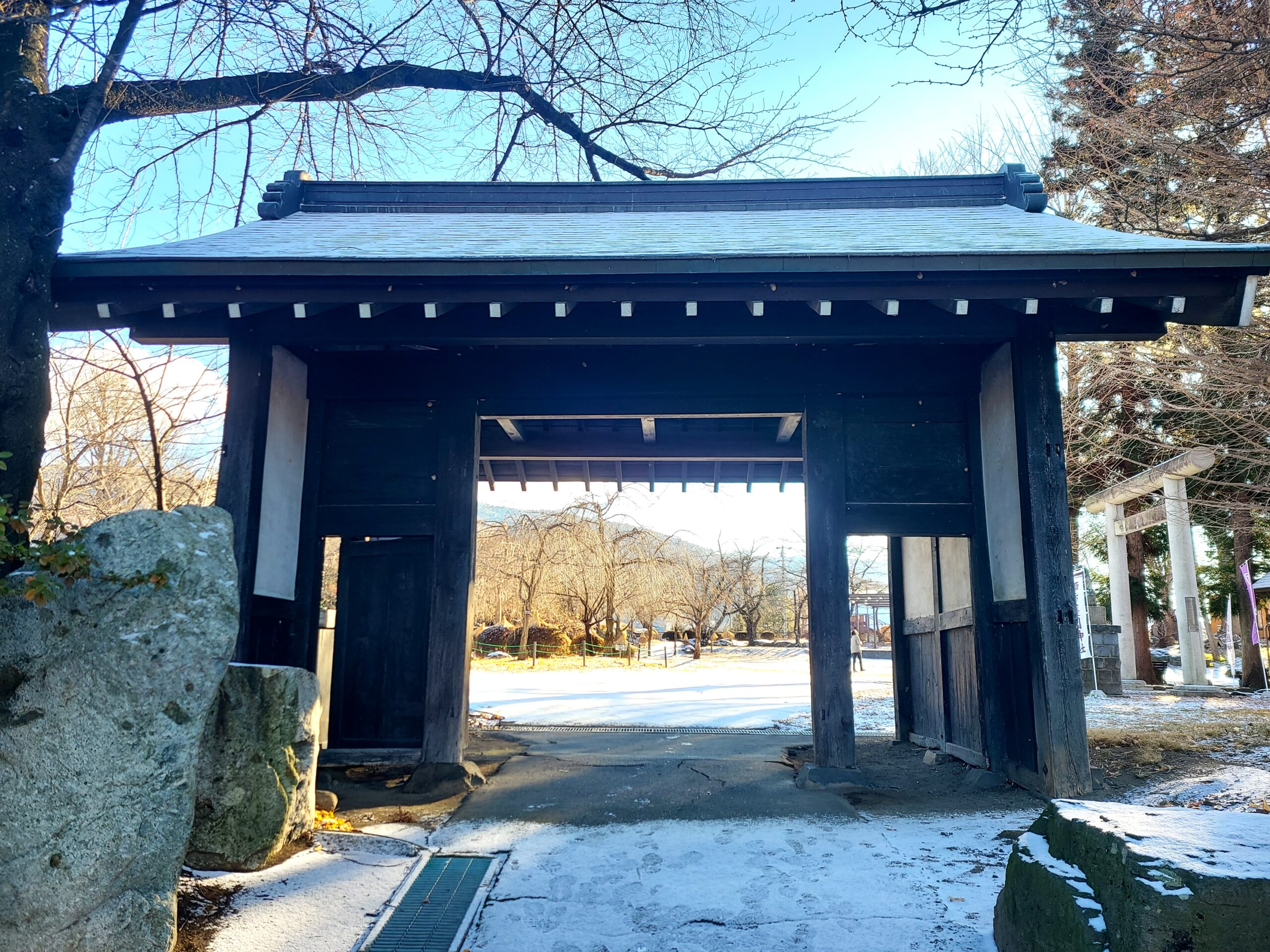 冠木門跡には「冠木橋を渡ったところに冠木門があった。冠木門とは、左右の柱の上部に一本の貫を渡しただけの簡単な門のことをいうが、高島城を描いた絵図からは、楼門あるいは高麗門と呼ばれる屋根付きの門であったことがわかる。おそらく、当初は冠木門であったものが、後に楼門に建て替えられ、名称のみ残されたものであろう」と書かれています。