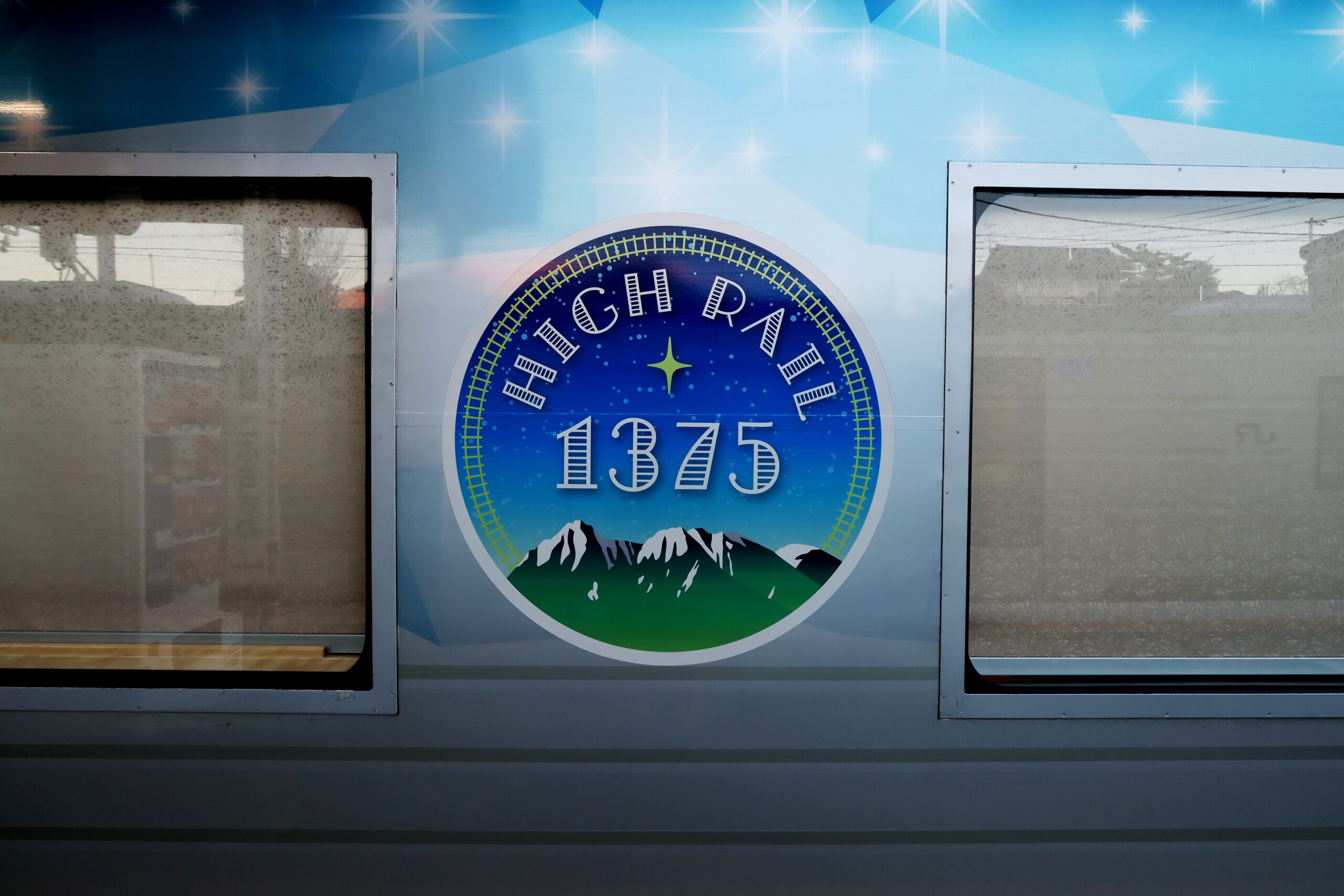 車名は、小海線の特徴の標高の高さを表す「HIGH」と線路の「RAIL」、そして野辺山駅から清里駅間にあるJR線標高最高地点「1375m」を組み合わせて名付けられました。「HIGH RAIL 1375」は2両編成で、車体をキャンバスに見立て、メタリックの金属風な質感を生かしながら小海線の夜空・車窓に映る八ヶ岳の山々が描かれています。ヘッドマークも星空をバックに八ヶ岳と一番星を描き、その中に列車名がデザインされ、周りを線路で囲んでいるオシャレなデザインです。