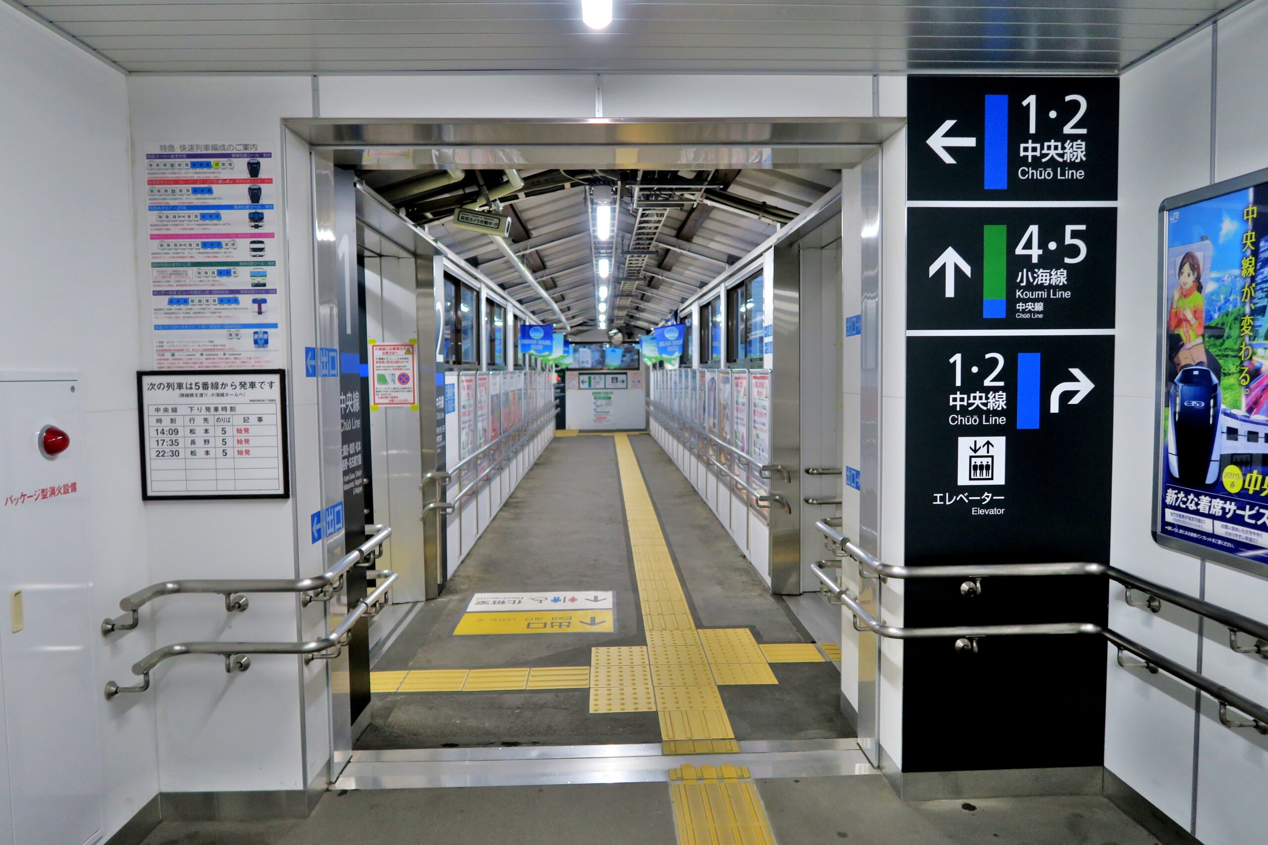 小淵沢駅から「HIGH RAIL 1375」に乗車です。改札口から跨線橋を通りホームに向かいますが、まるで宇宙船に乗り込むゲートのような感じです。これから乗車する観光列車への期待に胸が躍ります。