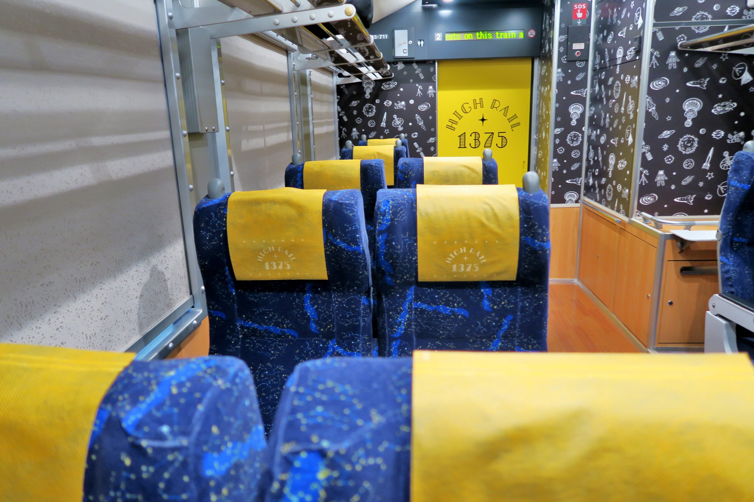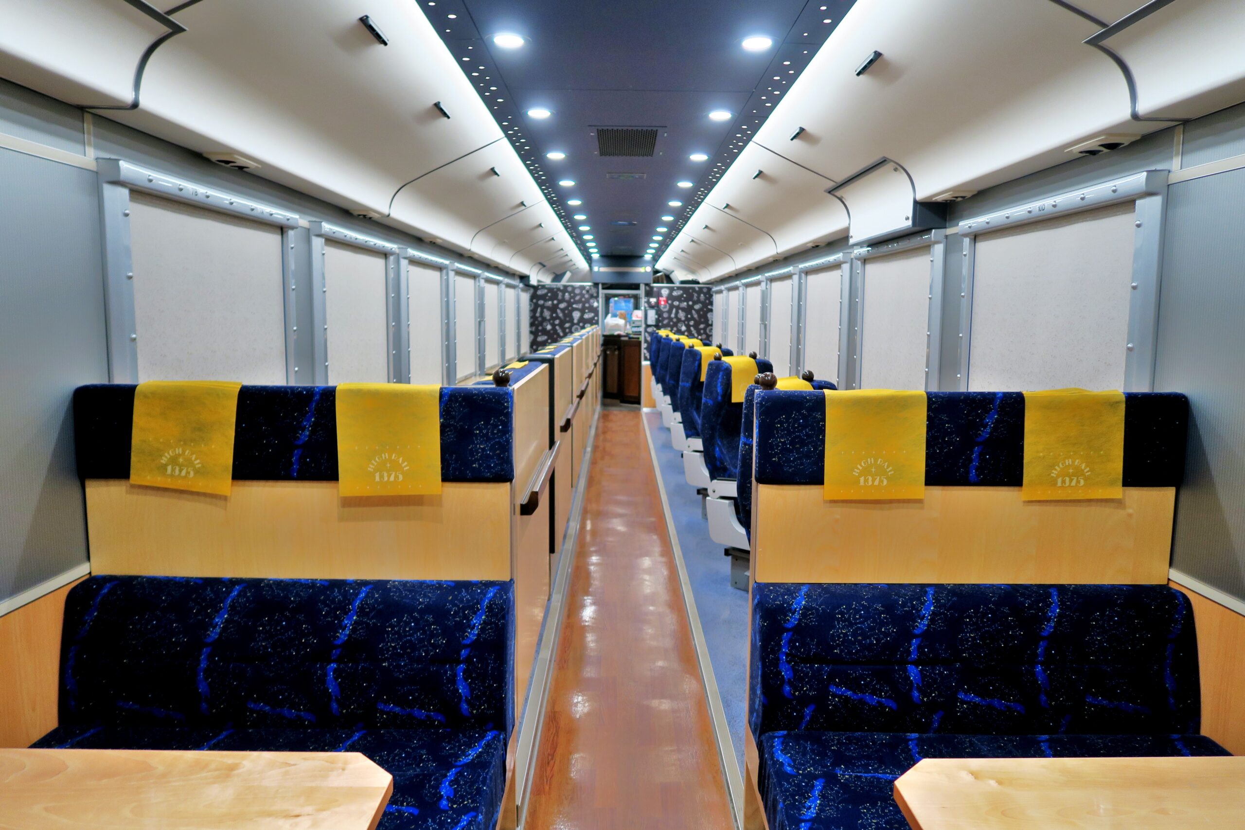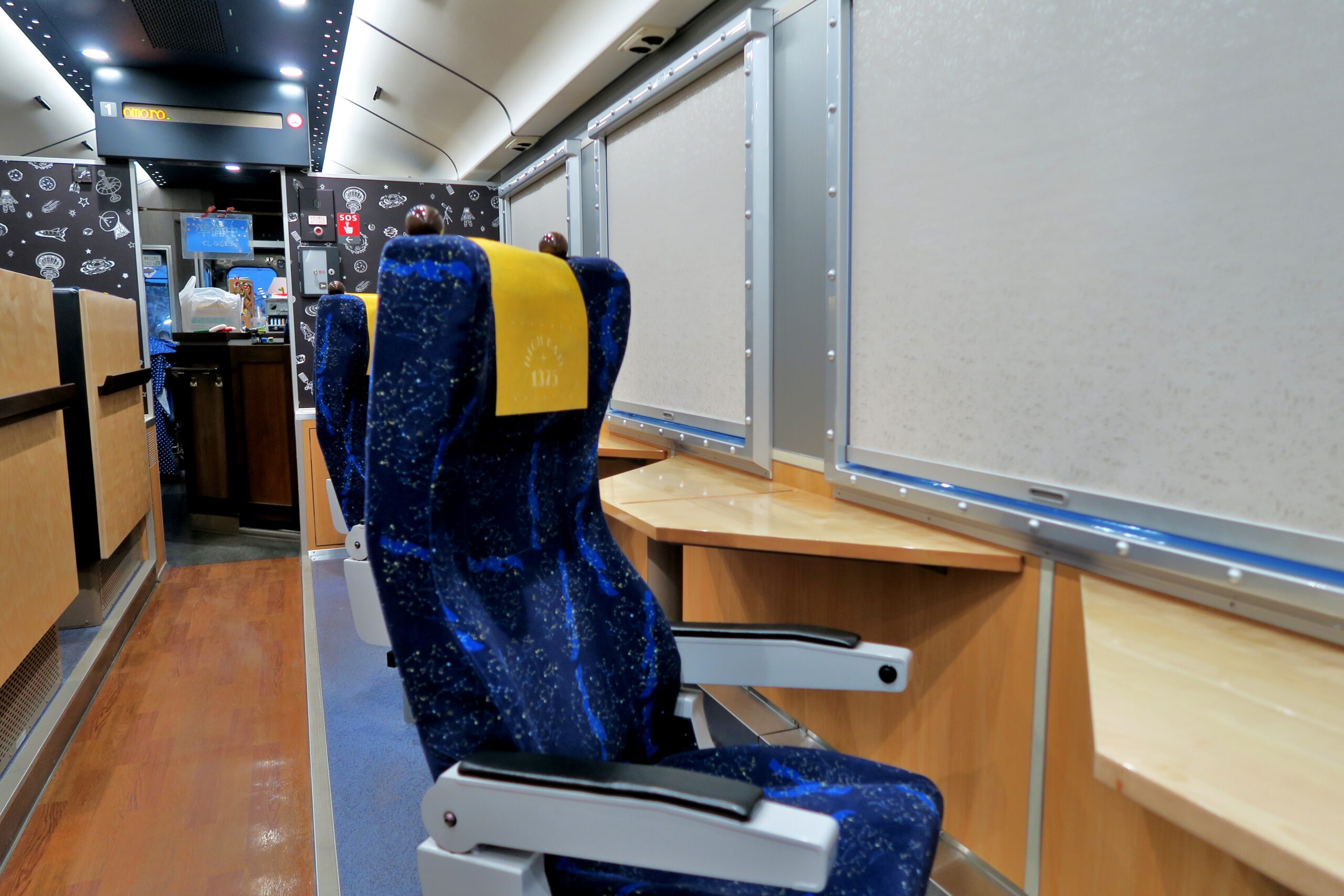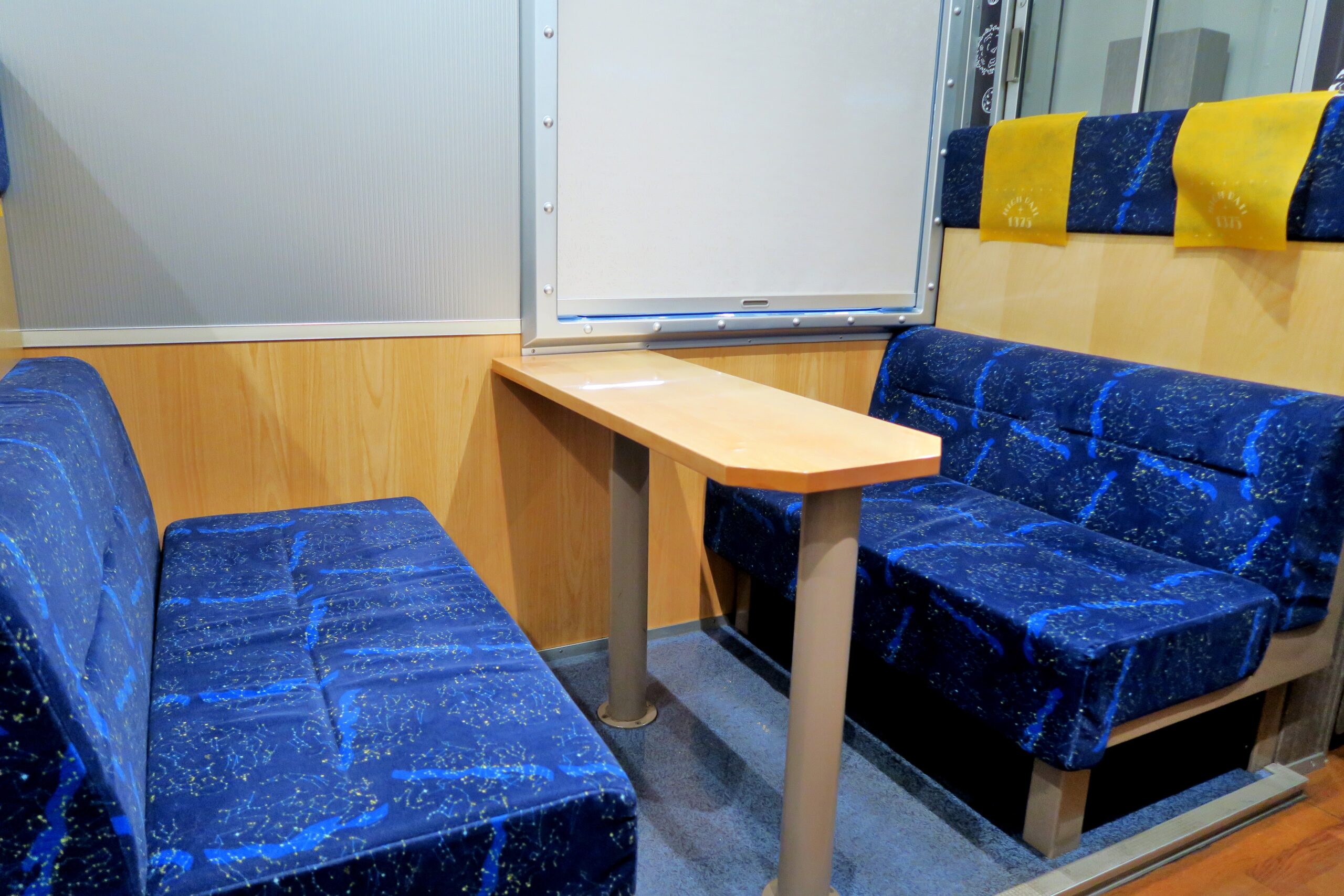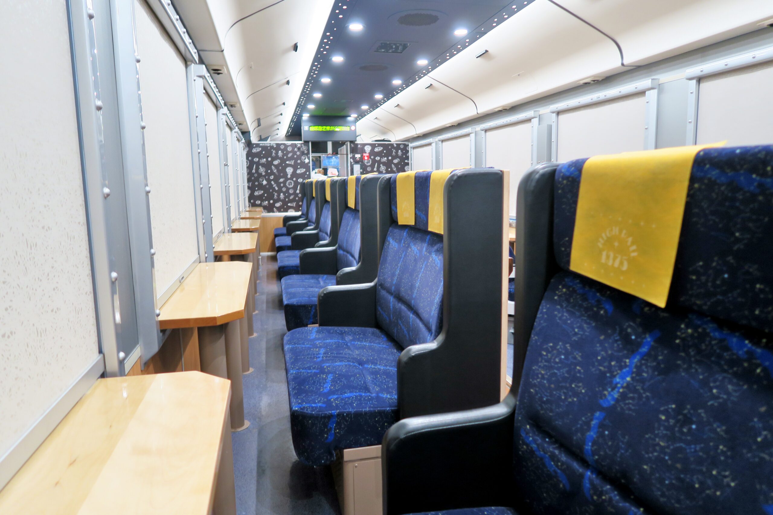 車内の天井は夜空に横たわる天の川をイメージしたシンプルで落ち着いた感じに仕上がっています。間仕切りは黒地に宇宙船や宇宙アンテナ等が漫画チックに描かれた黒板風の壁面になっているのが楽しめますね。シートもロゴデザインをアクセントに四季の星々を夜空の青地にあしらい、星をイメージした黄色のヘッドカバーが備えられています。星座柄の席に座れば、気分は『銀河鉄道の夜』。また車内Wi-Fiによるオリジナル車内コンテンツの配信が行われていて、季節の星座や沿線案内、高原を駆け抜ける車載カメラ映像がスマホで楽しめますよ。