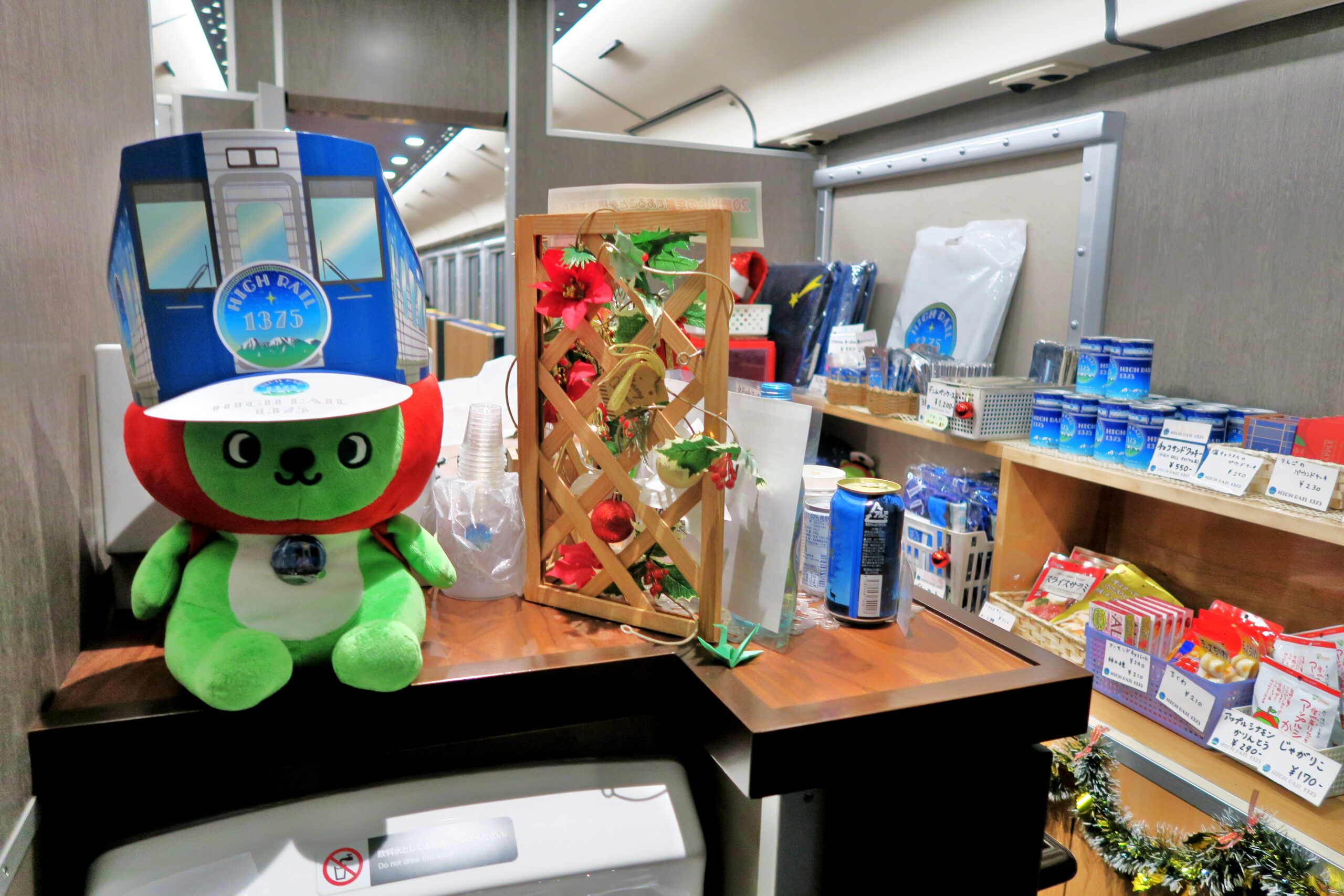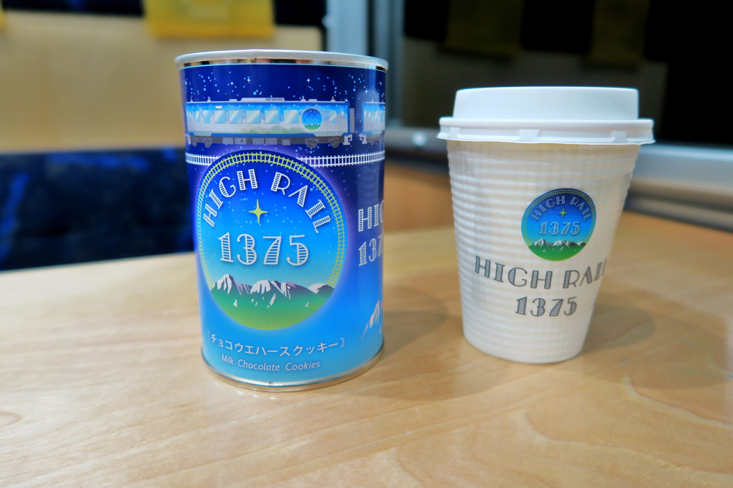 1号車先頭の物販カウンターでは、沿線のお土産やHIGH RAILオリジナル缶入りチョコサンドクッキーにコーヒー、またクッション、キーホルダーといった「HIGH RAIL 1375」オリジナルグッズなどが販売されています。
