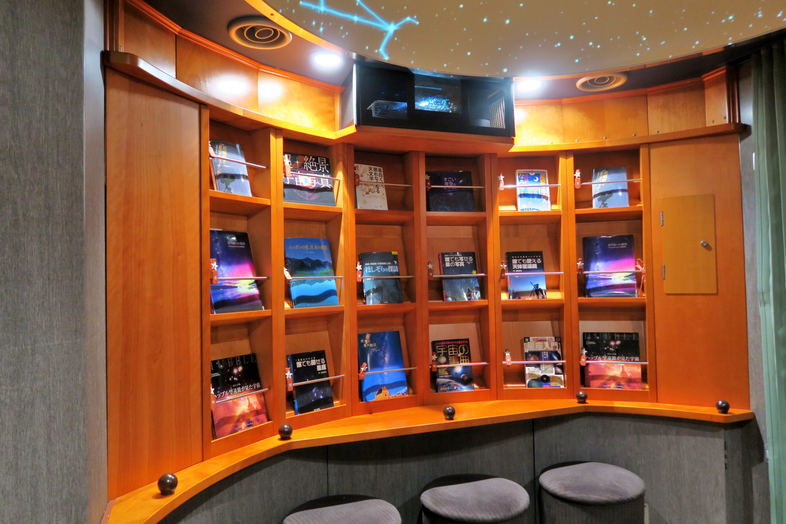 2号車の先頭には、星空の映像を楽しめるスペース「ギャラリーHIGH RAIL」が用意されています。天体や宇宙に関係する書籍が展示され、誰もが自由に閲覧できますよ。そして天井は半球体形のドーム型になっていて、季節の星空映像が投影されています。星を眺め、本を読みつつ、まったりとした時間が過ごせます。