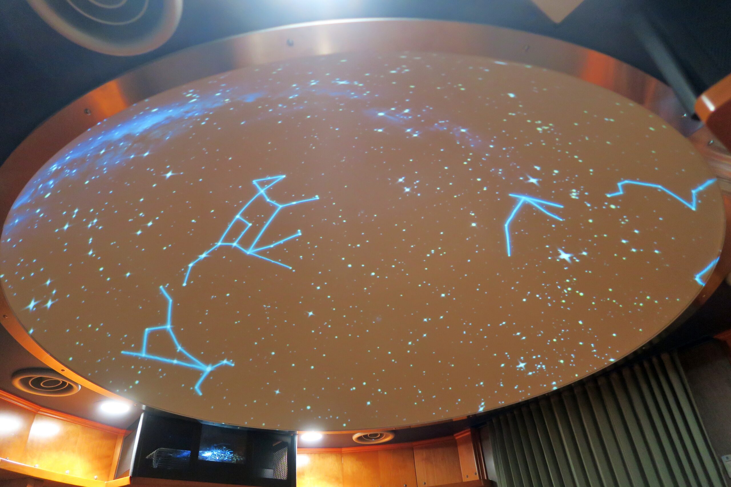 「HIGH RAIL 星空」では、野辺山駅での星空観察会をより楽しむための星空上映会を、2号車にある「ギャラリーHIGH RAIL」のカーテンで仕切られた空間で行っています。プラネタリウムに映しだされた季節の星座を星空案内人がレクチャーしてくれますので、良く聞いて役立てましょう。ド-ムに星座が投影されると、列車のなかとは思えない幻想的な雰囲気の包まれます。
