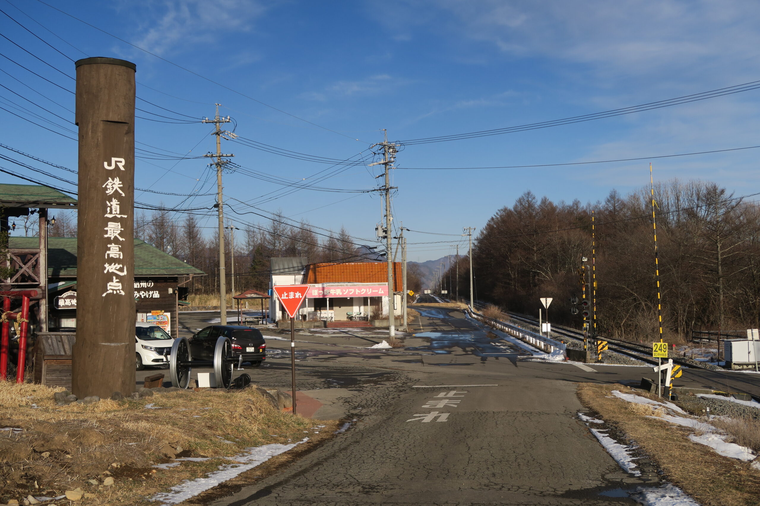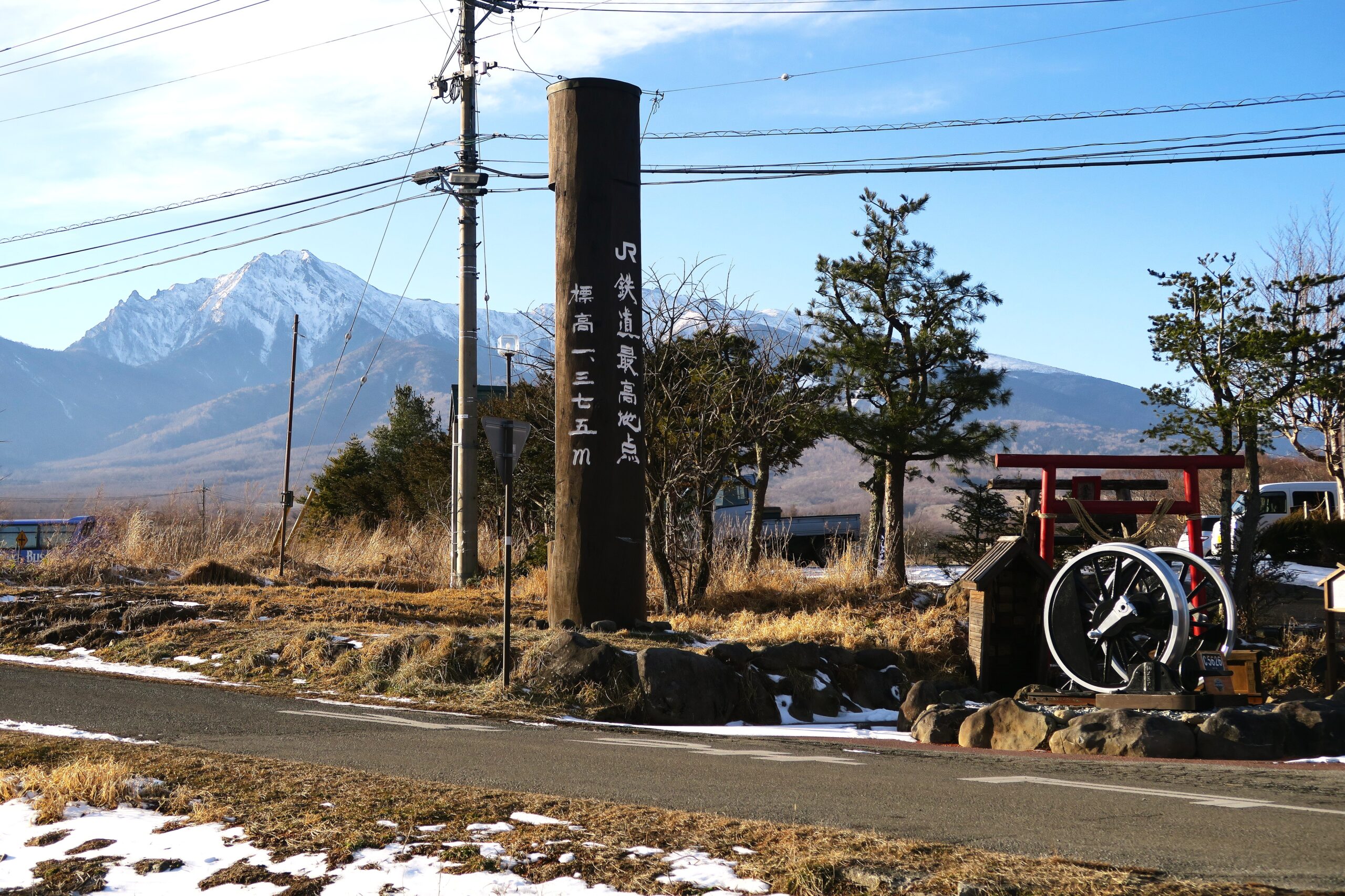 清里駅を出た列車は33‰の勾配をひたすら登る。清里から野辺山までの一区間だけ車窓を楽しむツアーのあるぐらい目は車窓にくぎ付けです。まず姿を現したのは右手の山々。青い山並みが幾重にも連なって現れます。山が手前の木々にかき消されると、列車は右手へと回り込み、木立やせせらぎを越え、くねくねと山の中を走っていきます。そして列車は、県境を越えて長野県に入ったところでHIGH RAIL1375の数字の由来になっている茶色の標柱に差し掛かる。書かれているのは、「JR鉄道最高地 標高1375m」。第3甲州街道踏切脇の標柱を抜けると一気に視界が開け、空が近い。